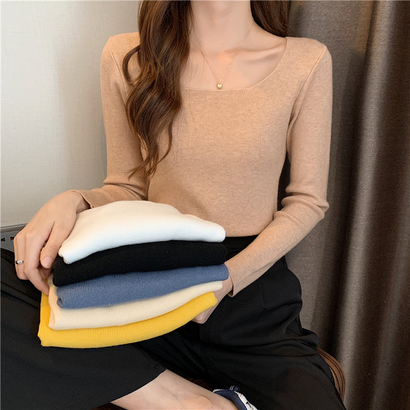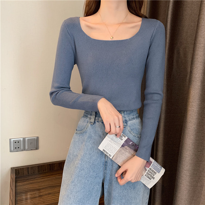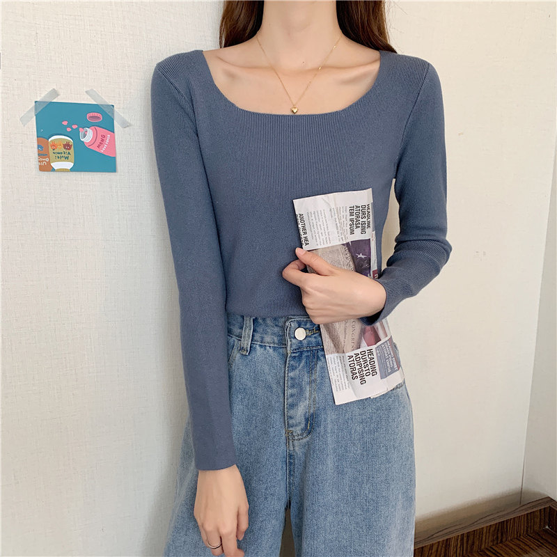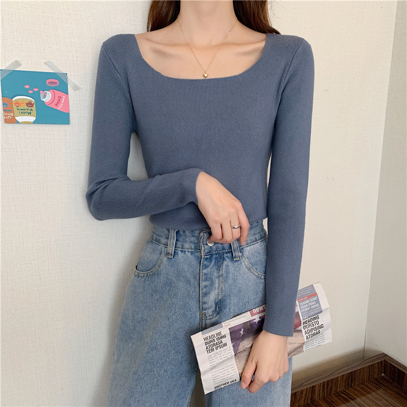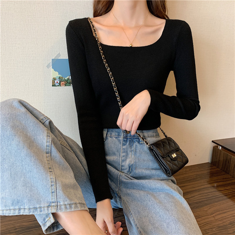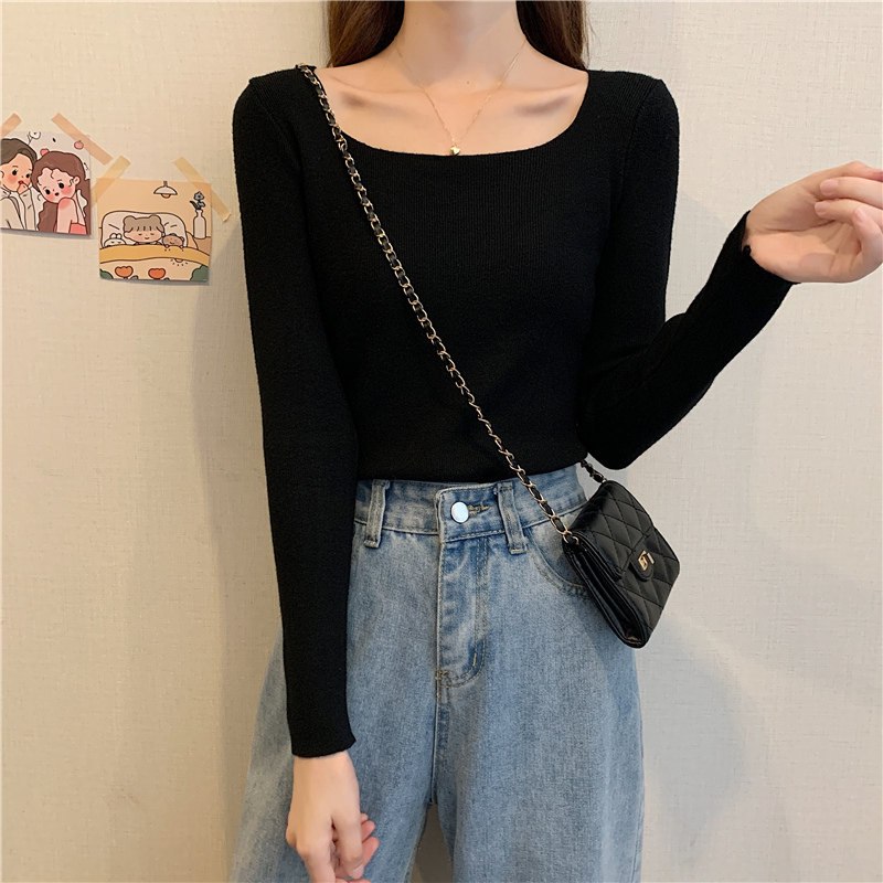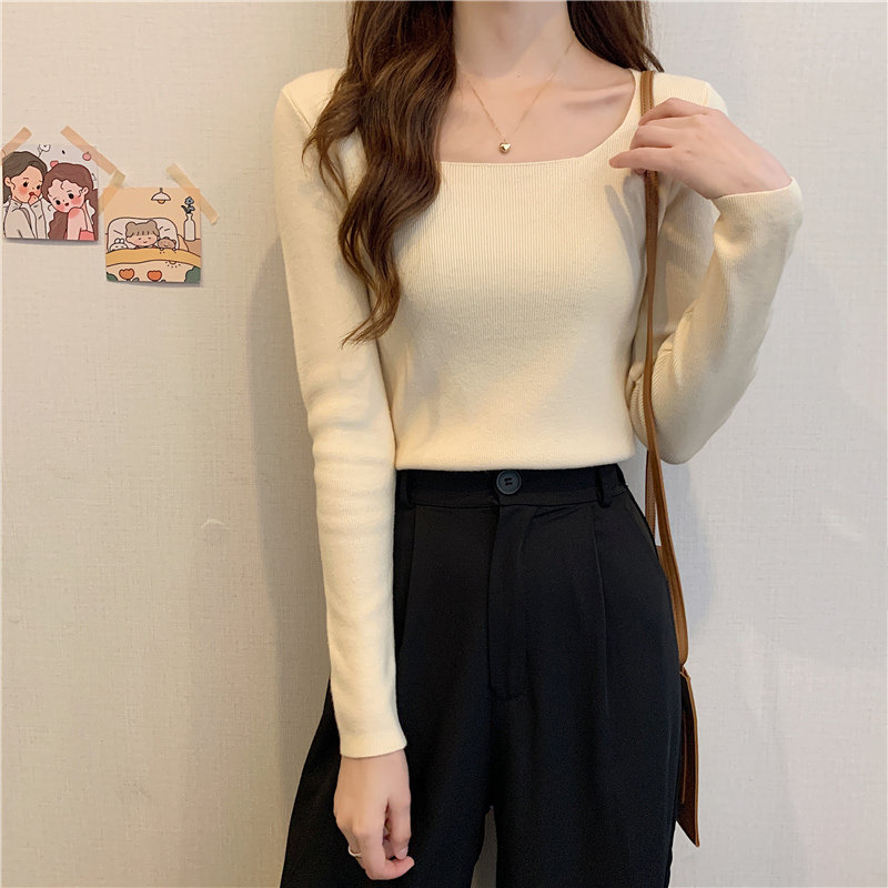 Демисезонный приталенный лонгслив, трикотажный свитер, квадратный вырез, в западном стиле, французский стиль