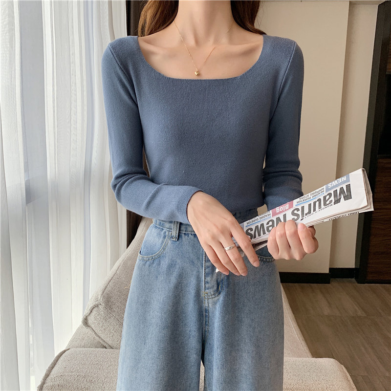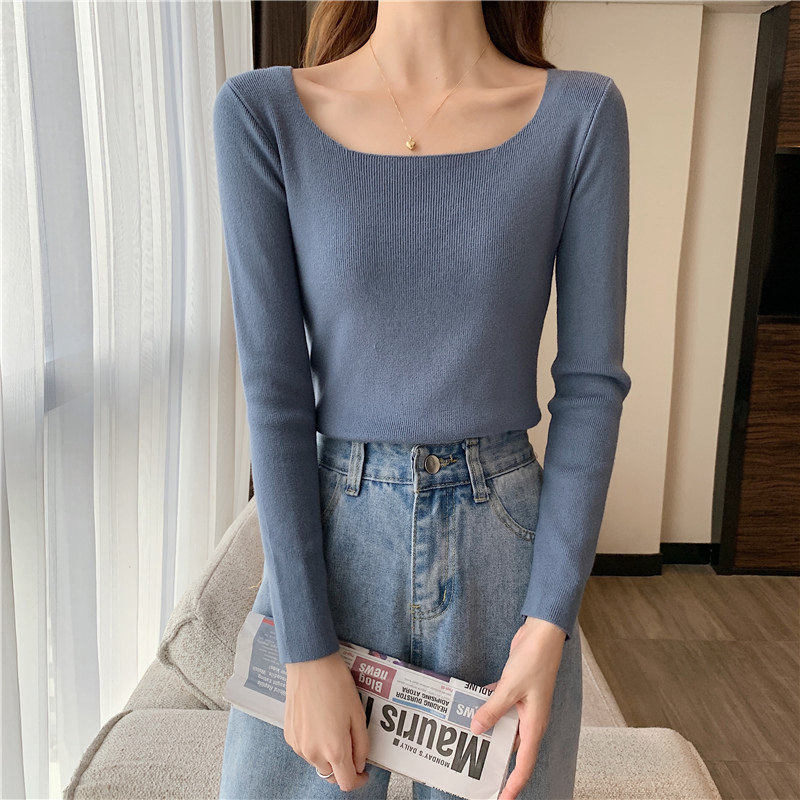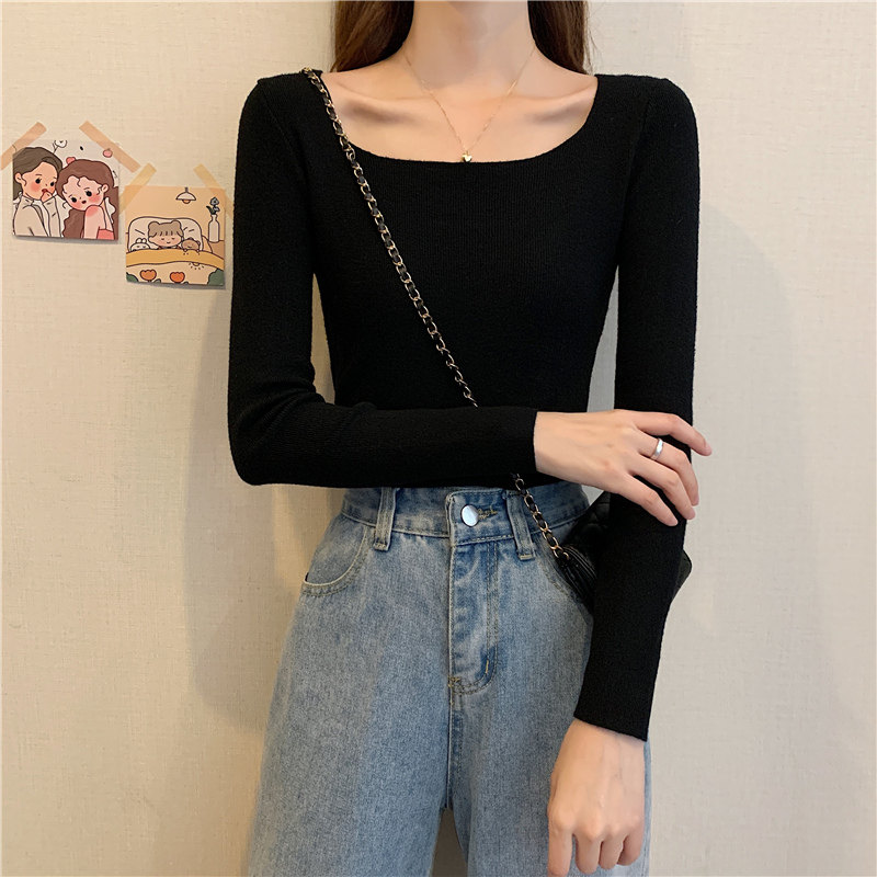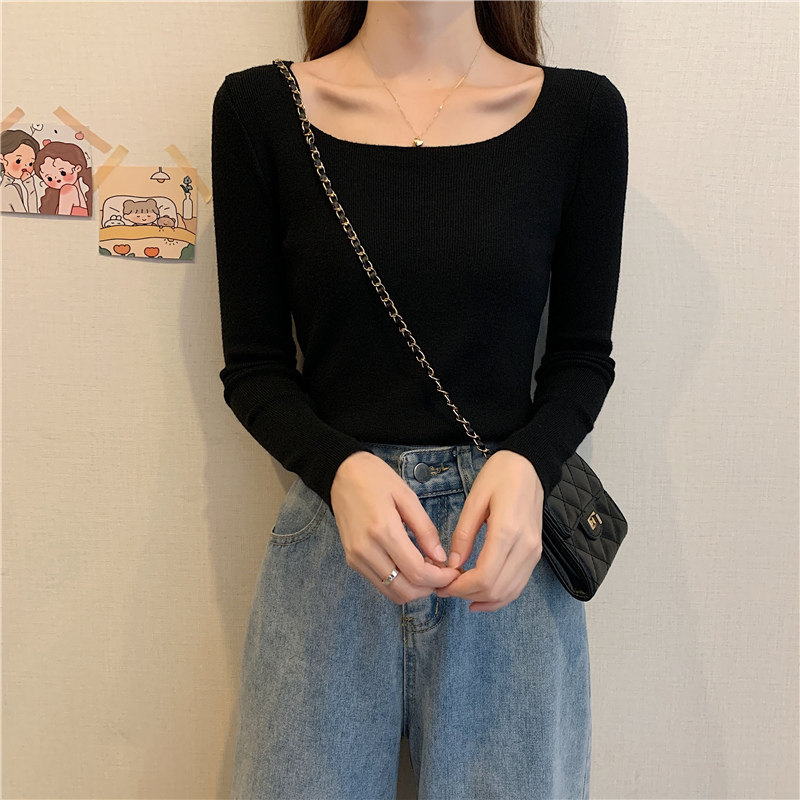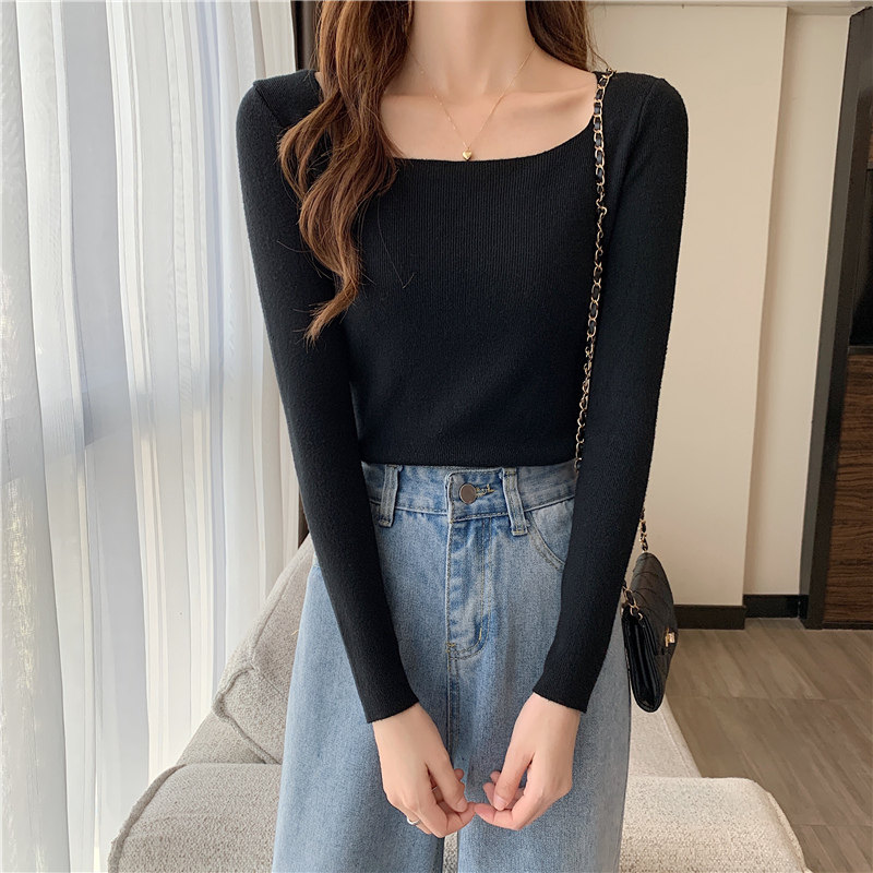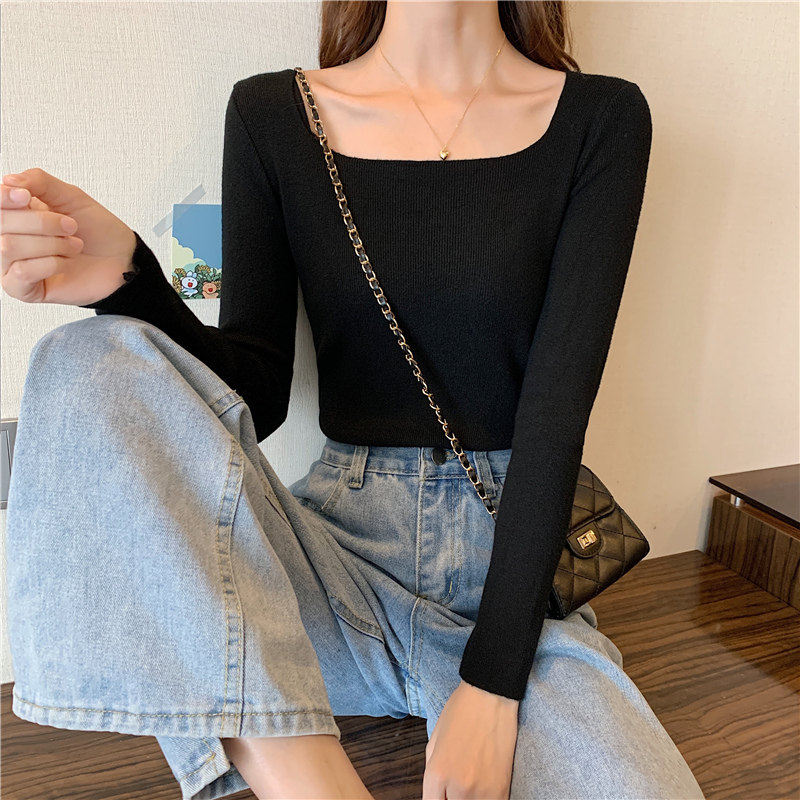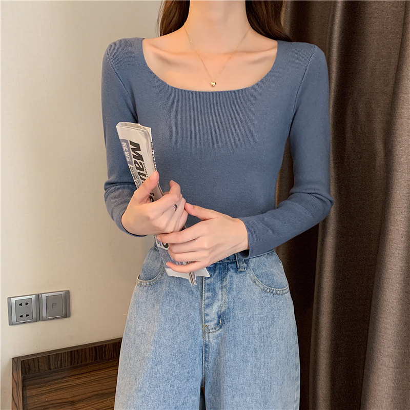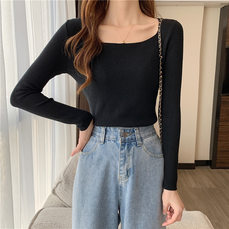 Демисезонный приталенный лонгслив, трикотажный свитер, квадратный вырез, в западном стиле, французский стиль