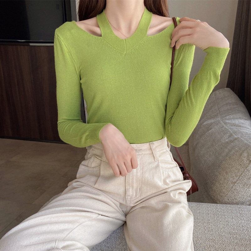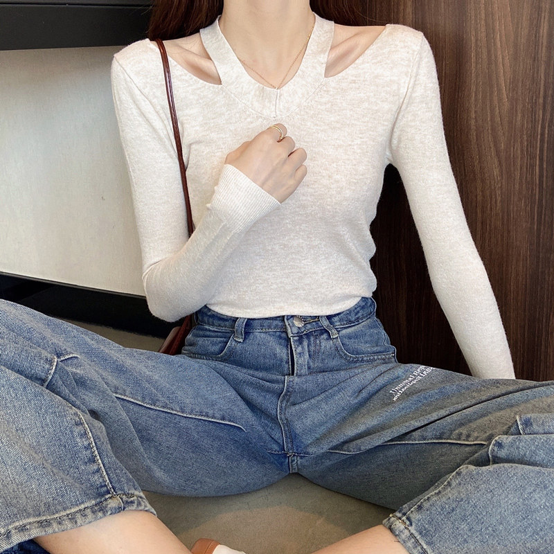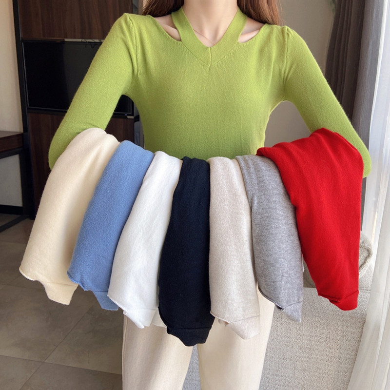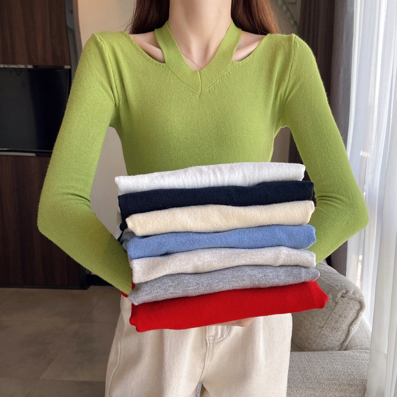 Тонкий осенний свитер, трикотажный лонгслив, V-образный вырез, облегающий крой, в обтяжку, в западном стиле
