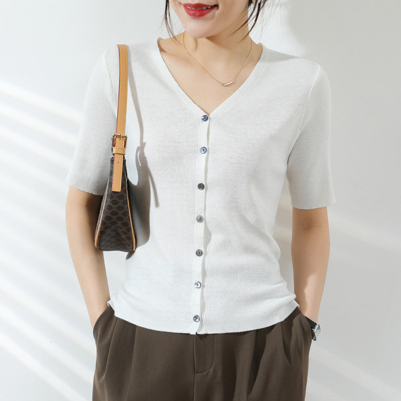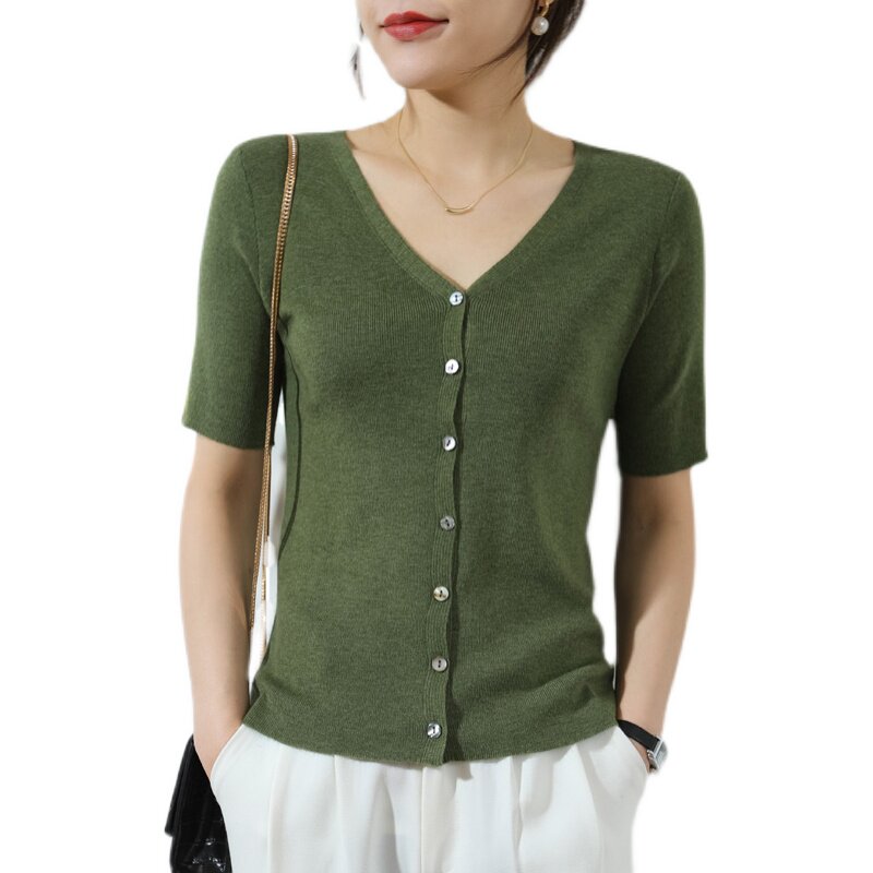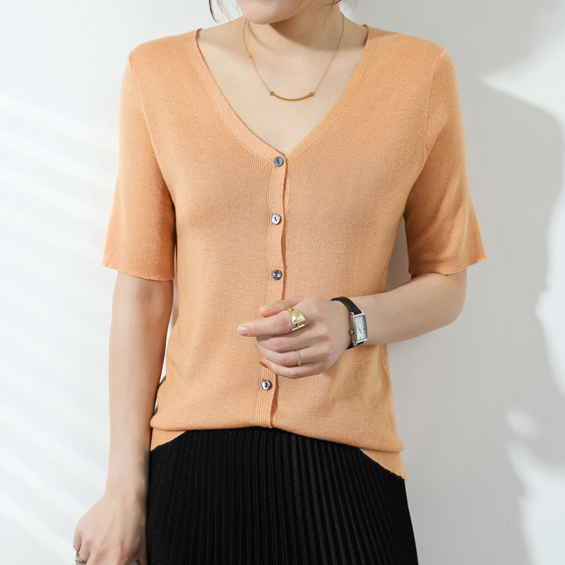 Тонкий кардиган, трикотажный свитер, куртка, коллекция 2021, короткий рукав, V-образный вырез, в корейском стиле