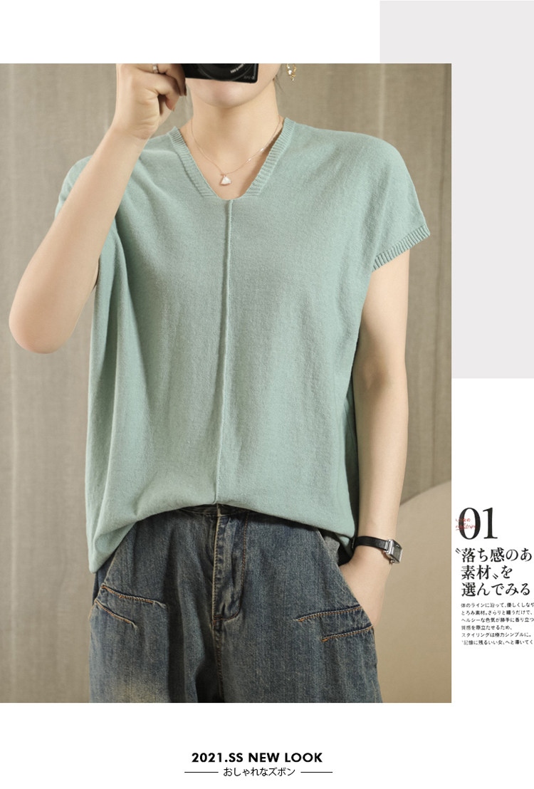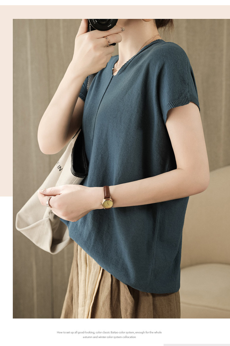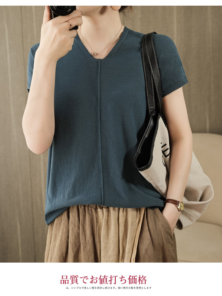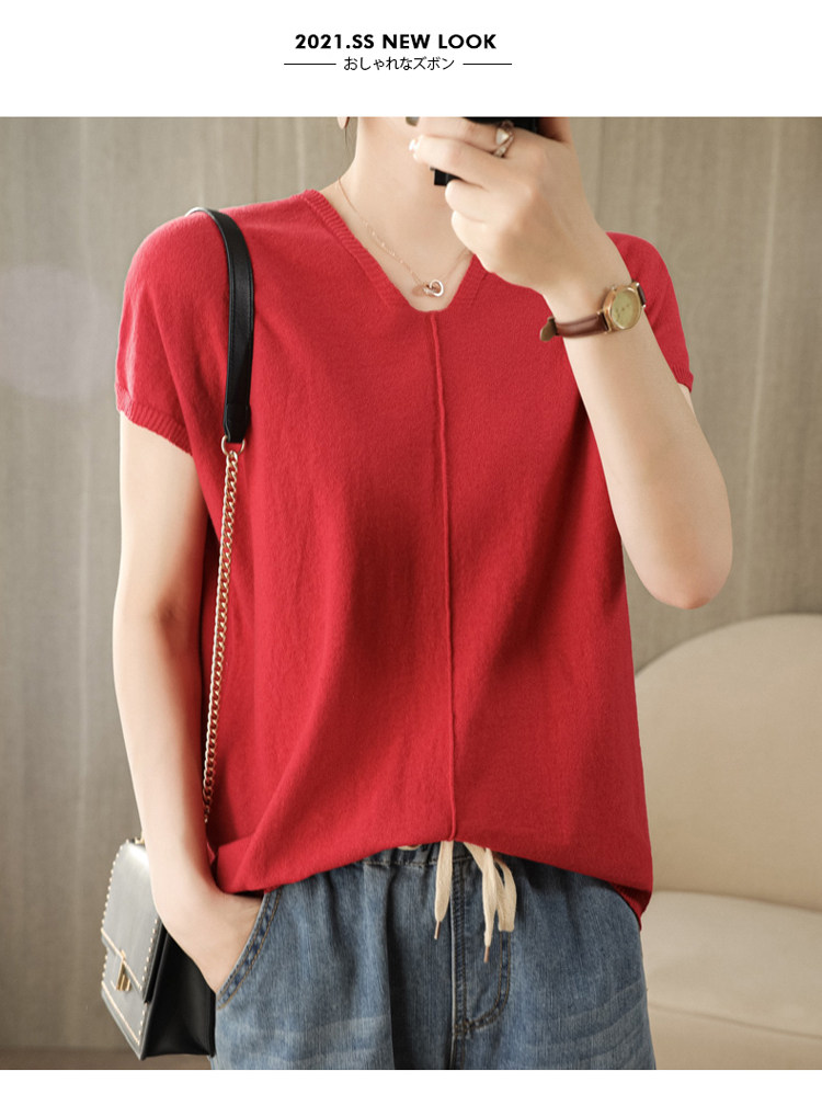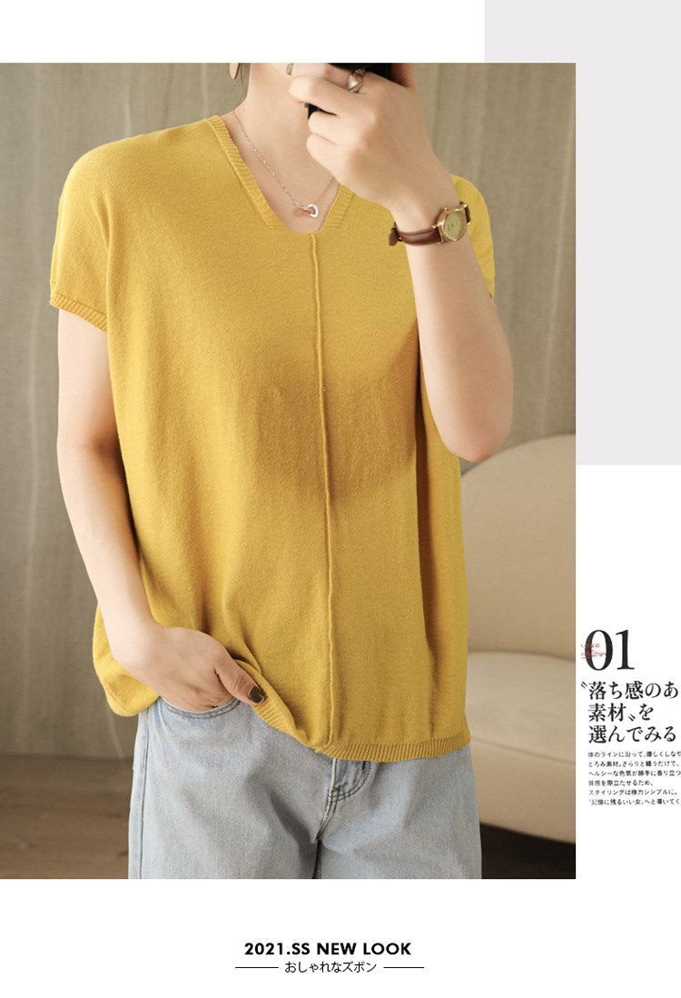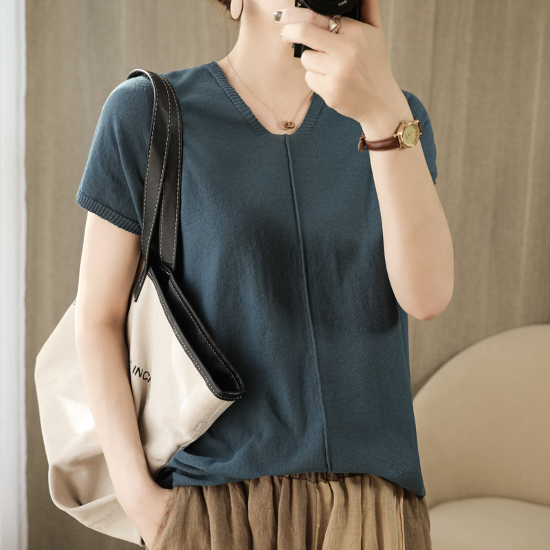 Трикотажная футболка, коллекция 2021, из хлопка и льна, короткий рукав, V-образный вырез, оверсайз