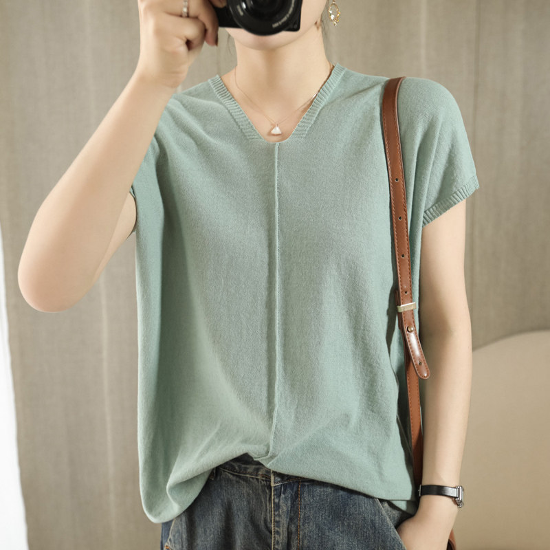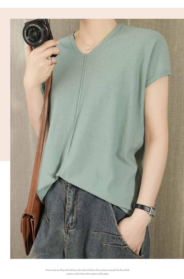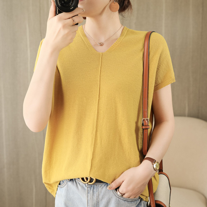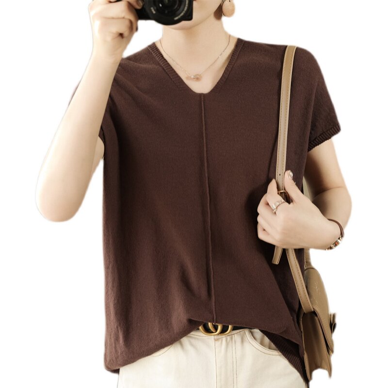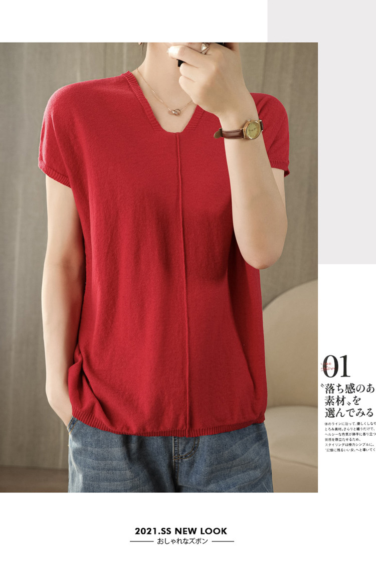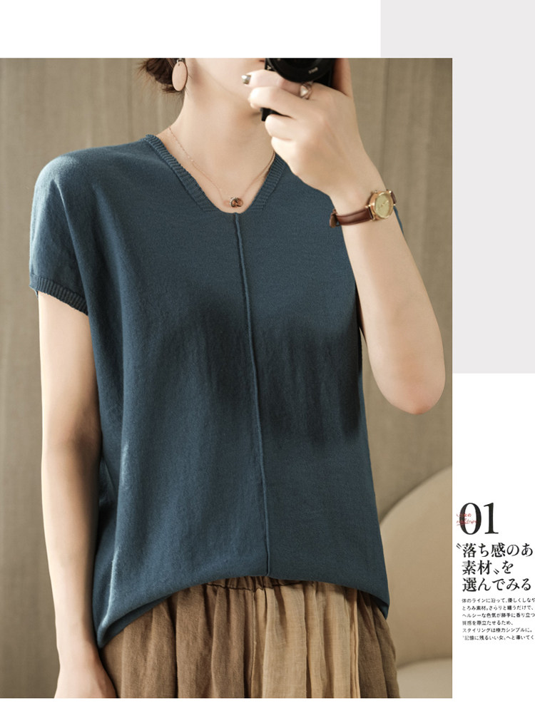 Трикотажная футболка, коллекция 2021, из хлопка и льна, короткий рукав, V-образный вырез, оверсайз
