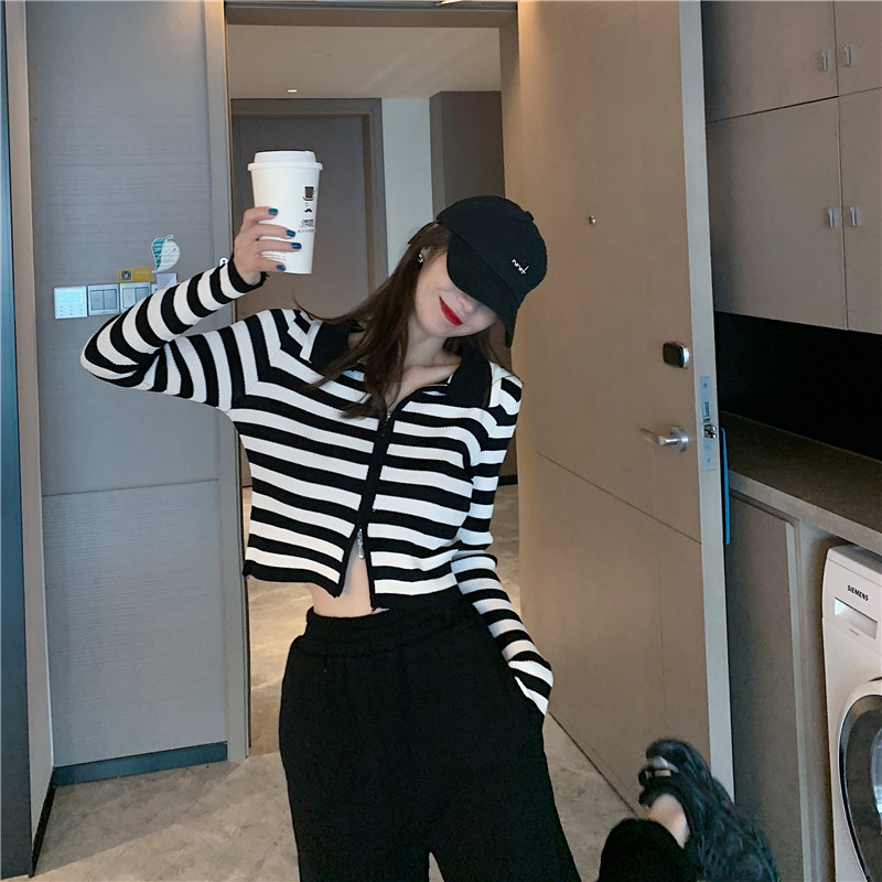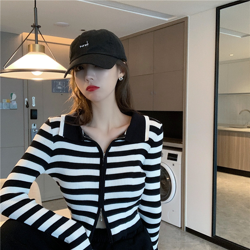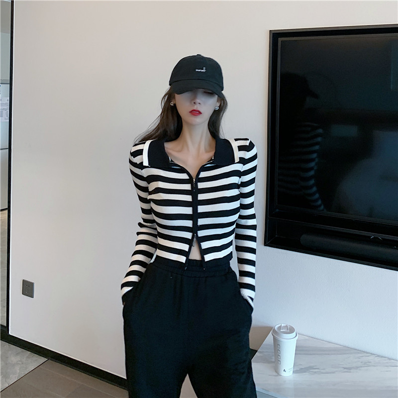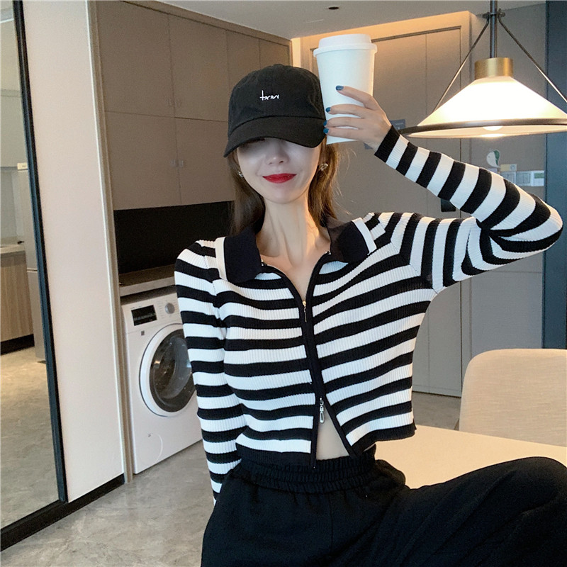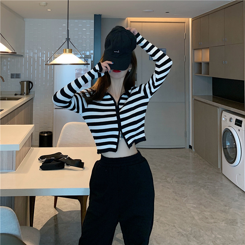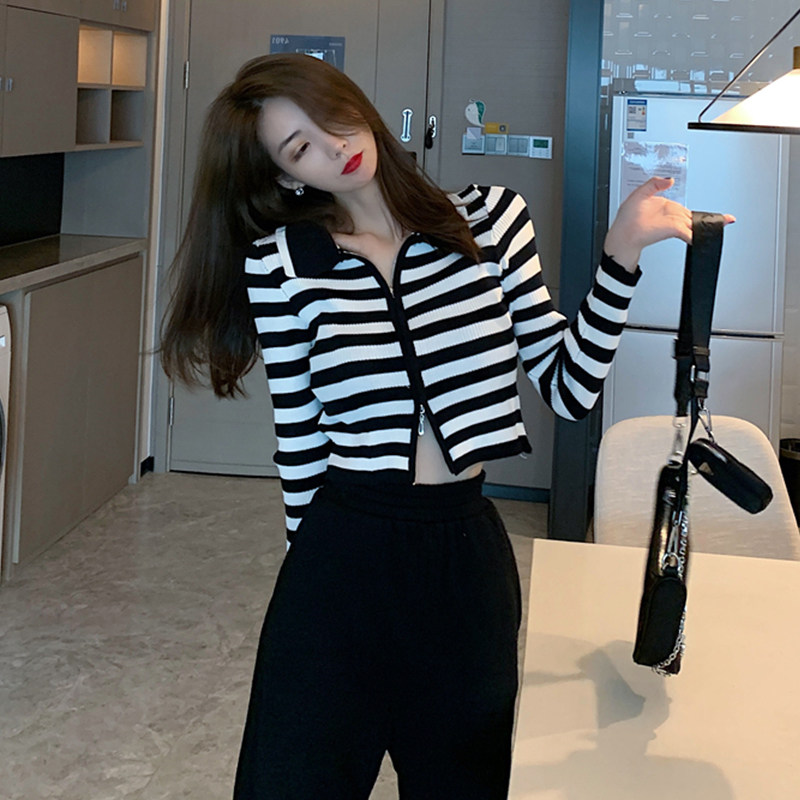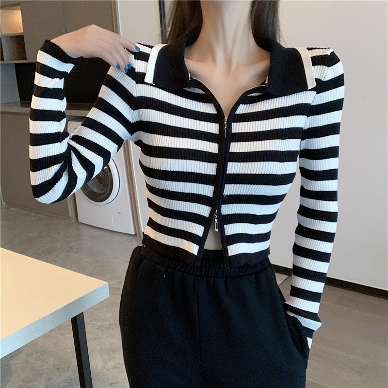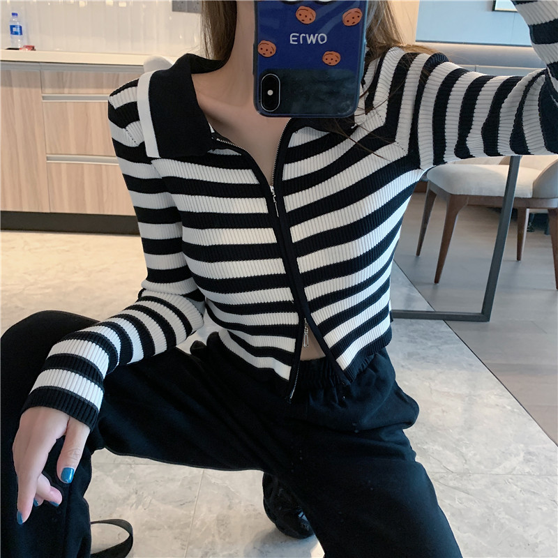 Трикотажный осенний модный короткий кардиган с молнией, облегающий крой, в западном стиле