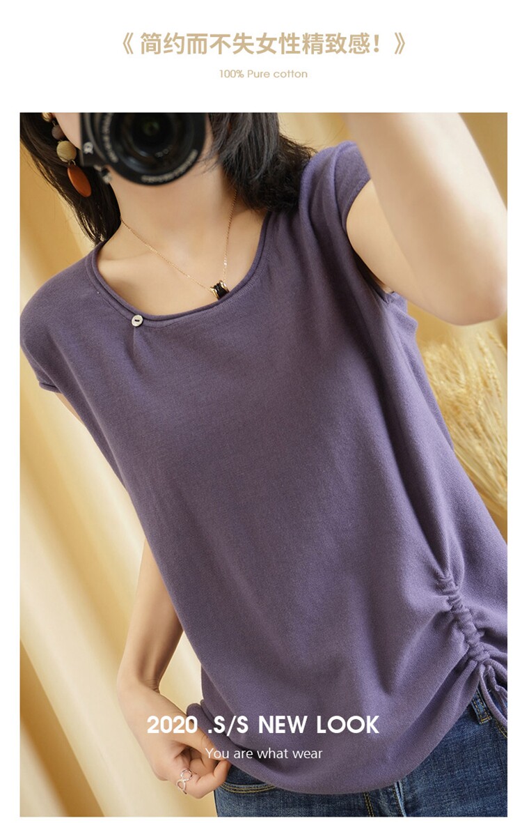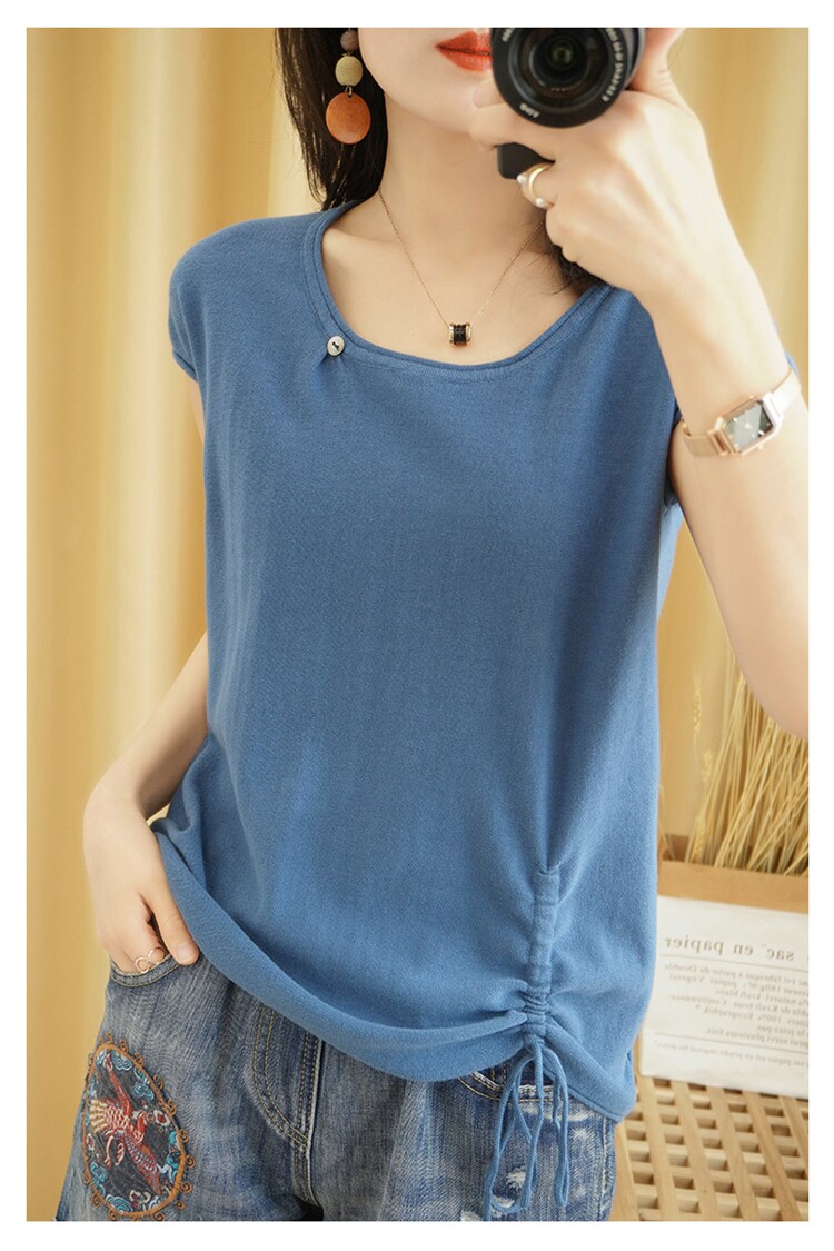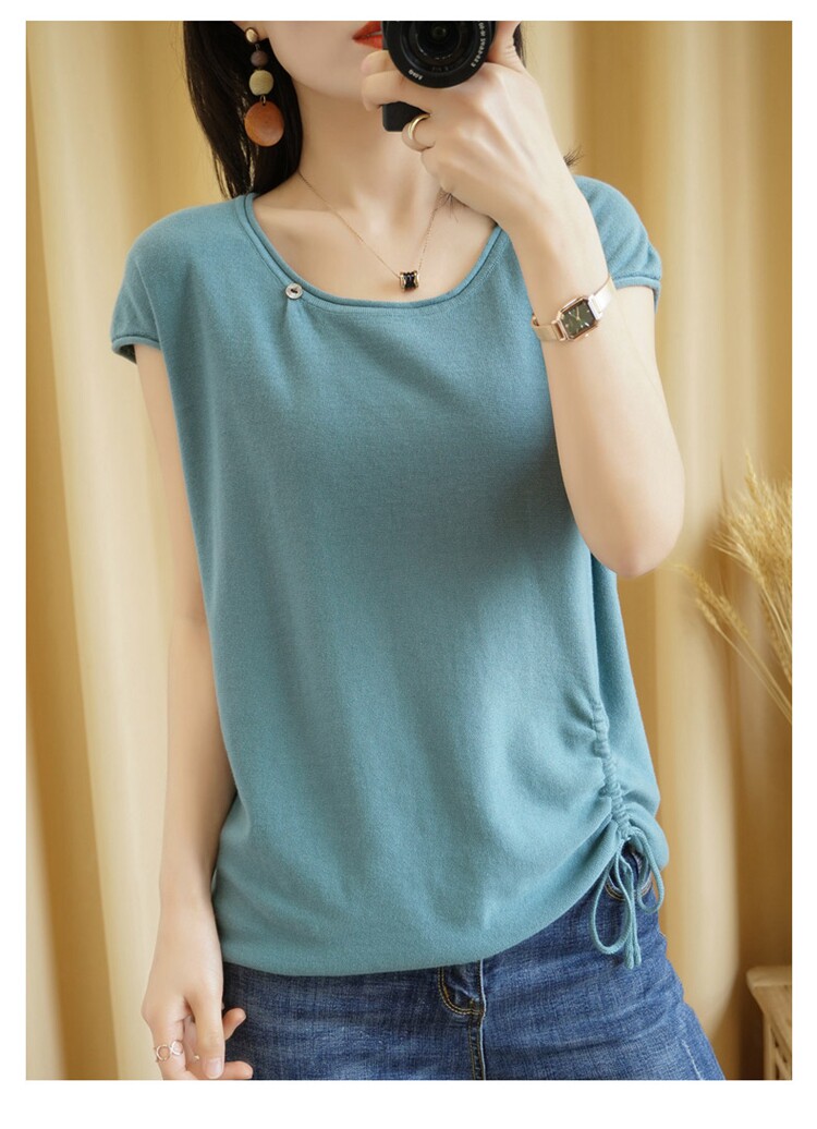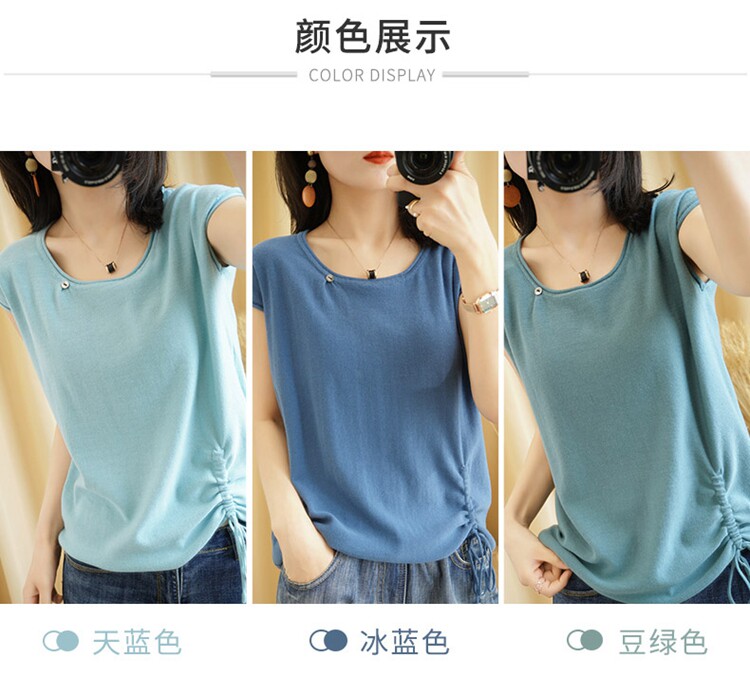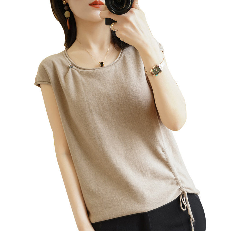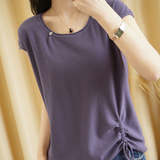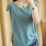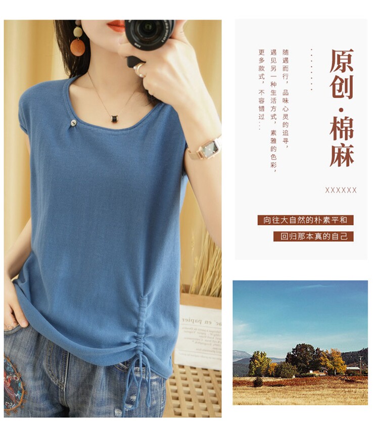 Трикотажная хлопковая летняя одежда с круглым воротником, тонкая футболка, короткий рукав, из хлопка и льна, оверсайз, на шнурках