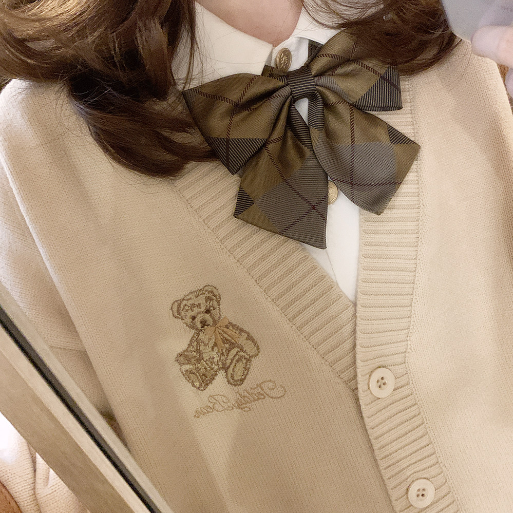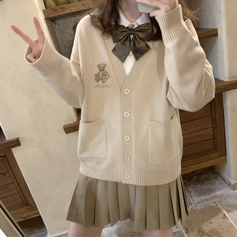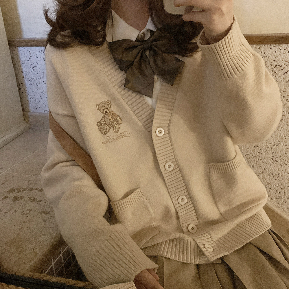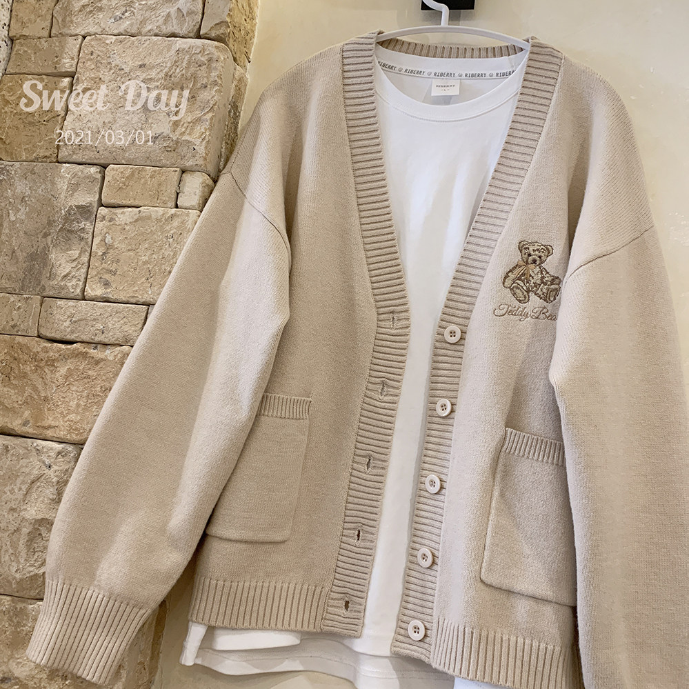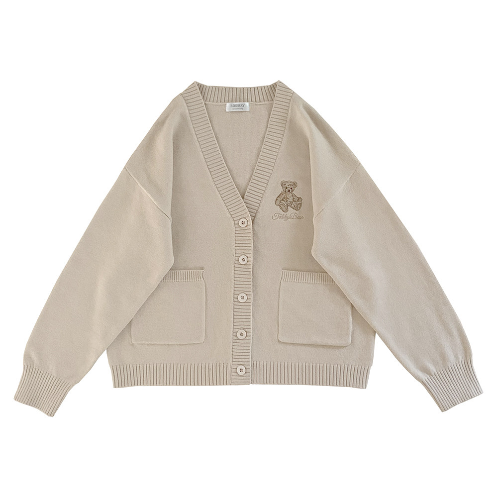 Ретро бежевый трикотажный свитер, кардиган, с вышивкой, с медвежатами, свободный крой, V-образный вырез