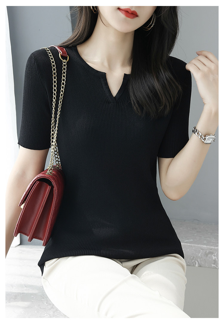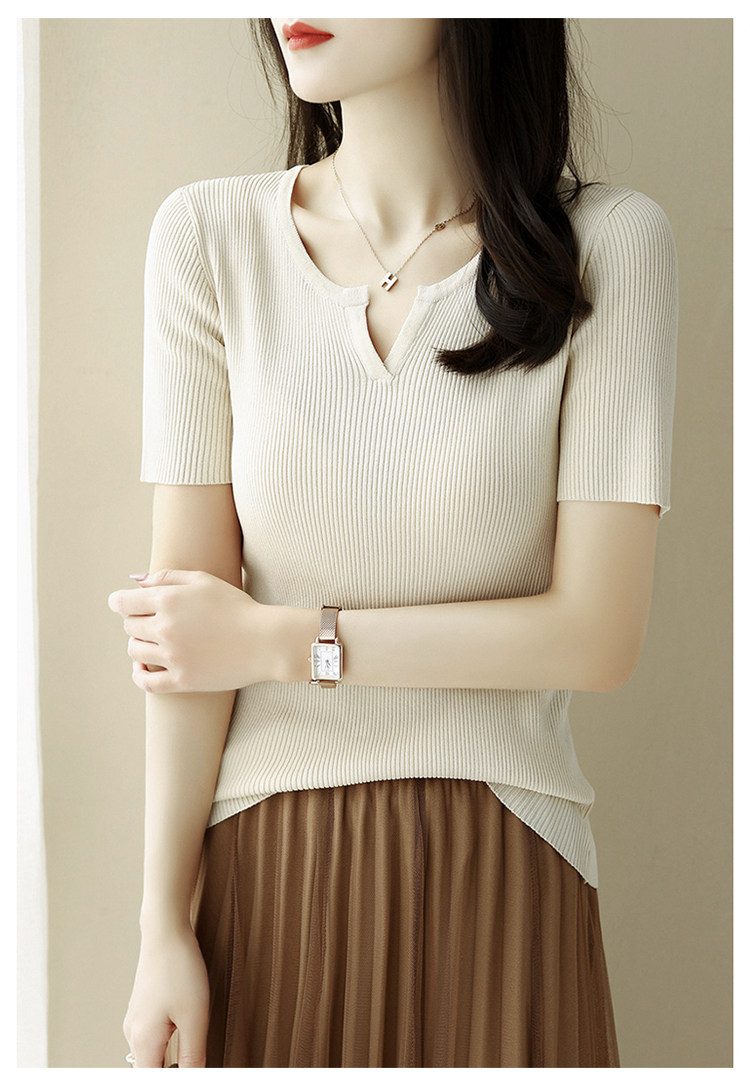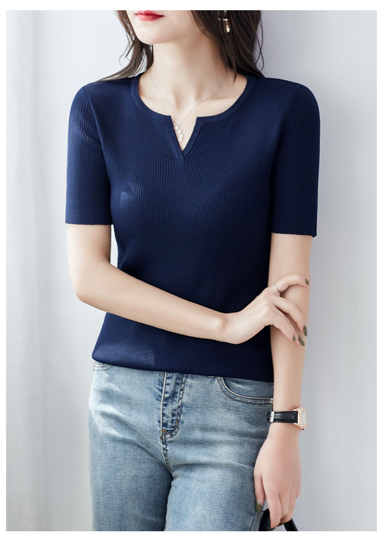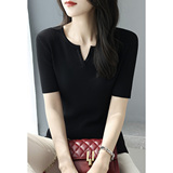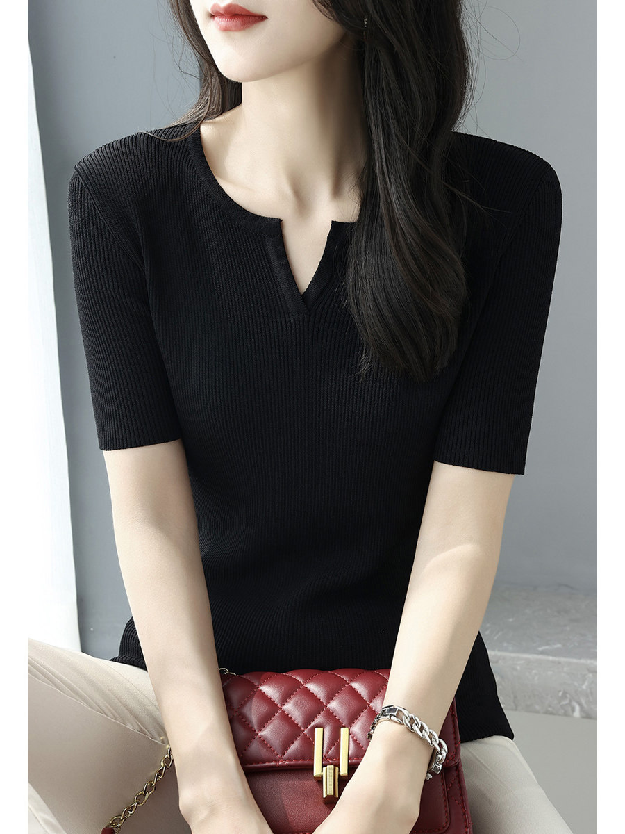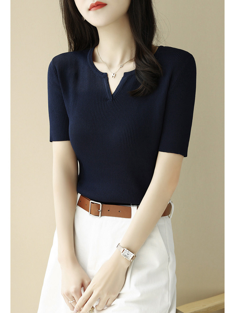 Трикотажная летняя футболка, французский стиль, V-образный вырез