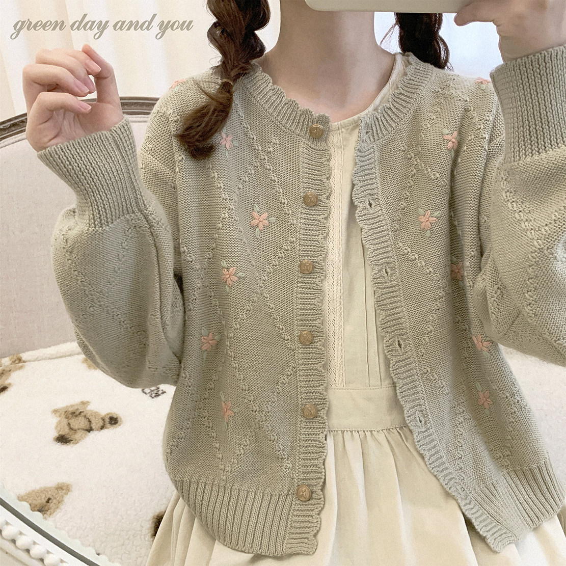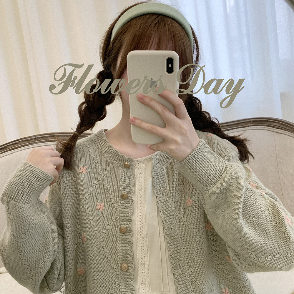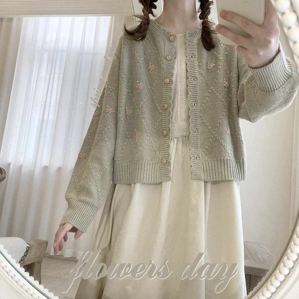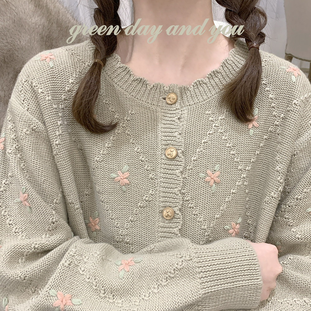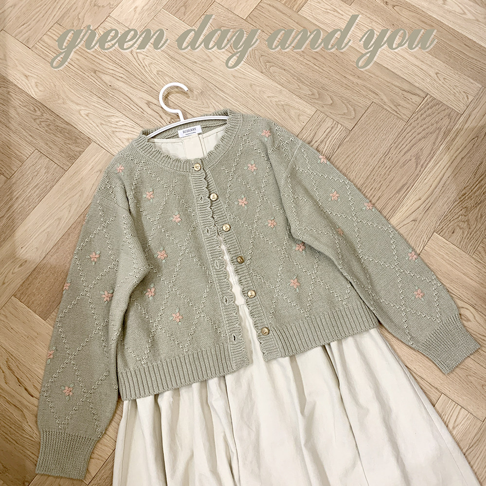 Шерстяной старомодный ретро милый зеленый трикотажный свитер, кардиган, цветочный принт