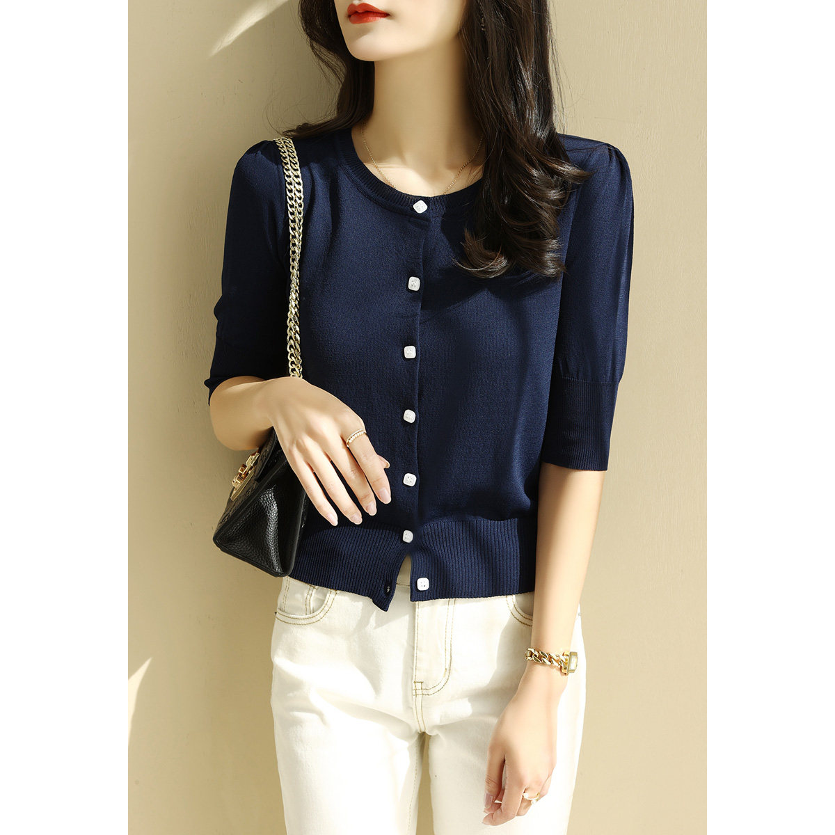 Черный трикотажный летний кардиган с круглым воротником, тонкая футболка, оверсайз