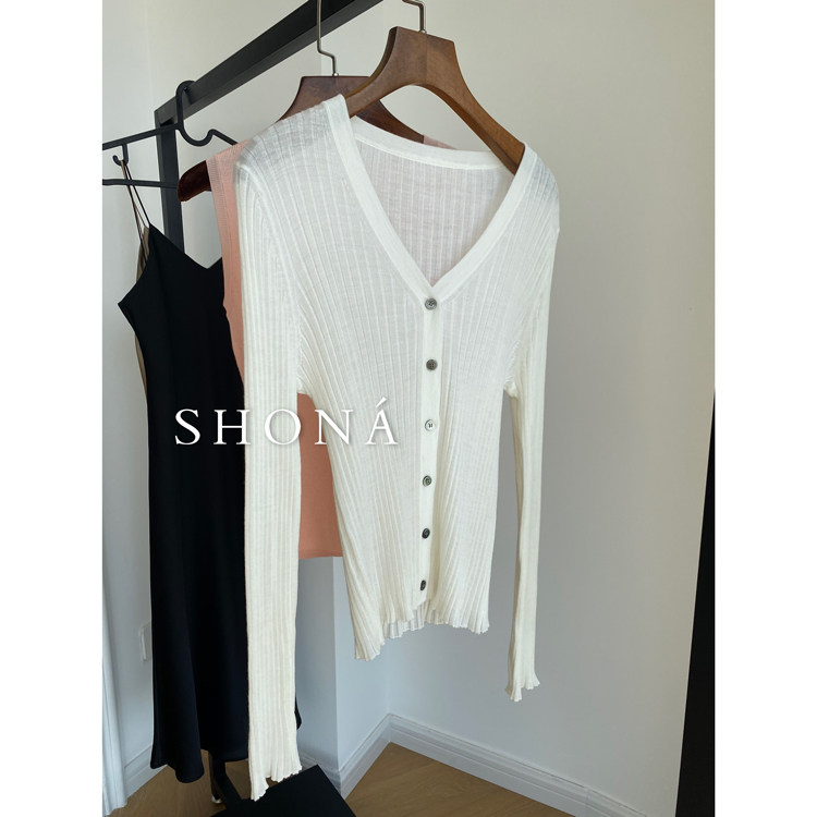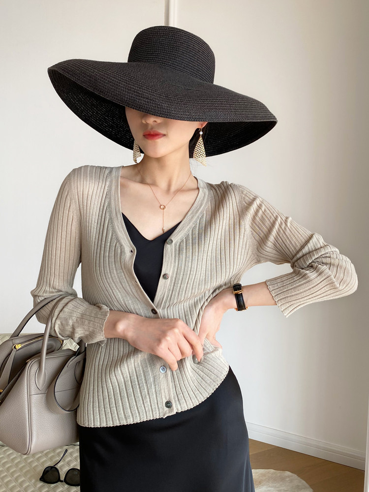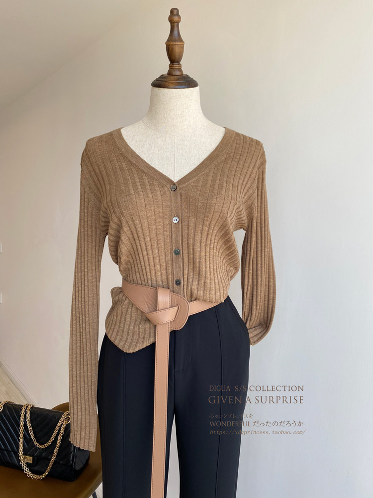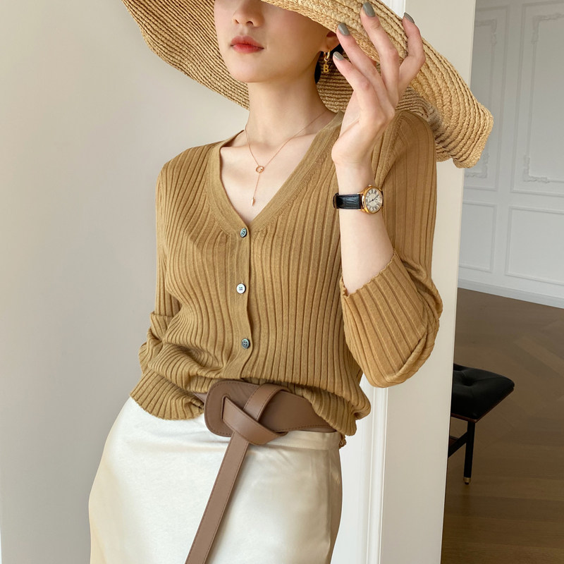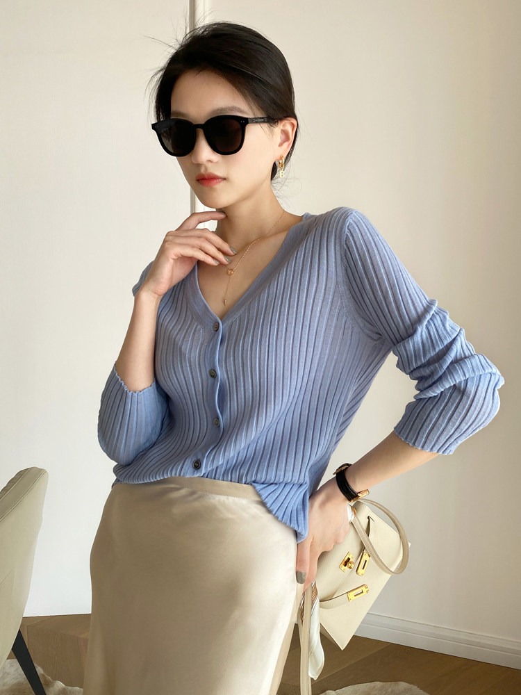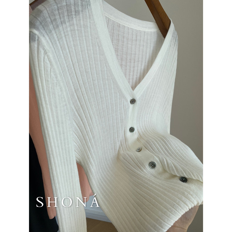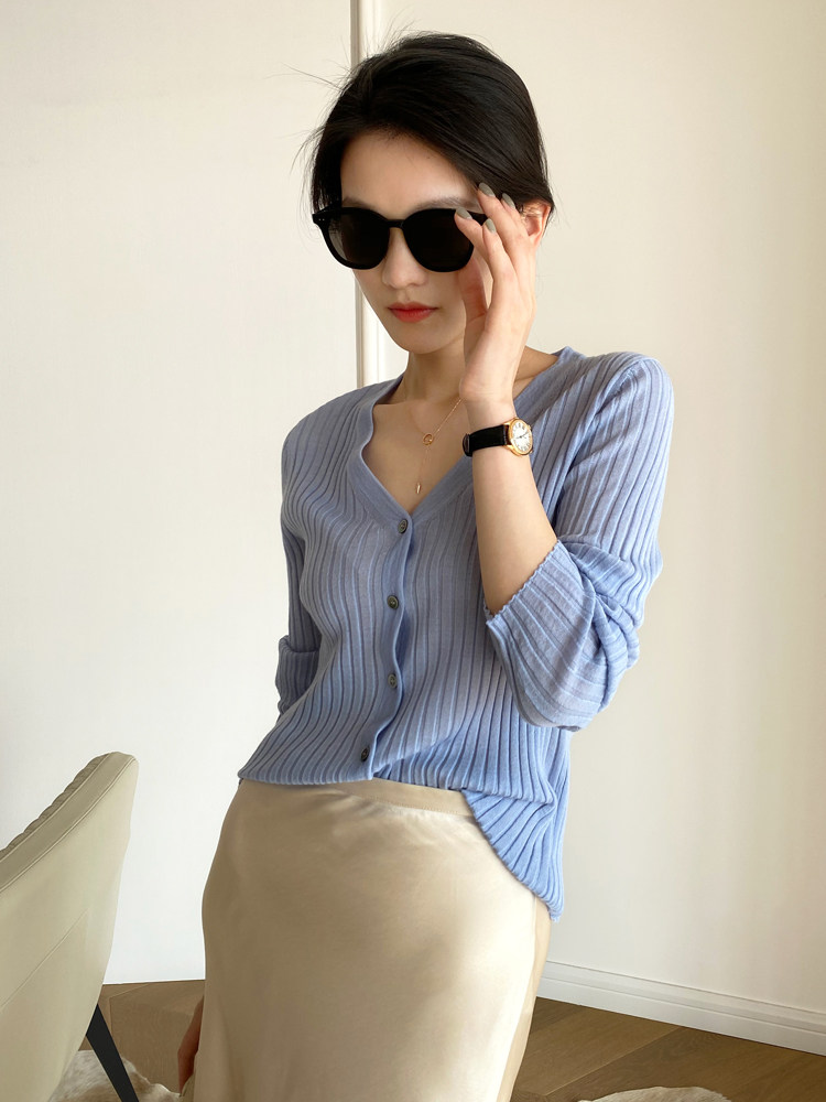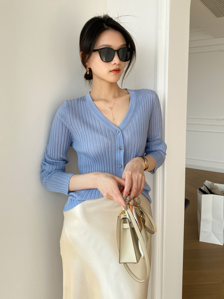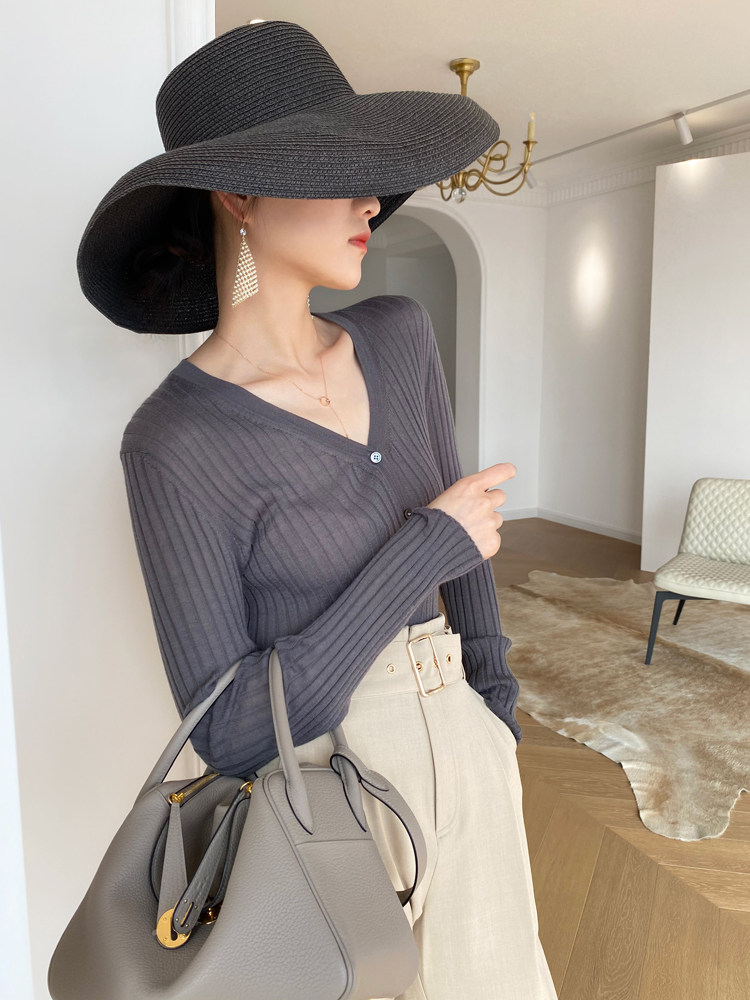 Дыхательный шерстяной импортный качественный летний лонгслив, тонкий кардиган, облегающий крой, V-образный вырез