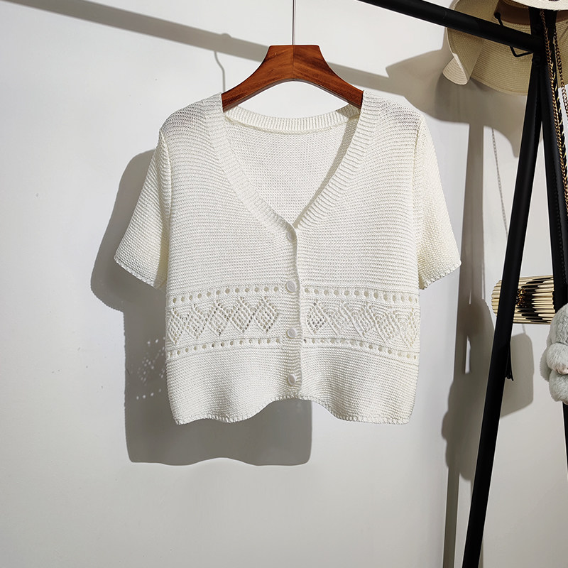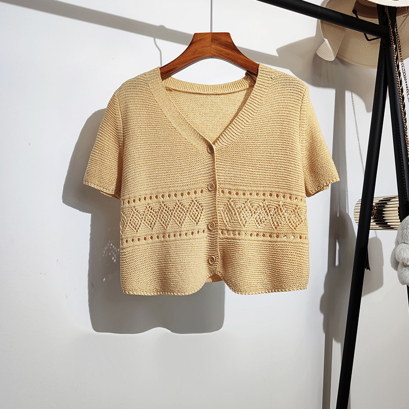 Трикотажный кардиган, короткая подходит с юбкой, короткий рукав, V-образный вырез, высокая талия