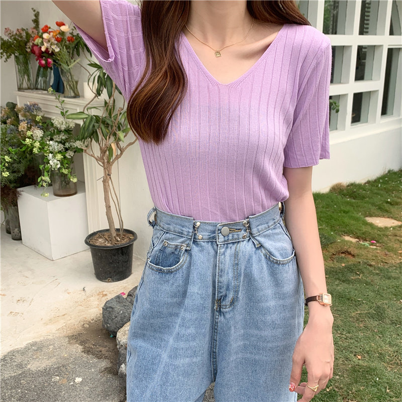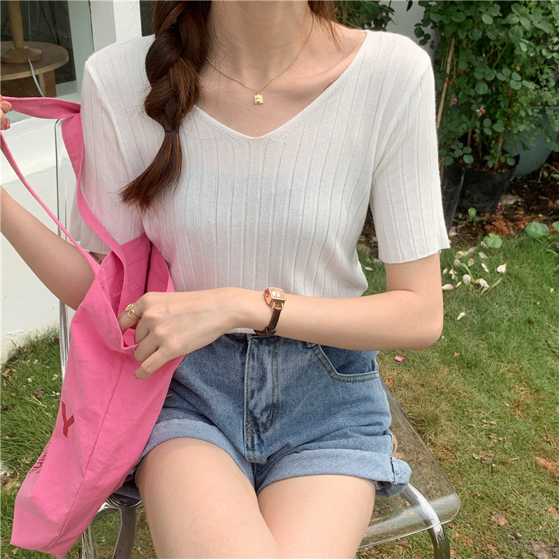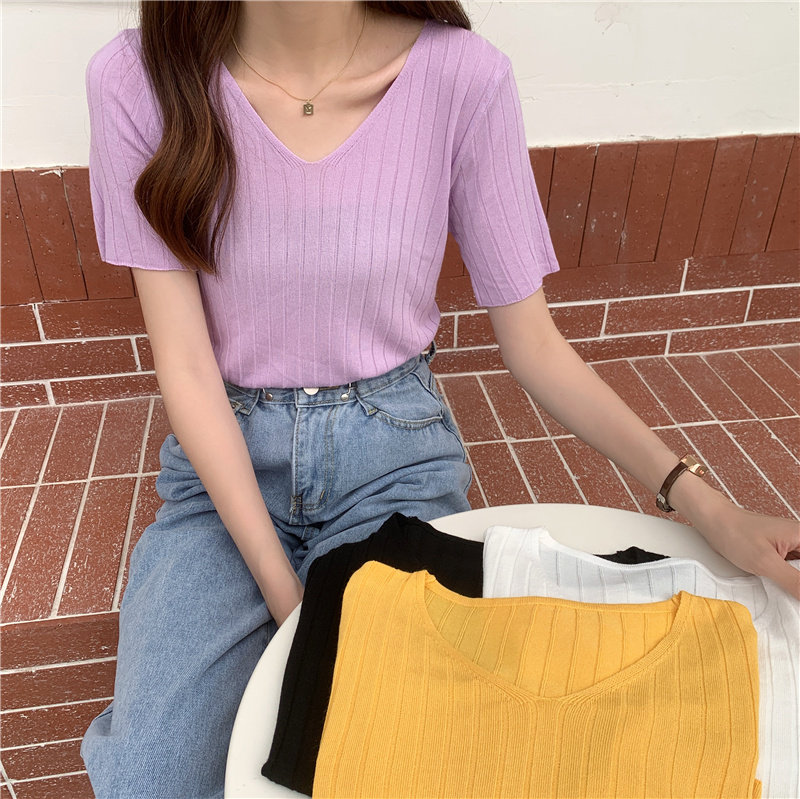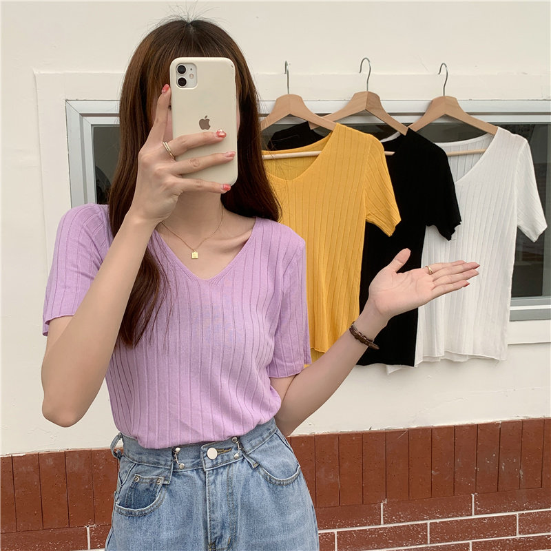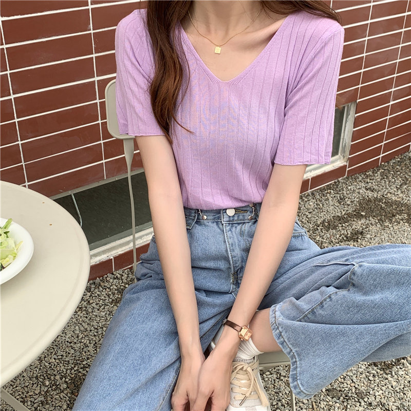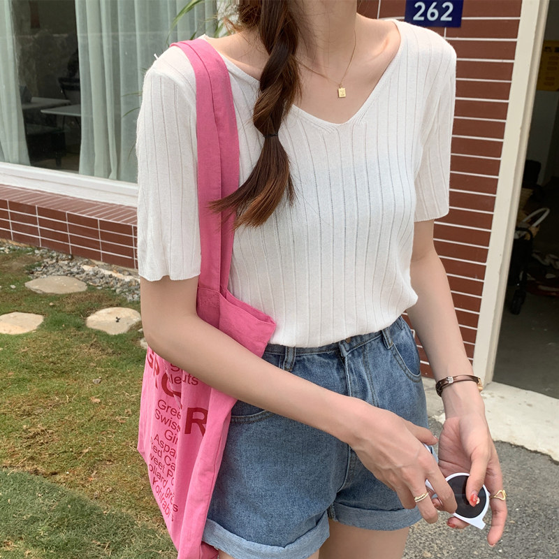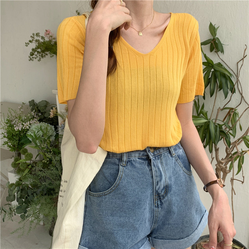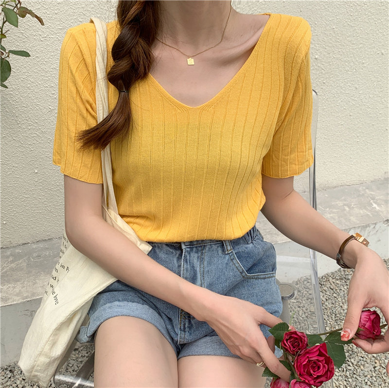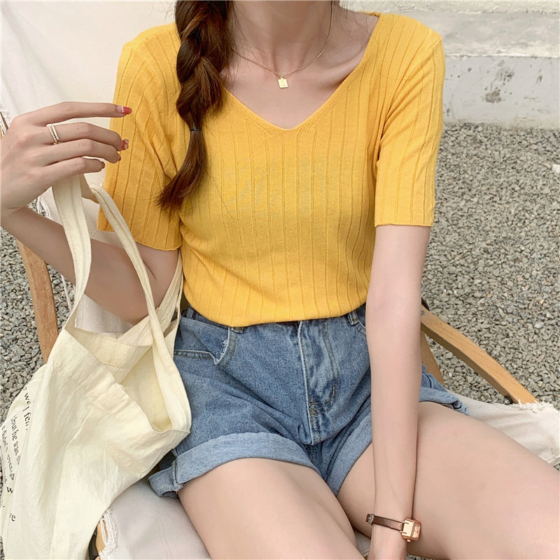 Tide, летний тонкий шелковый трикотажный свитер, футболка с коротким рукавом, коллекция 2021, свободный крой, V-образный вырез