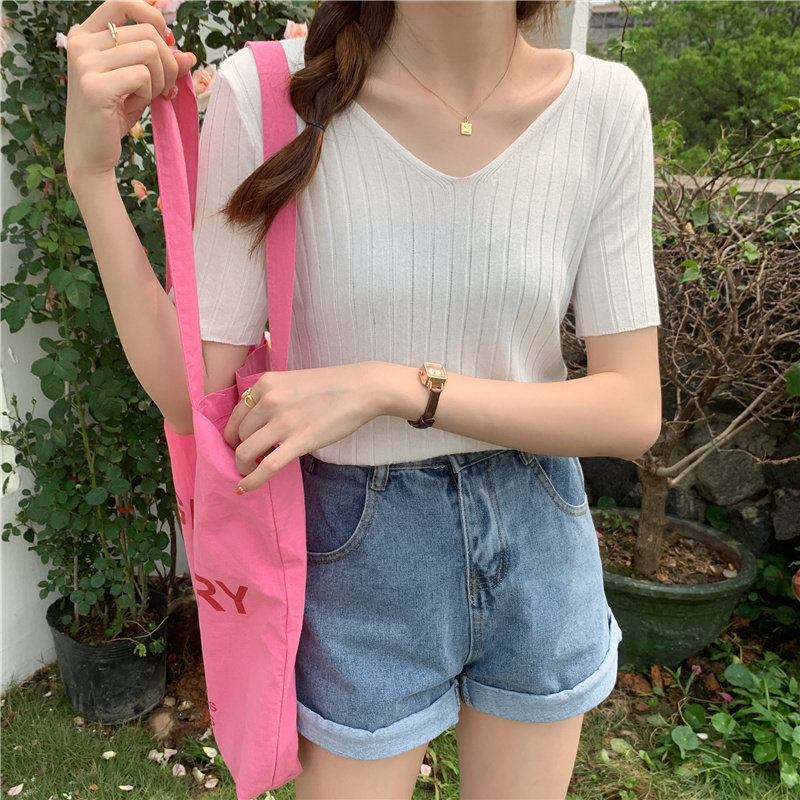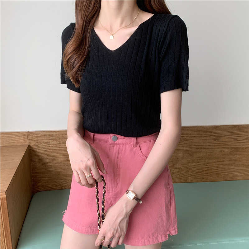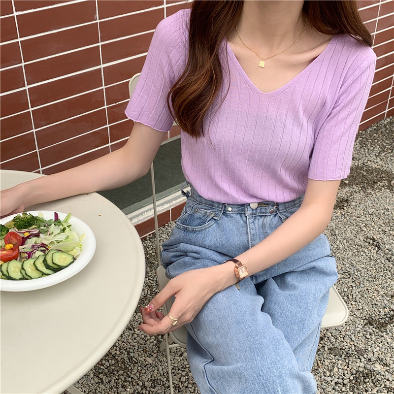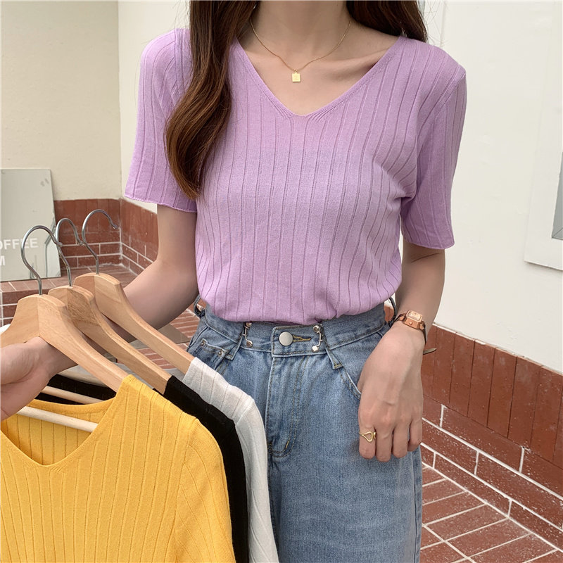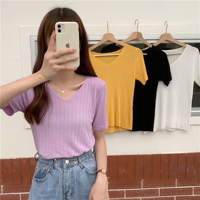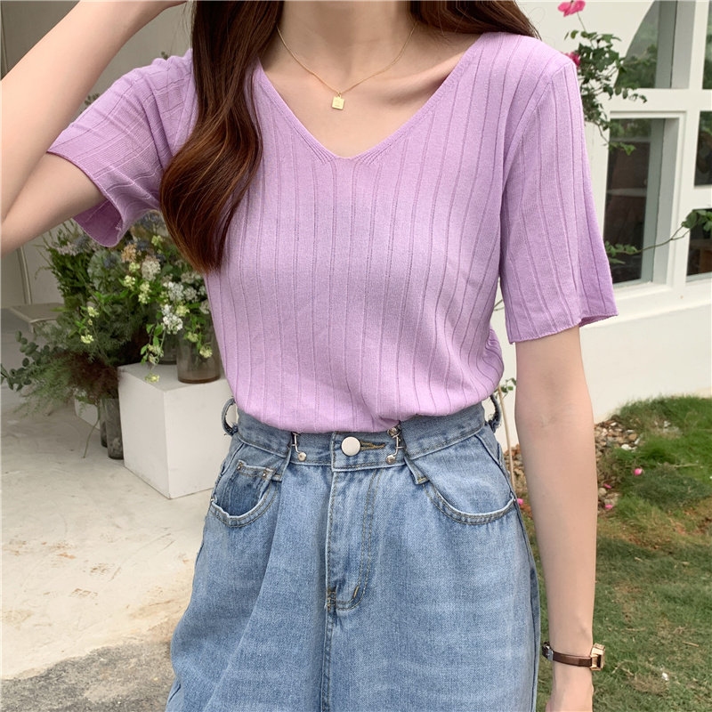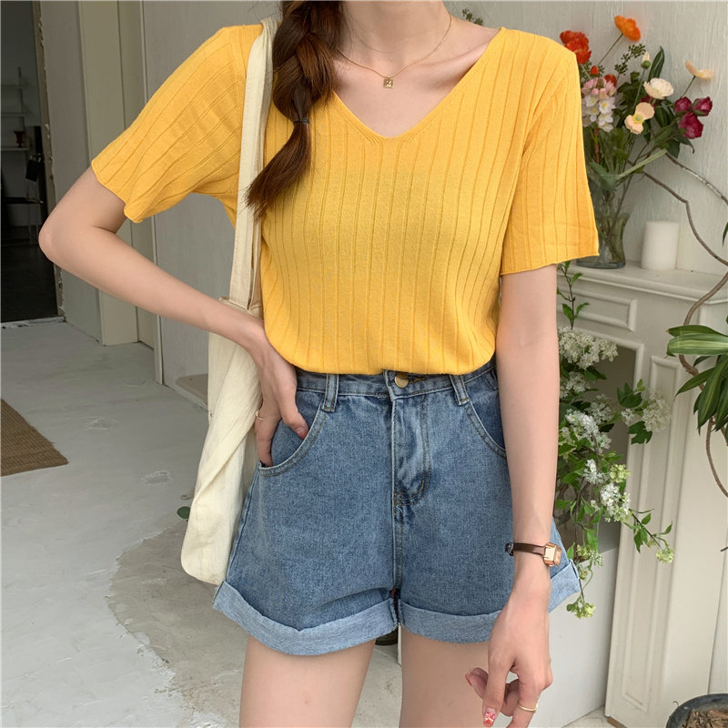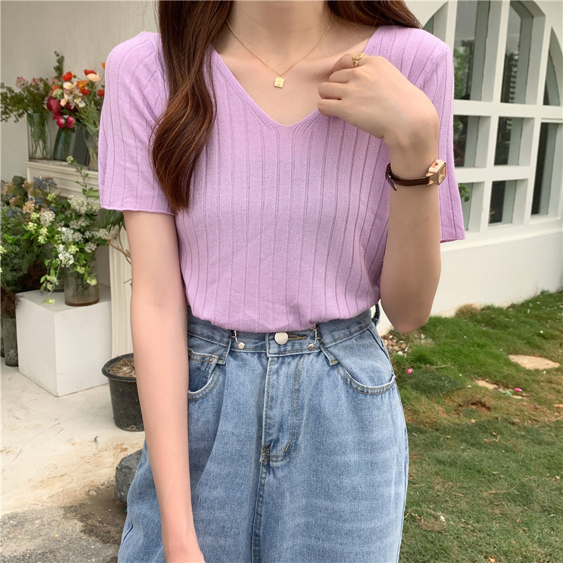 Tide, летний тонкий шелковый трикотажный свитер, футболка с коротким рукавом, коллекция 2021, свободный крой, V-образный вырез
