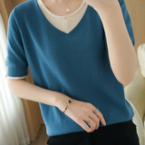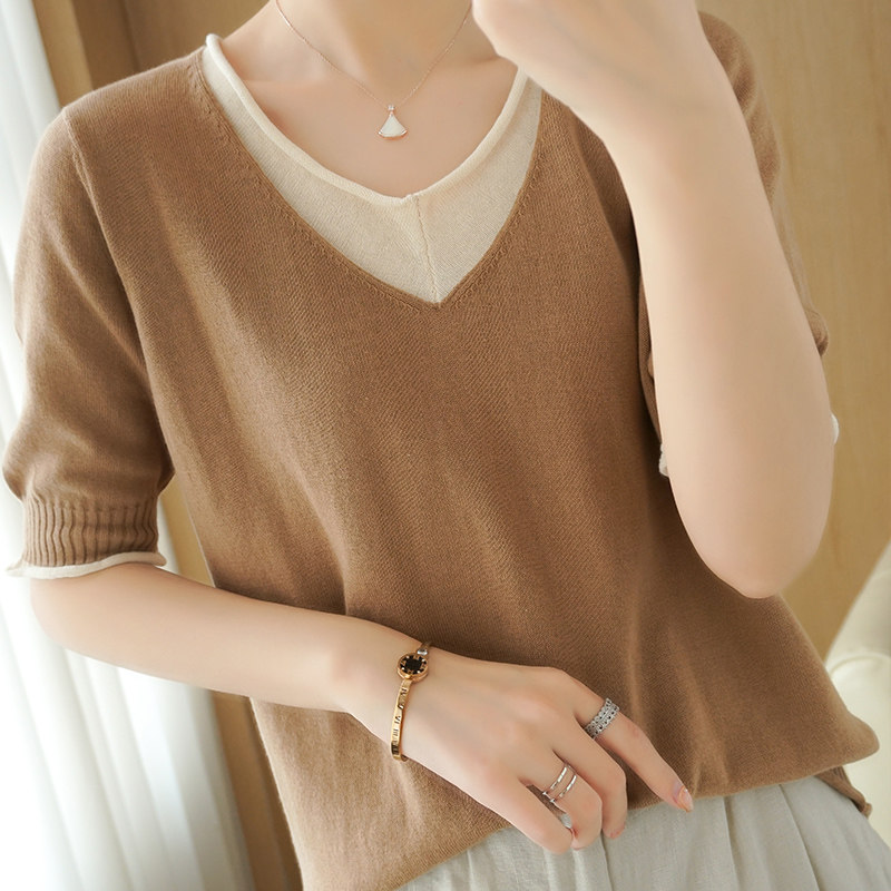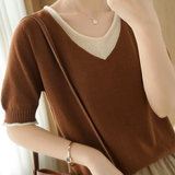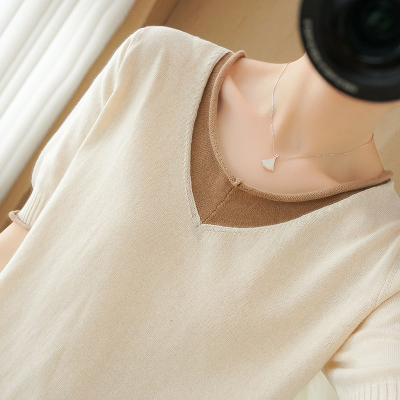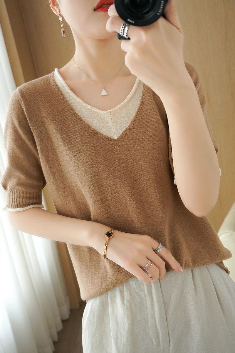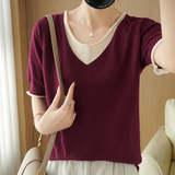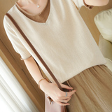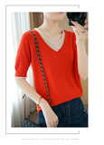 Трикотажная хлопковая базовая приятная телу летняя футболка, из хлопка и льна, короткий рукав, V-образный вырез, сезон 2021