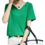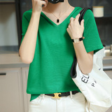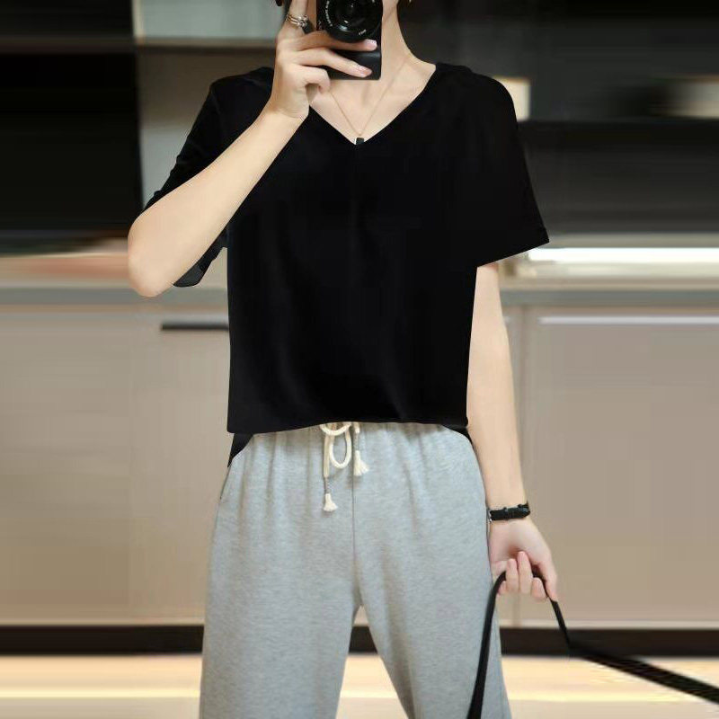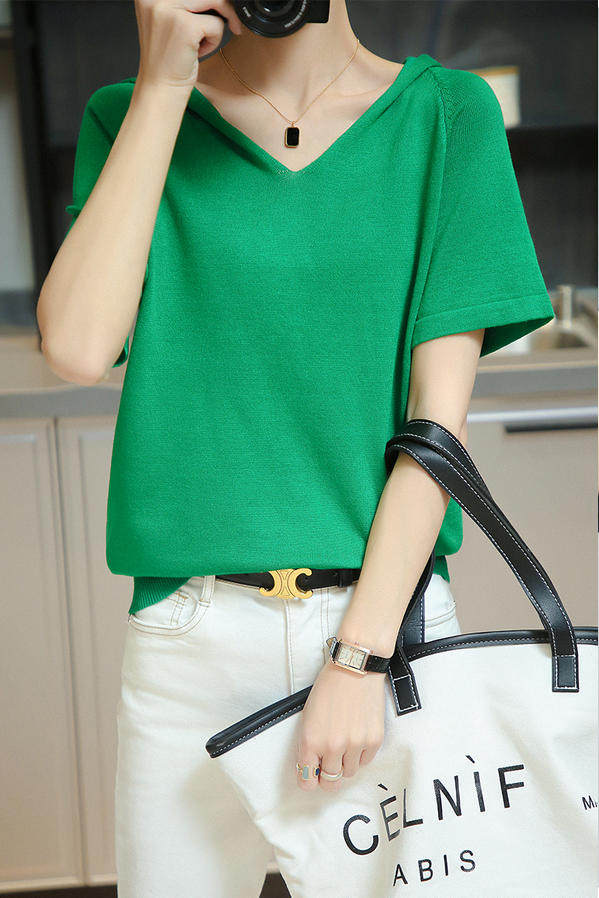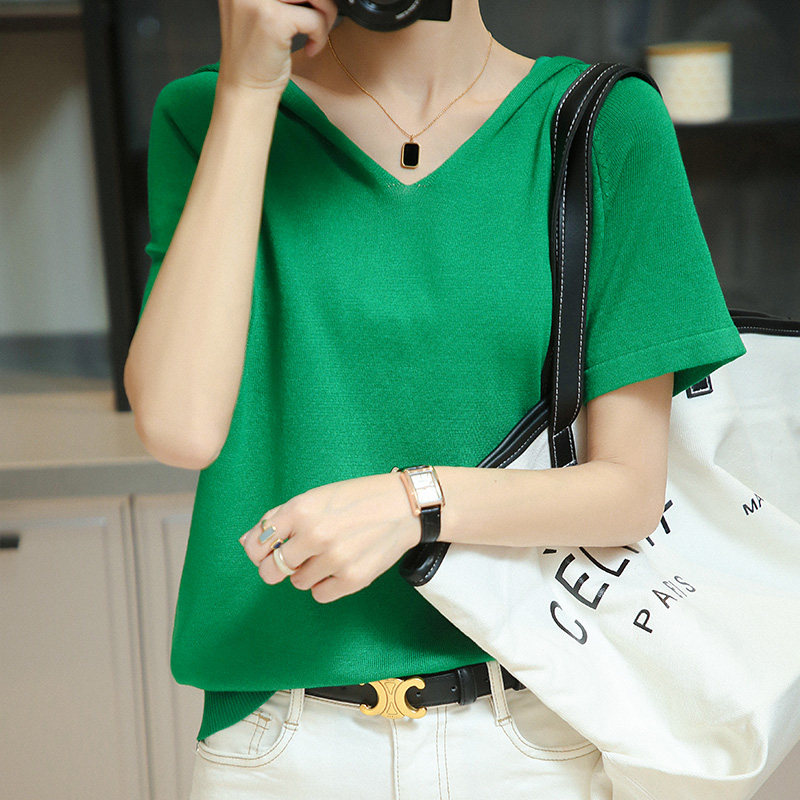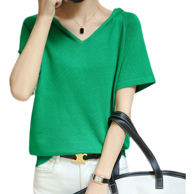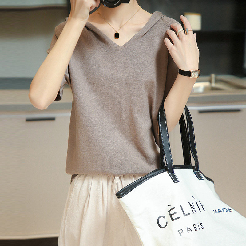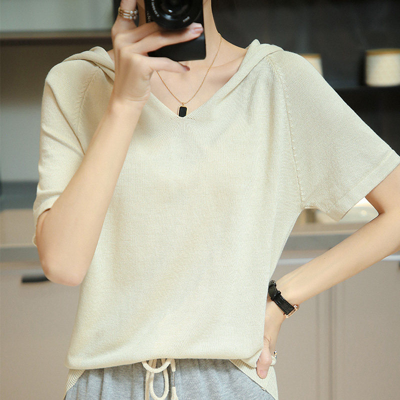 Шелковая летняя тонкая хлопковая трикотажная футболка с капюшоном, балахон, V-образный вырез, короткий рукав, сезон 2021, оверсайз
