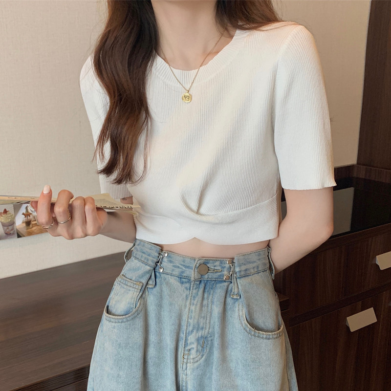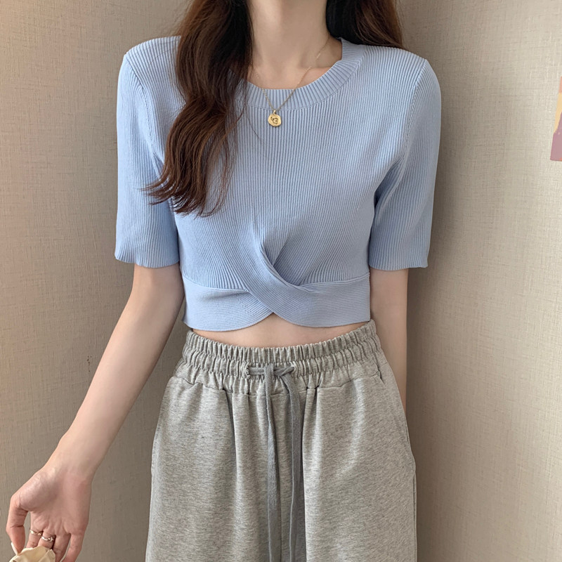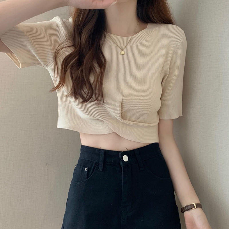 Тонкий трикотажный дизайнерский свитер, короткая футболка, 2021 года, короткий рукав, тренд сезона