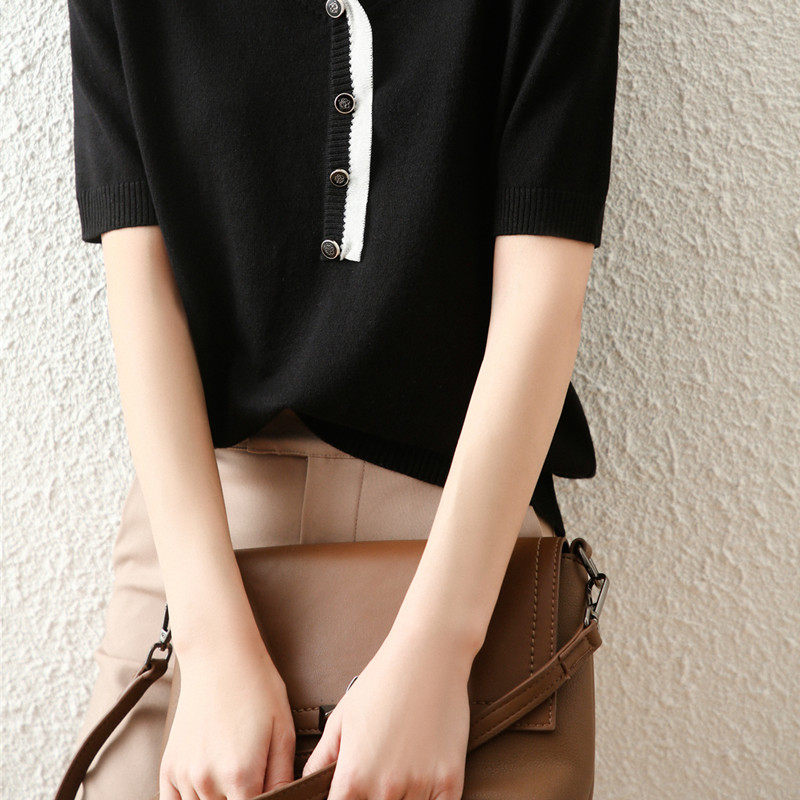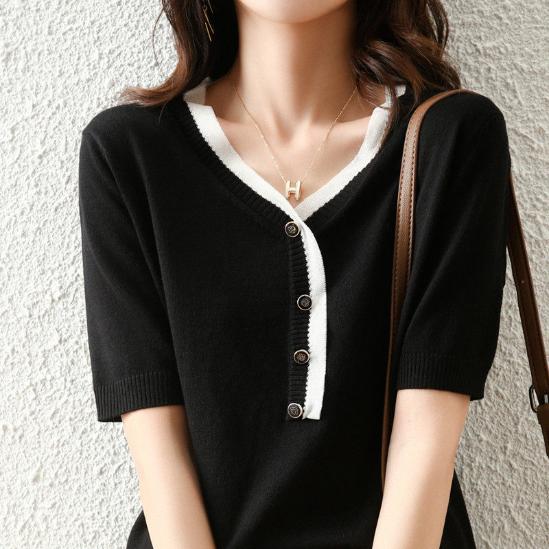 Трикотажный летний модный свитер, базовая футболка, французский стиль, V-образный вырез, свободный крой
