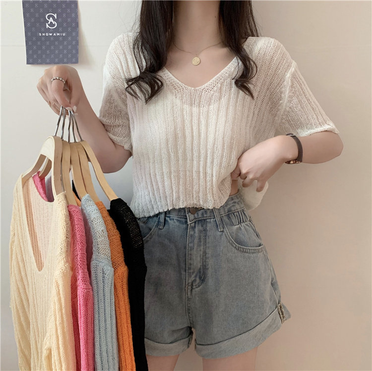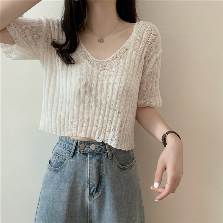 Трикотажный свитер, летняя тонкая короткая футболка с коротким рукавом, V-образный вырез, высокая талия