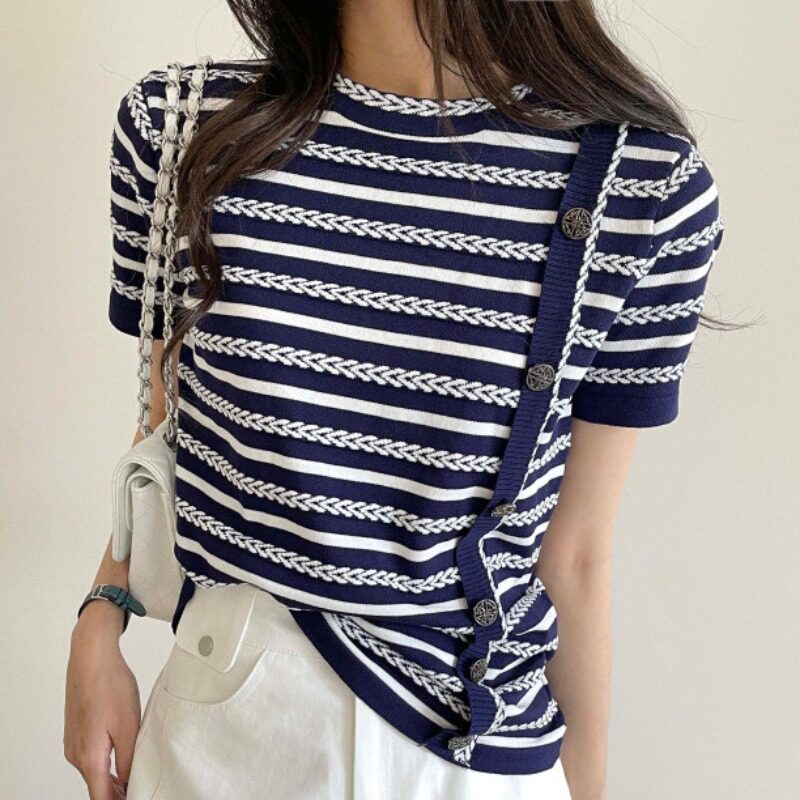 Летняя ретро дизайнерская цепь с круглым воротником, трикотажный свитер, в корейском стиле, короткий рукав