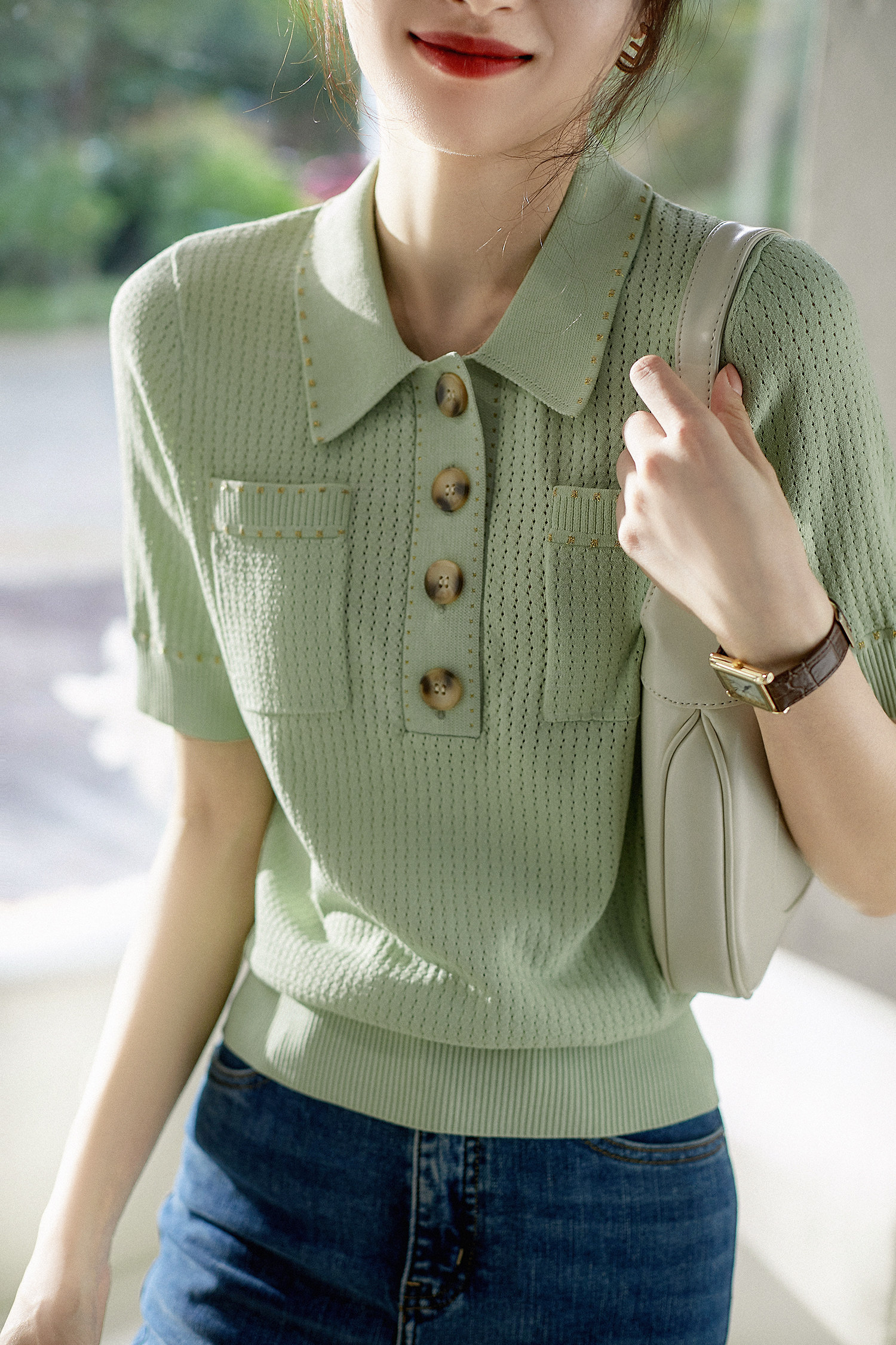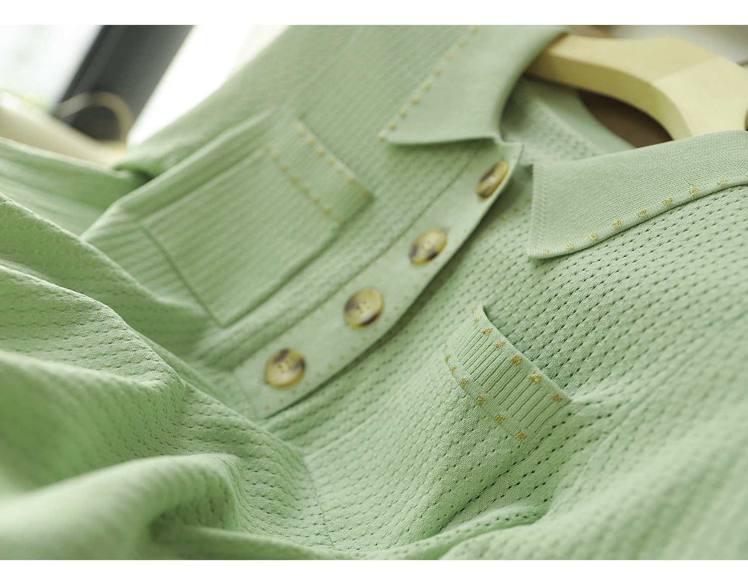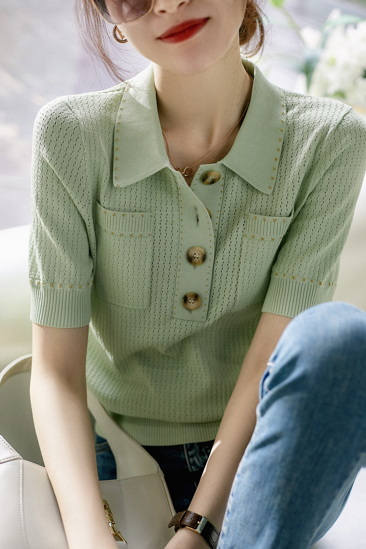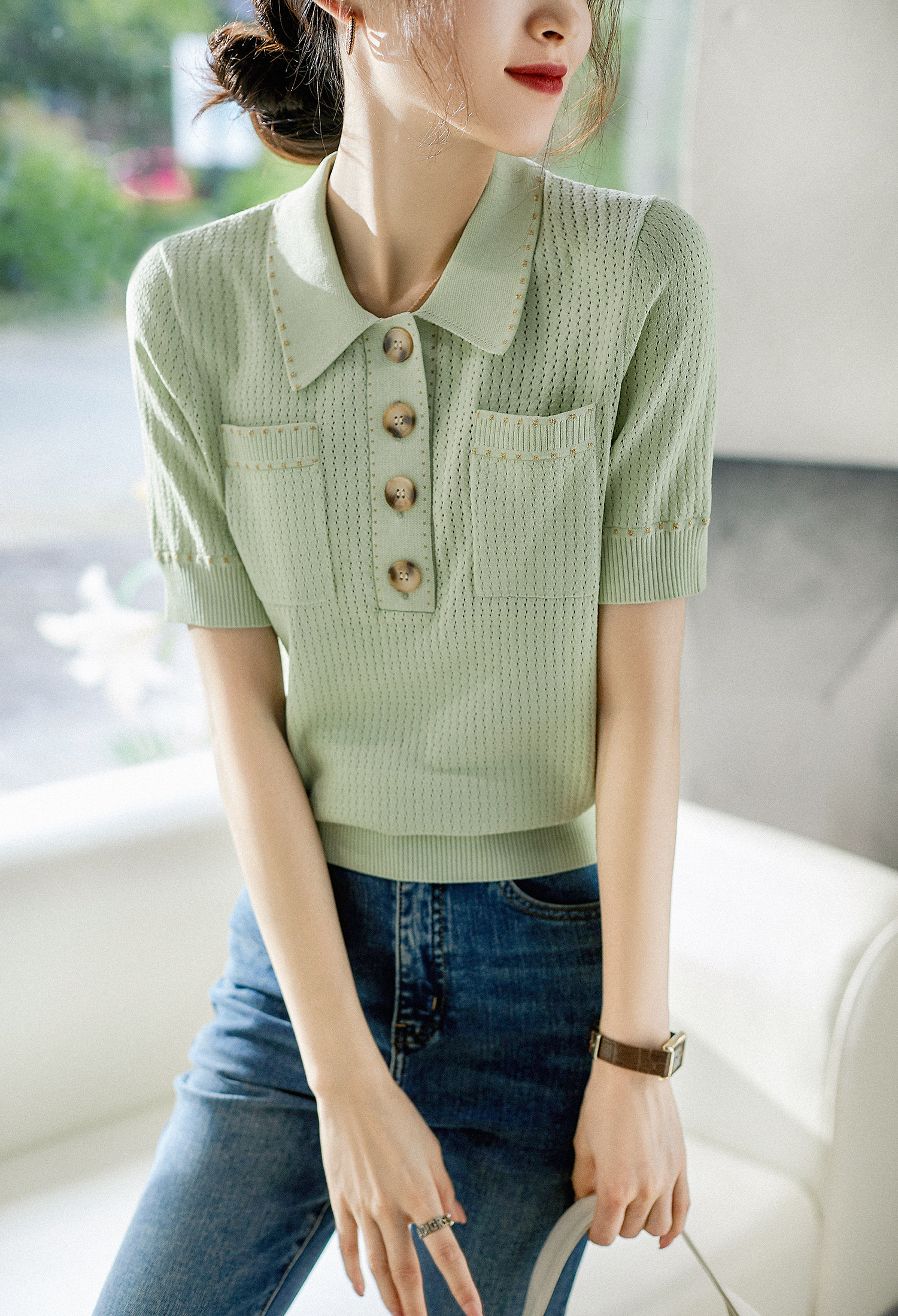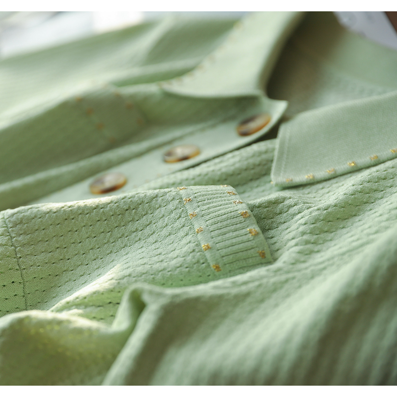 & [Zyn462601mg] Красивый мятный зеленый цвет прекрасен!Гибкое мясо освежающая вязаная рубашка поло