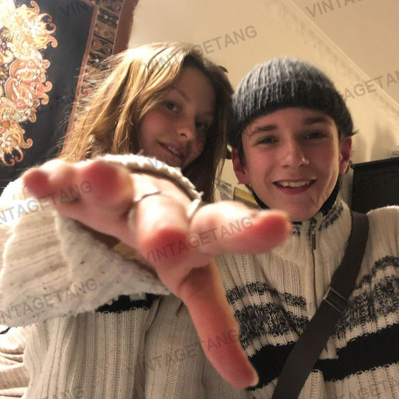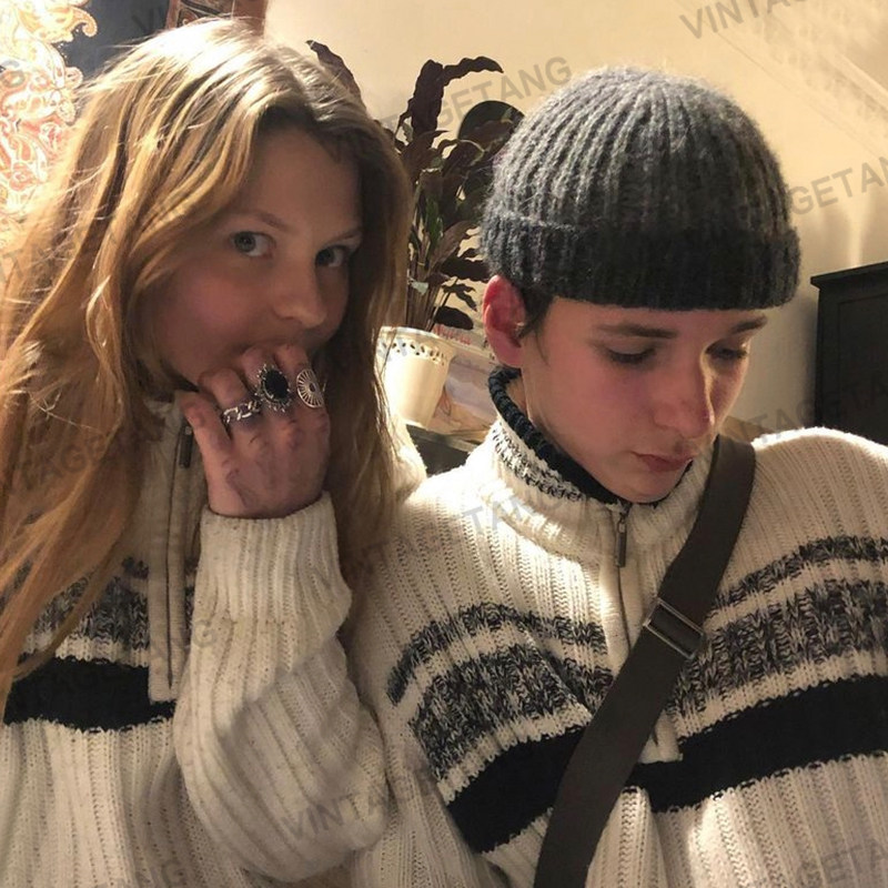 Vintagetang Американский ретро повседневные белые серого серого Стоя пара вязаного свитера осень и зимний свитер