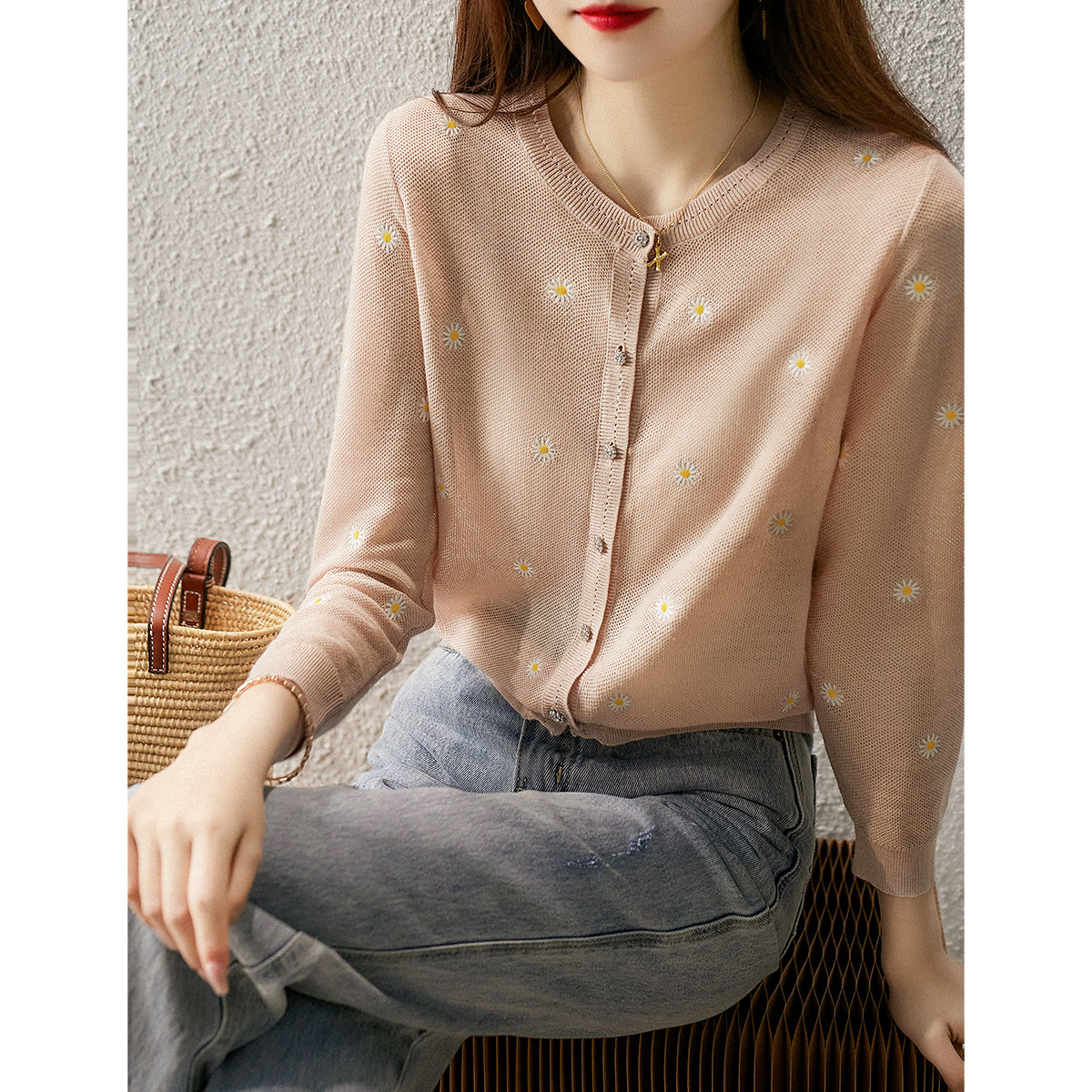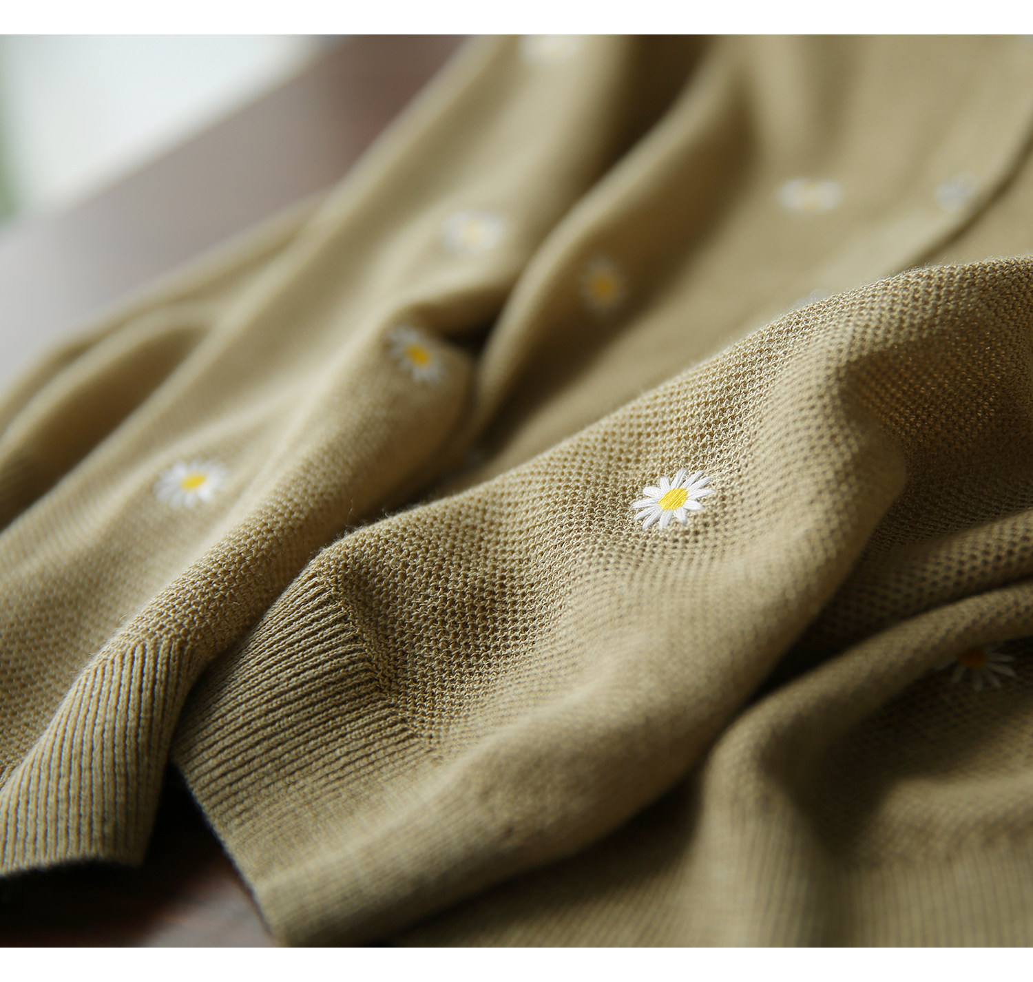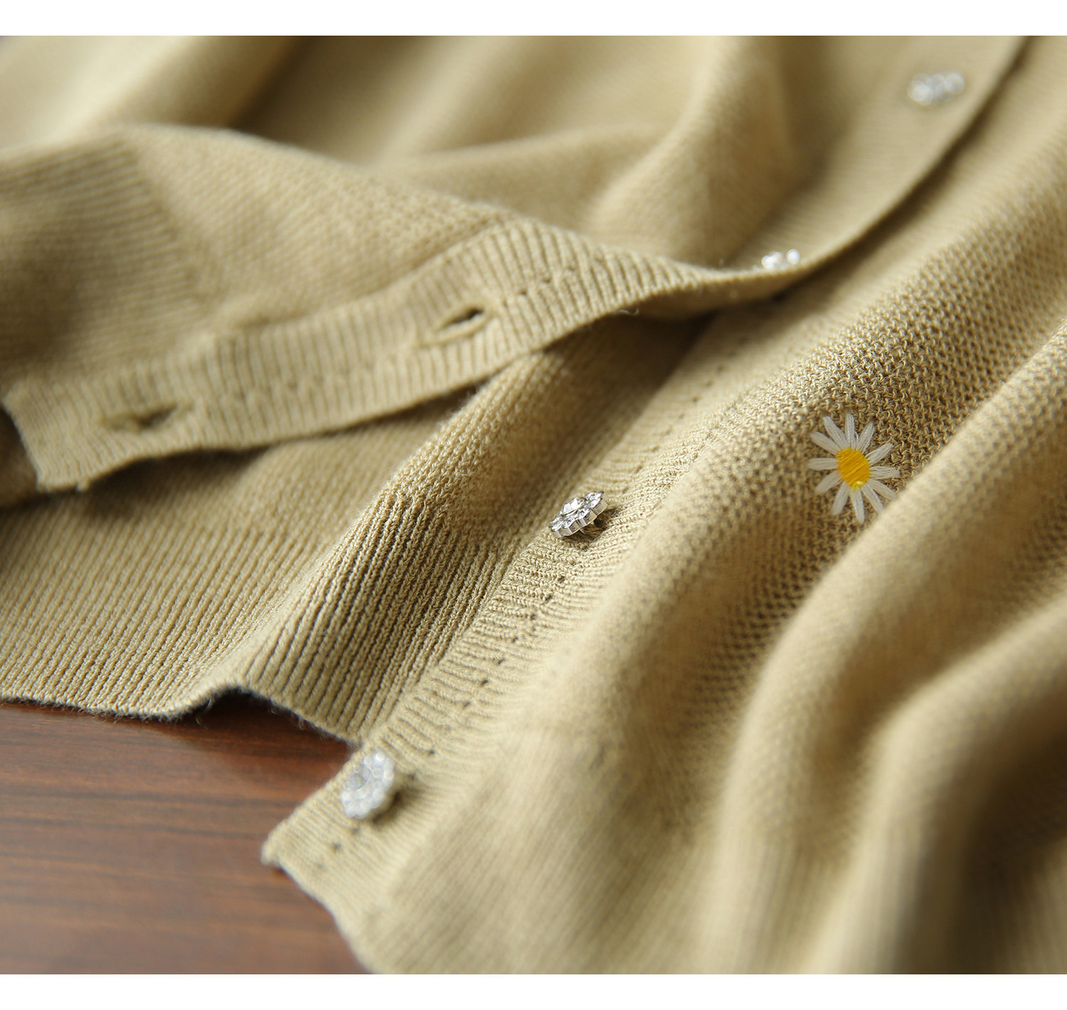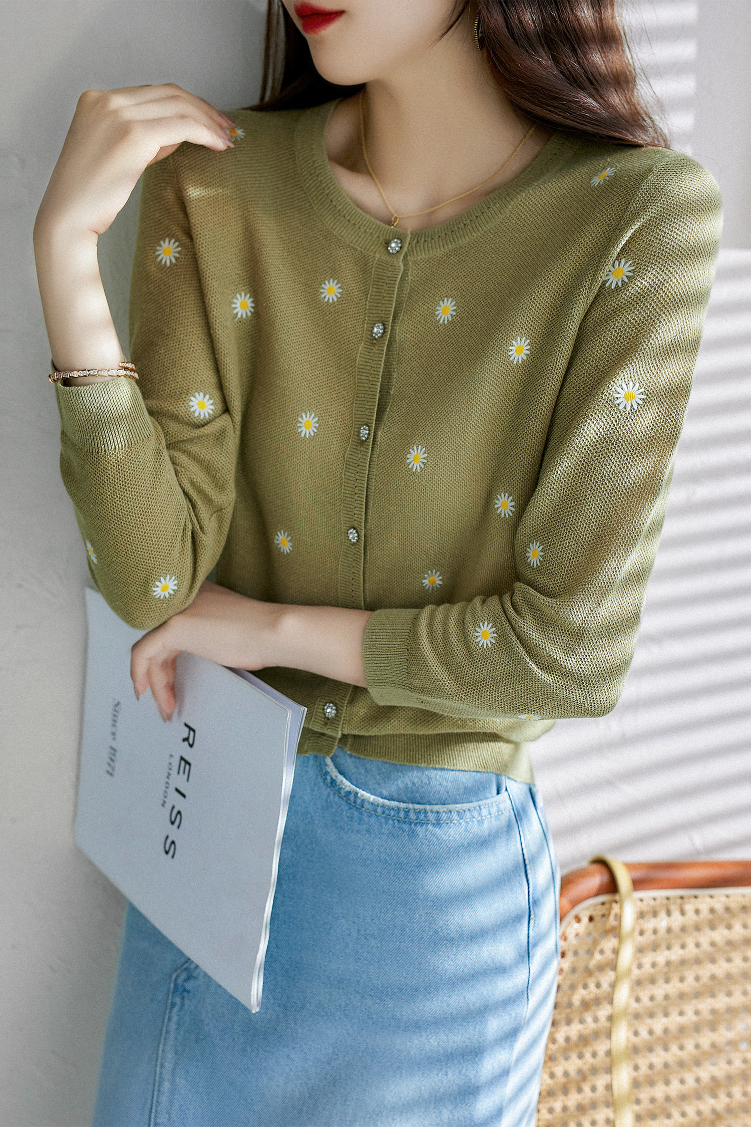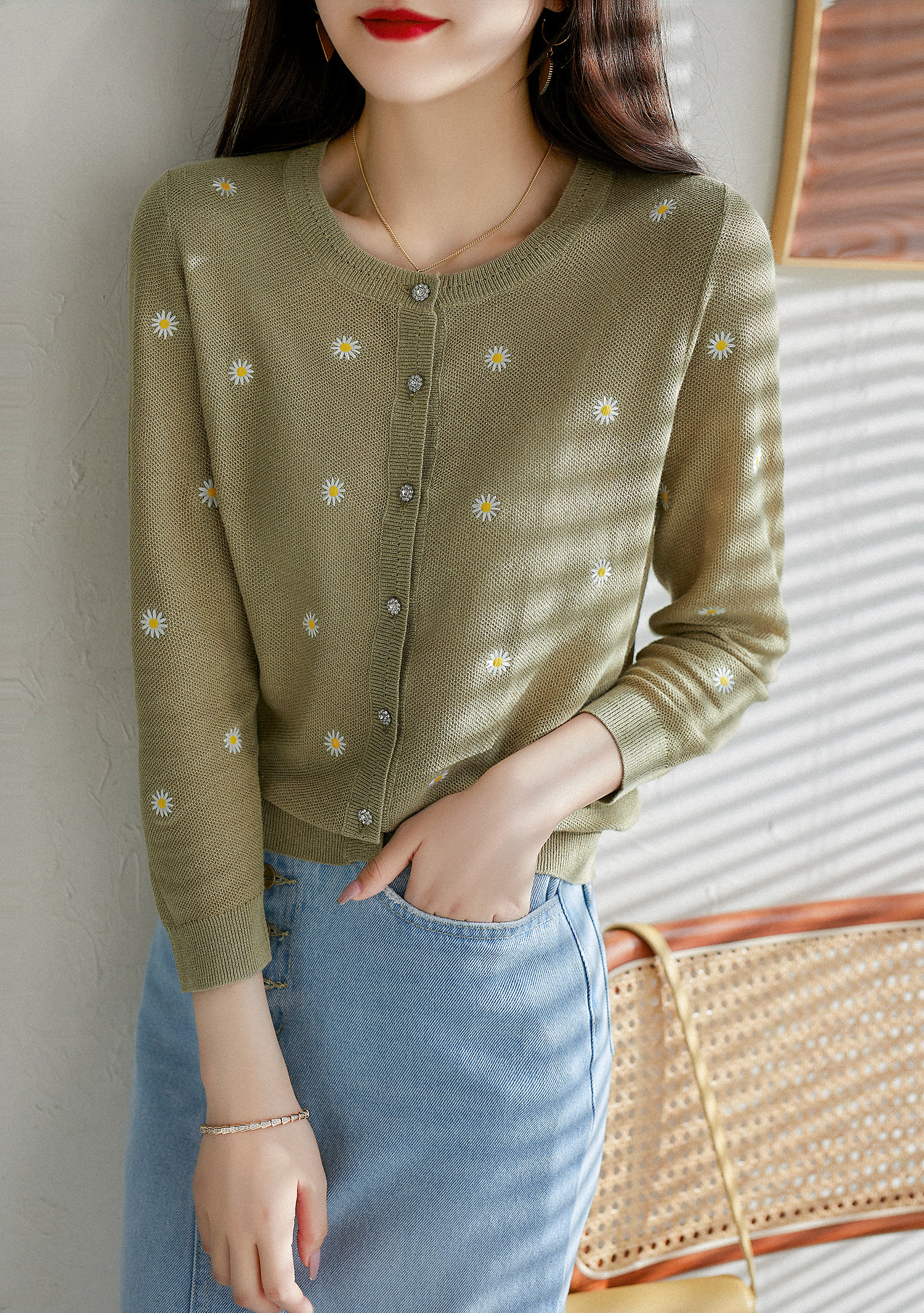 の [ZY358166MG] Очаровательная маленькая вышивка DAISY, дышащая вязаная кастора -вязаная рубашка кардиган