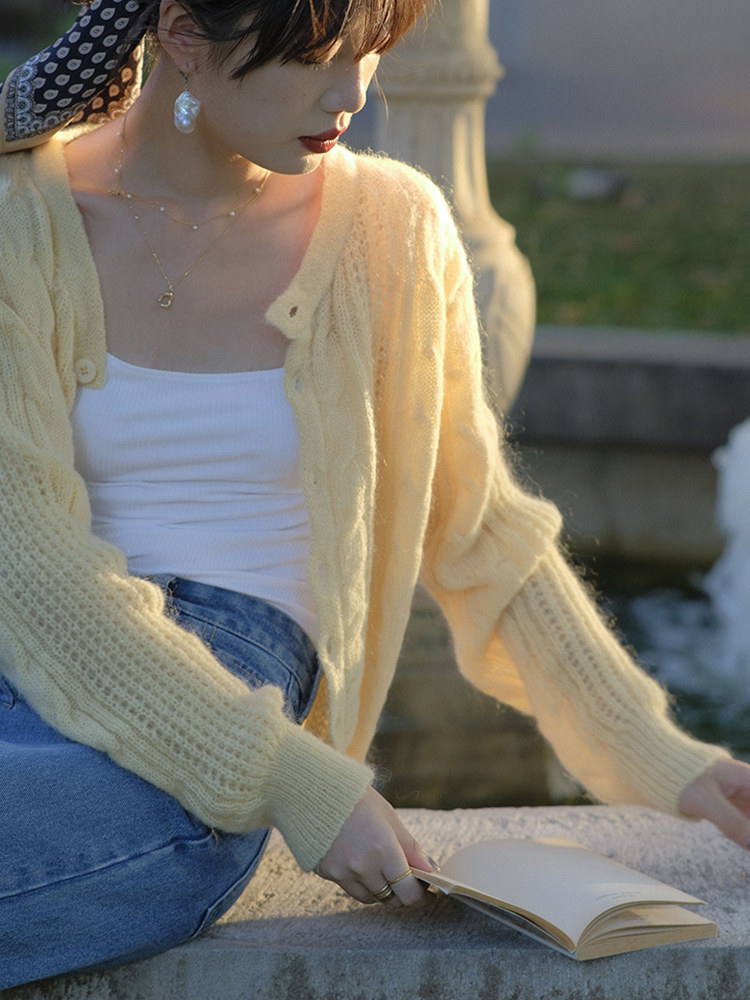 Трикотажный демисезонный кардиган для школьников и студентов, приталенный короткий желтый свитер, куртка, французский стиль, коллекция 2021