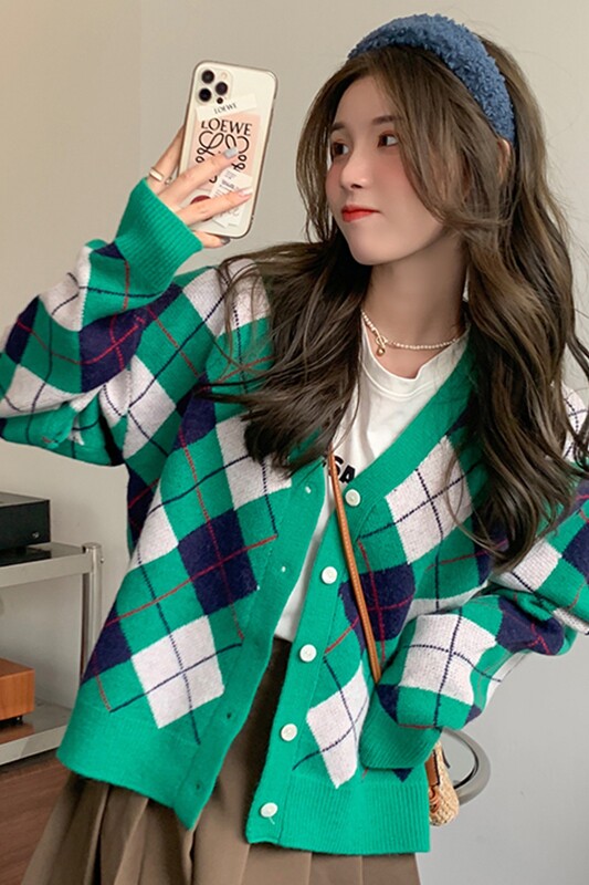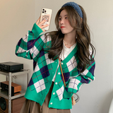 Трикотажный осенний ретро свитер, лонгслив с ромбовидным узором, кардиган, коллекция 2021, V-образный вырез, свободный крой