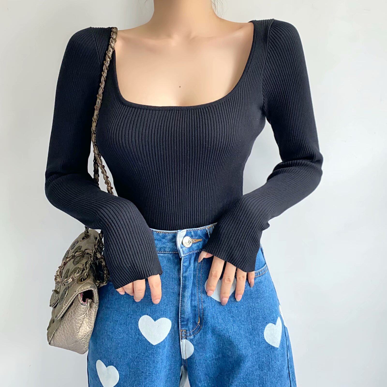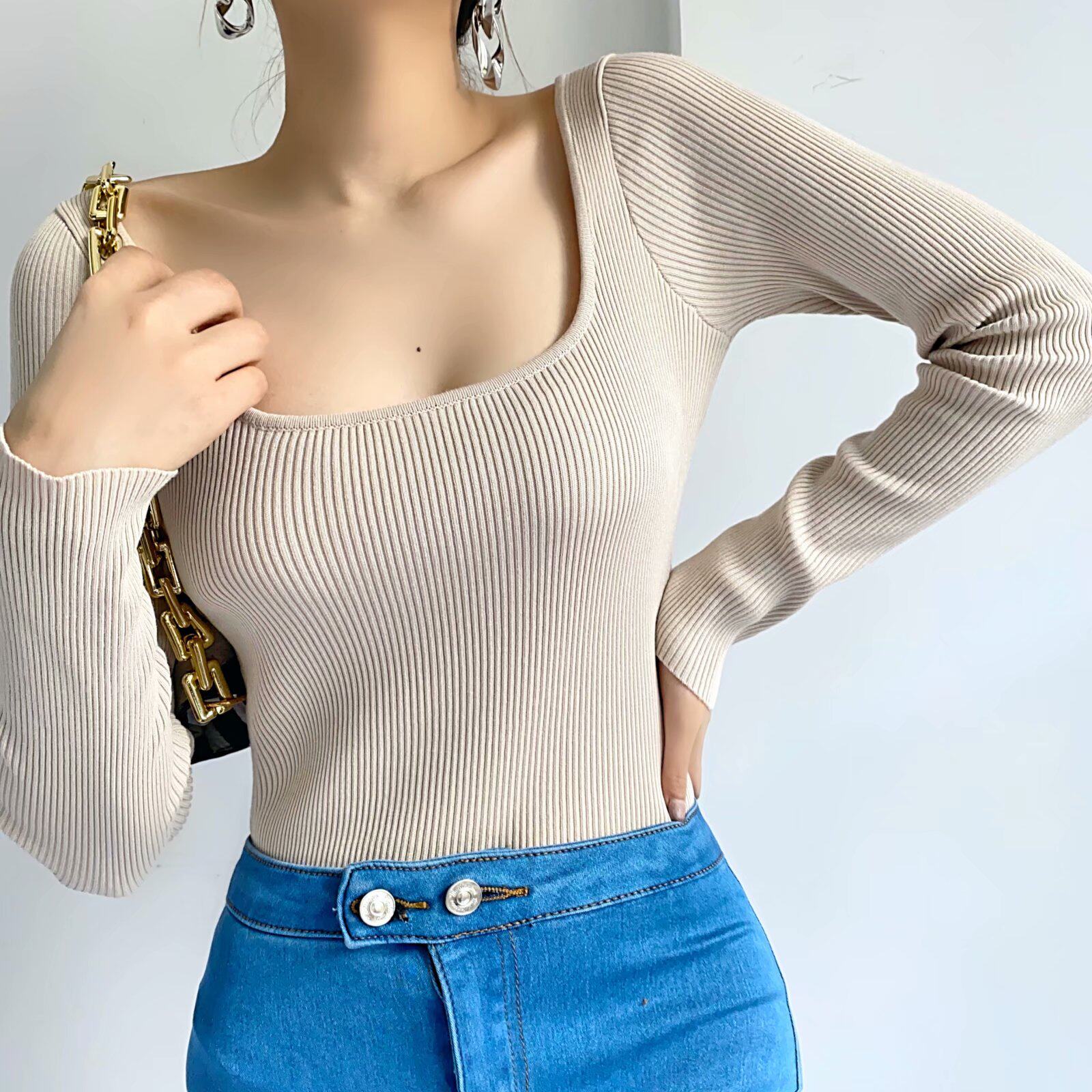 Демисезонный сексуальный пуховик, трикотажное эластичное боди, лонгслив, базовый приятный телу свитер, квадратный вырез