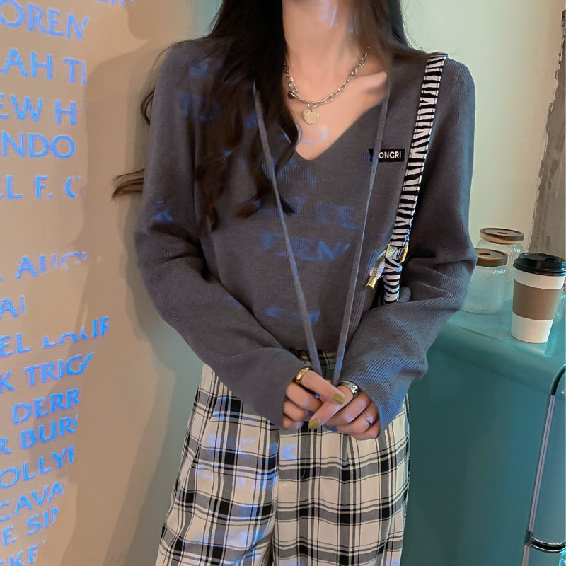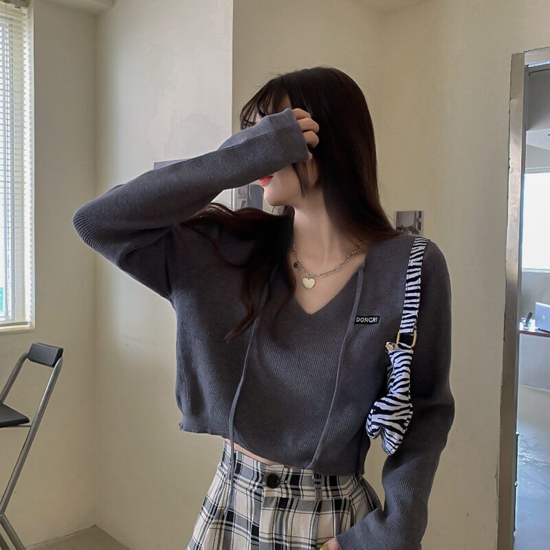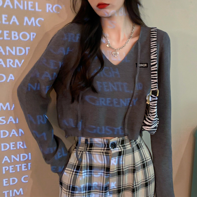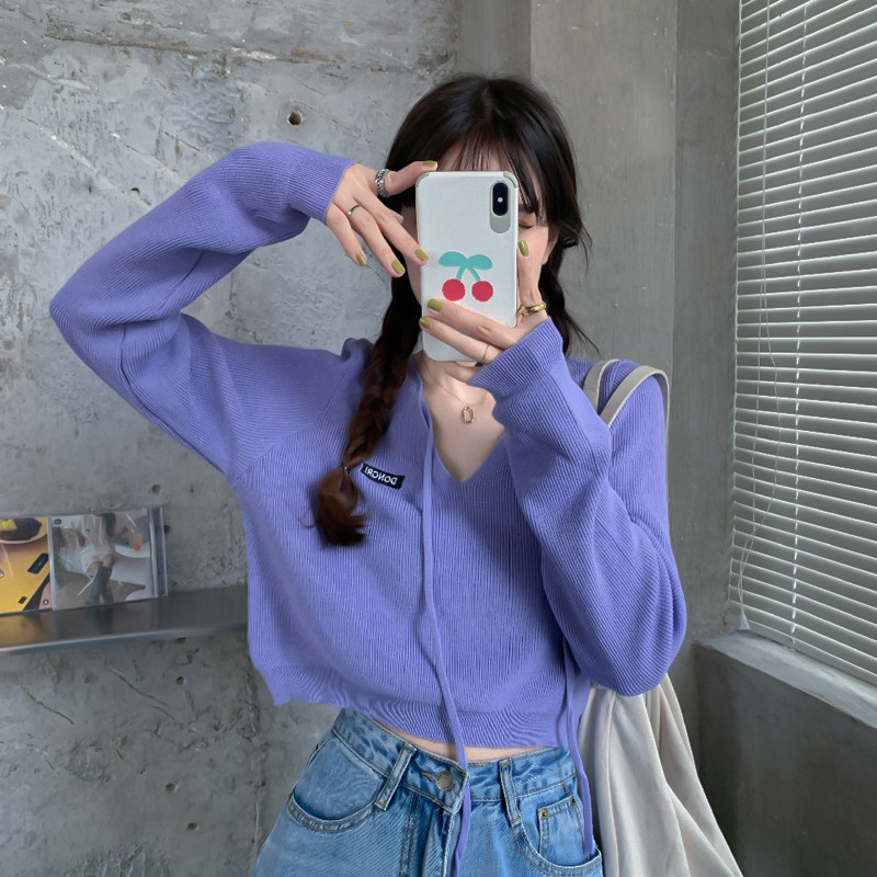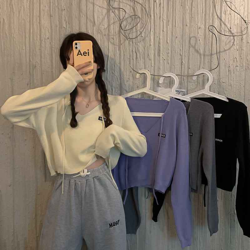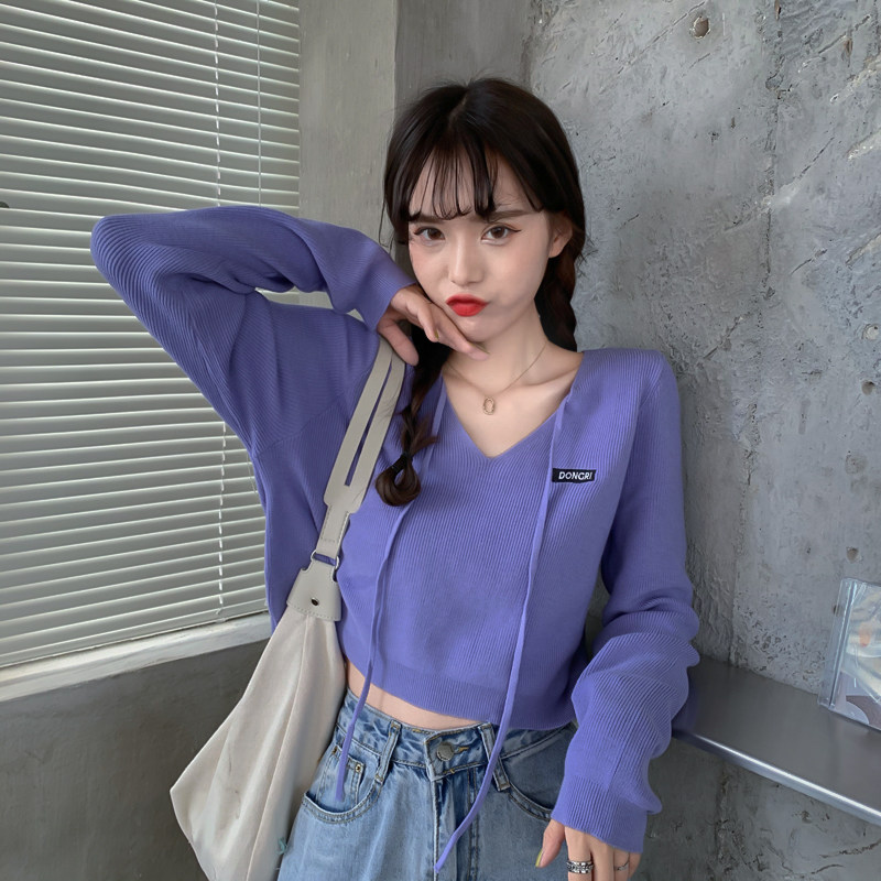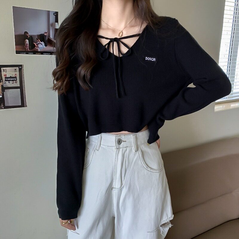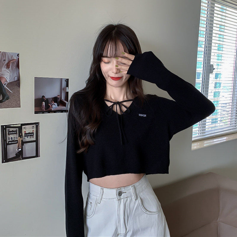 Трикотажный приятный телу осенний лонгслив, дизайнерский ремень, короткая футболка, тренд сезона, V-образный вырез, высокая талия