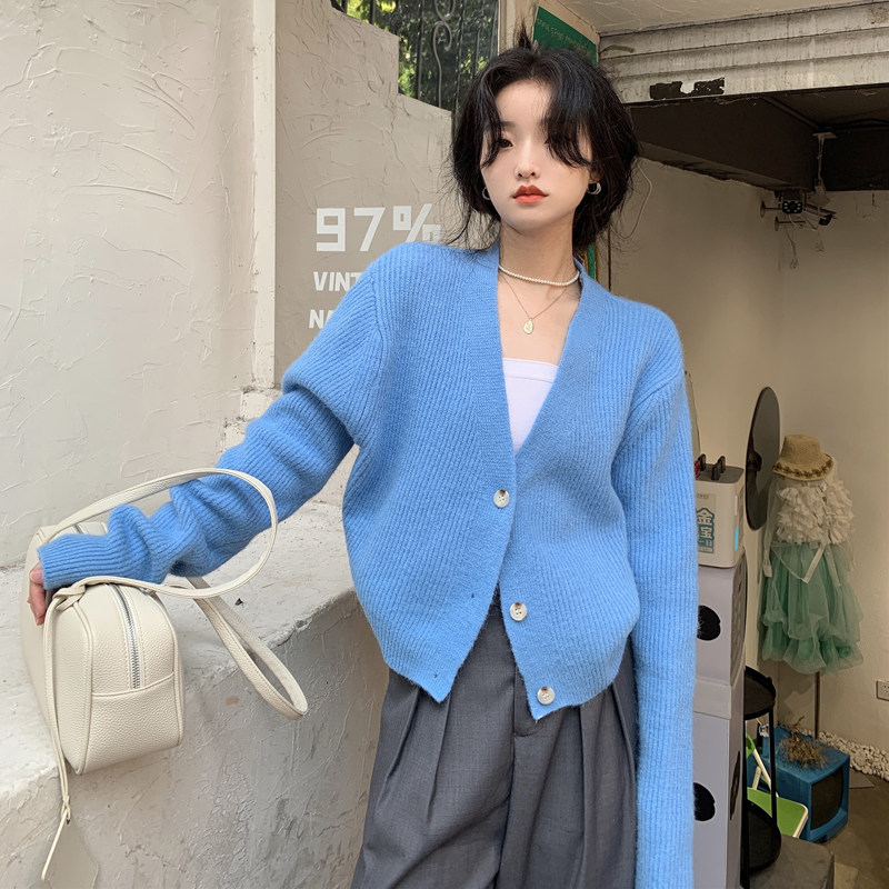 Трикотажный осенний свитер, короткий лонгслив, кардиган, V-образный вырез, в корейском стиле, коллекция 2021