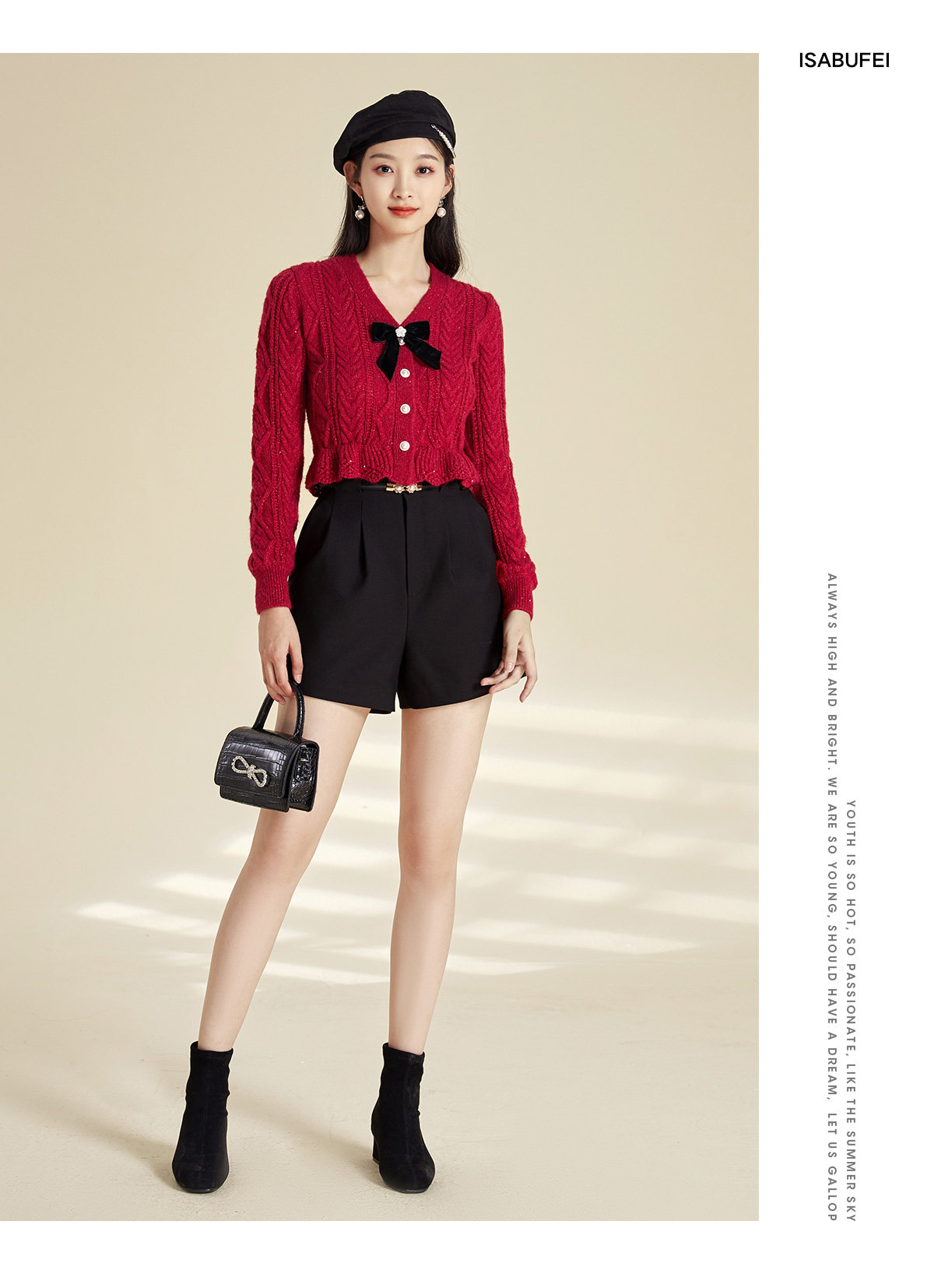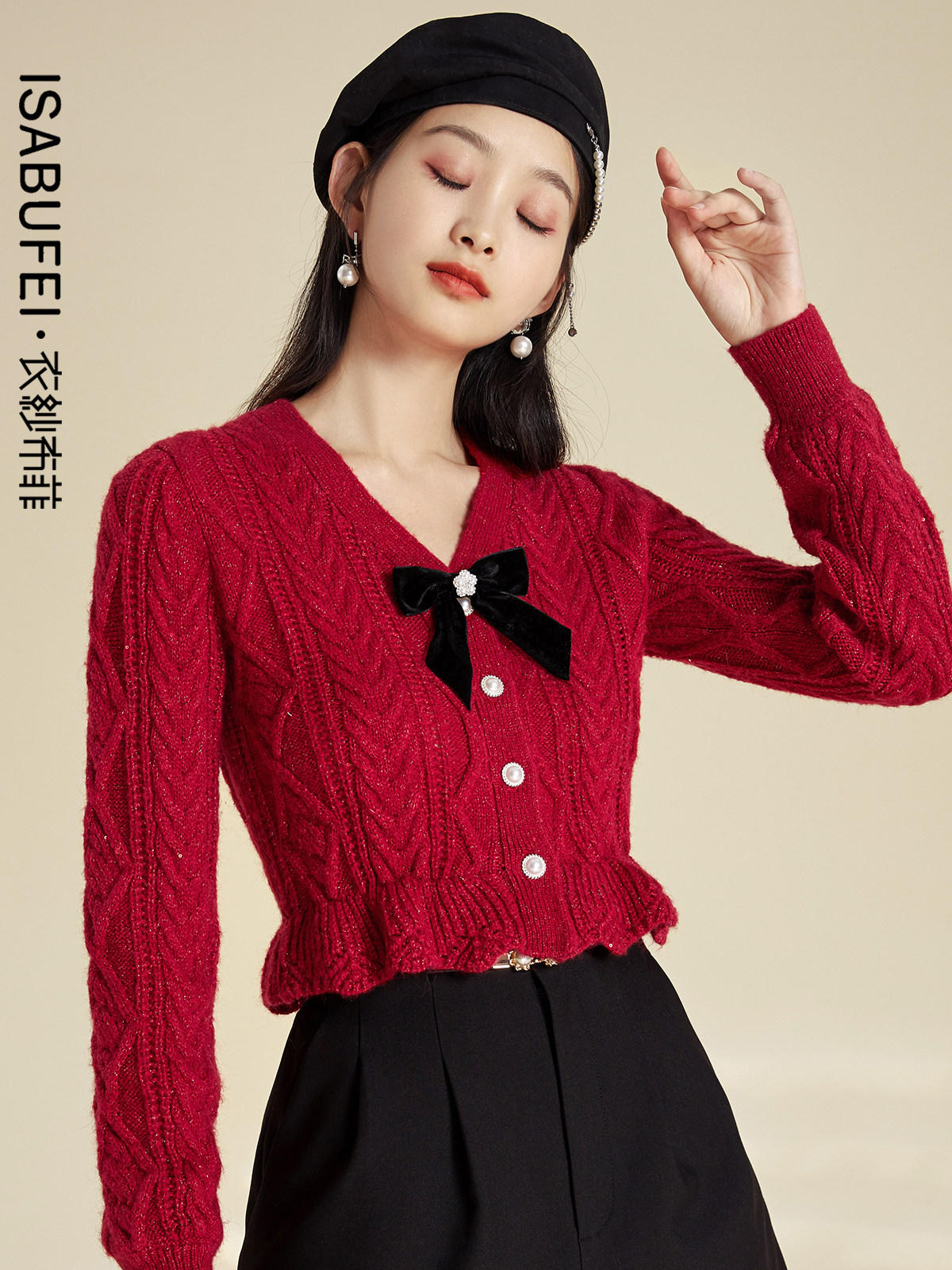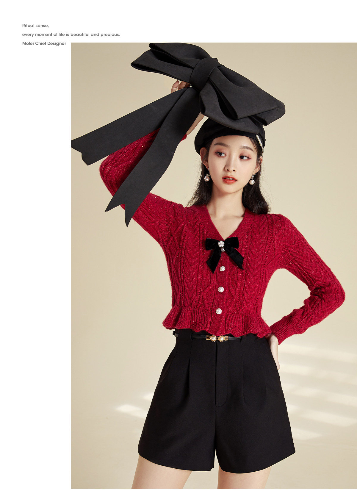Марлевый демисезонный короткий кардиган с бантиком, красный свитер, V-образный вырез, облегающий крой