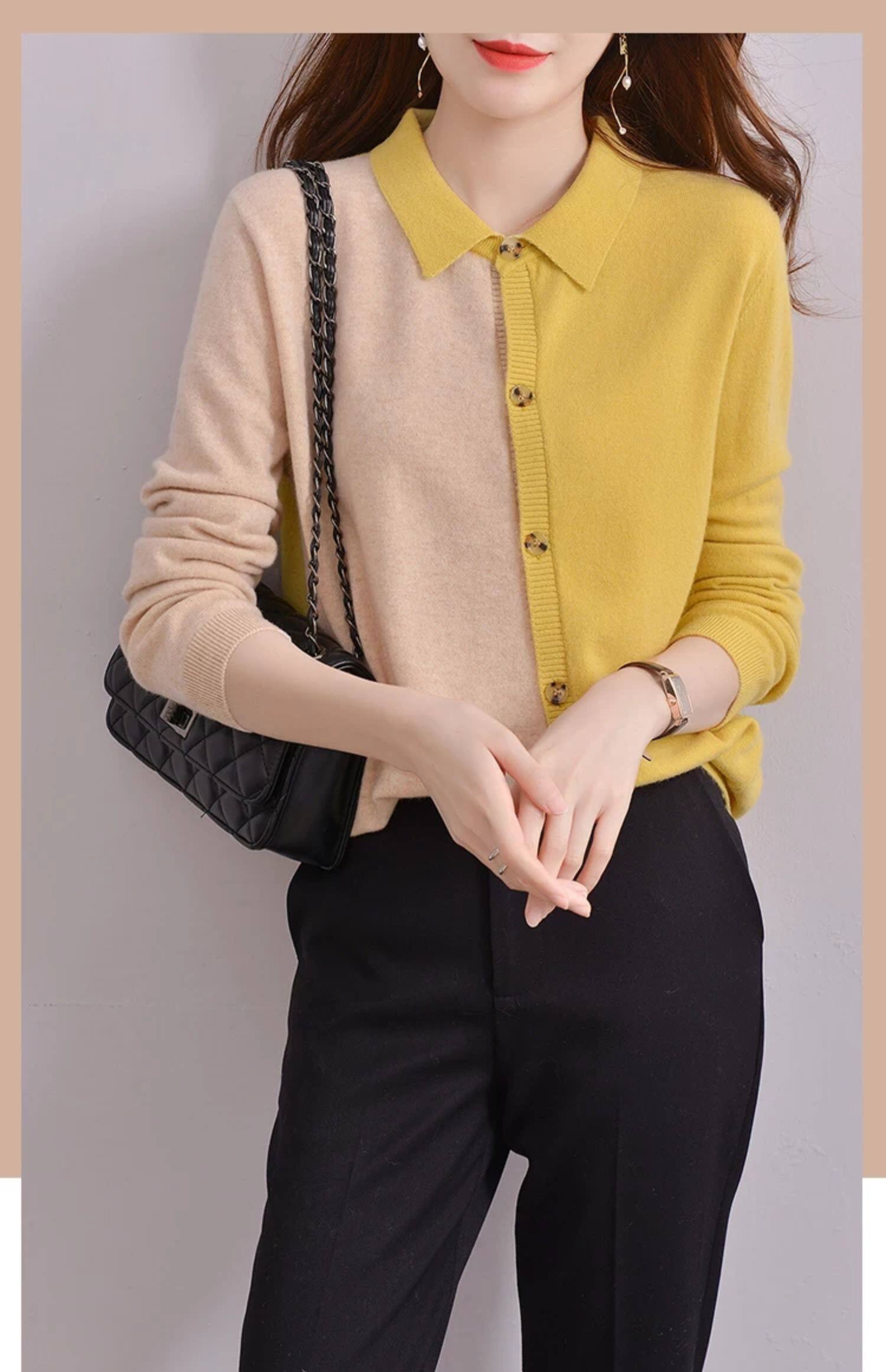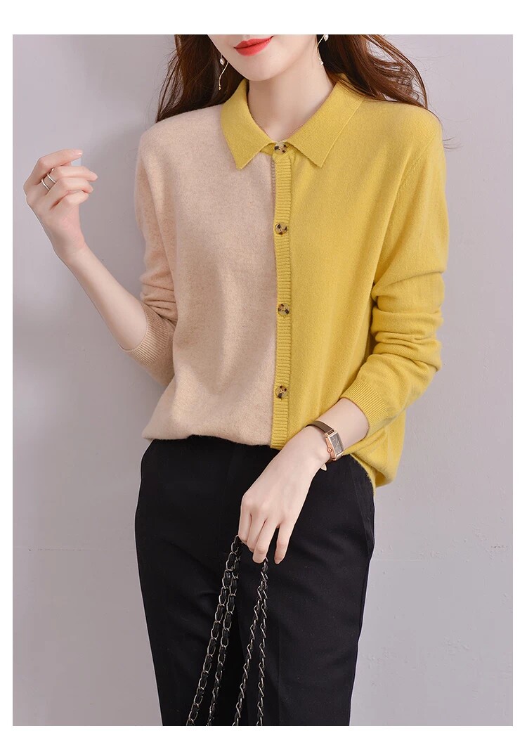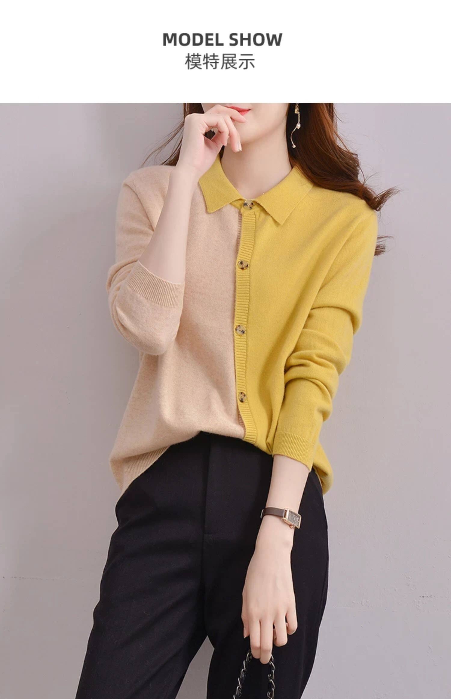 Шерстяной осенний кардиган, базовый лонгслив, свитер, воротник поло, европейский стиль, оверсайз