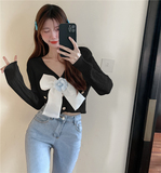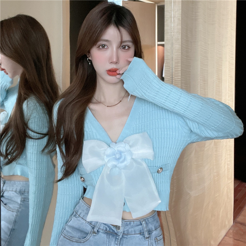Демисезонный трикотажный базовый короткий свитер, коллекция 2022, в стиле Шанель, изысканный стиль, V-образный вырез