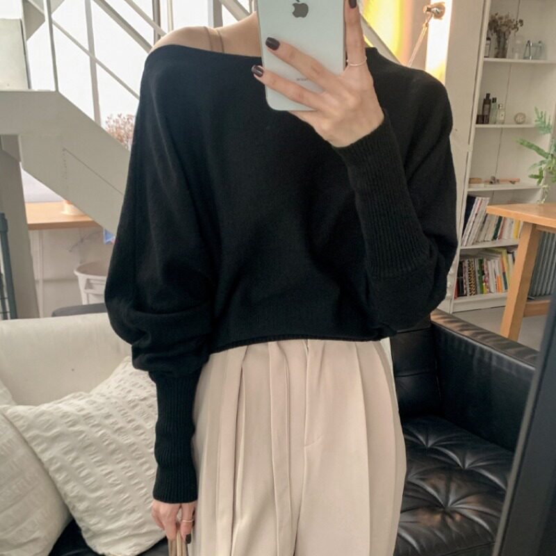 Осенний ретро трикотажный свитер, в корейском стиле, открытые плечи, в западном стиле, оверсайз