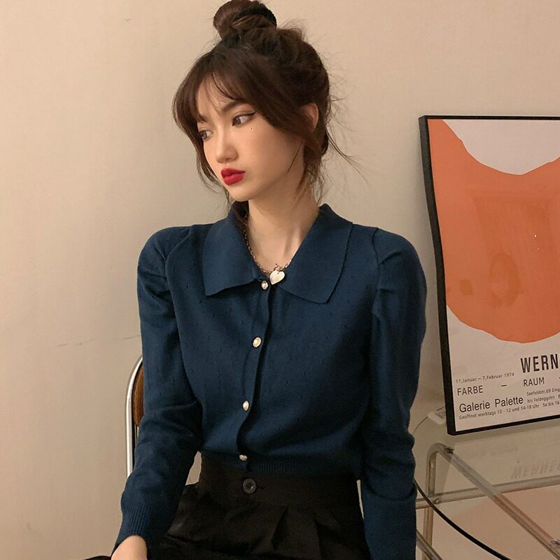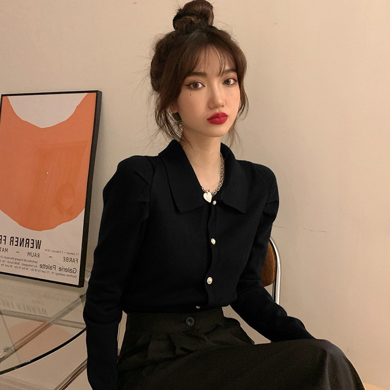 2021 Новая дизайн ниша Slim Fit осень и зимняя внутренняя ношение черная вязаная базовая рубашка для женщин ранняя осенняя топ -рукава