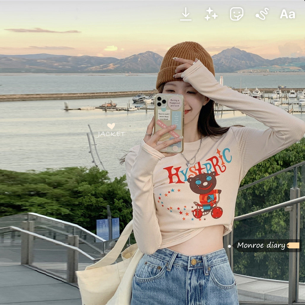 Абрикосовый мультяшный трикотажный лонгслив, осенний тонкий свитер, базовая приятная телу куртка, коллекция 2021