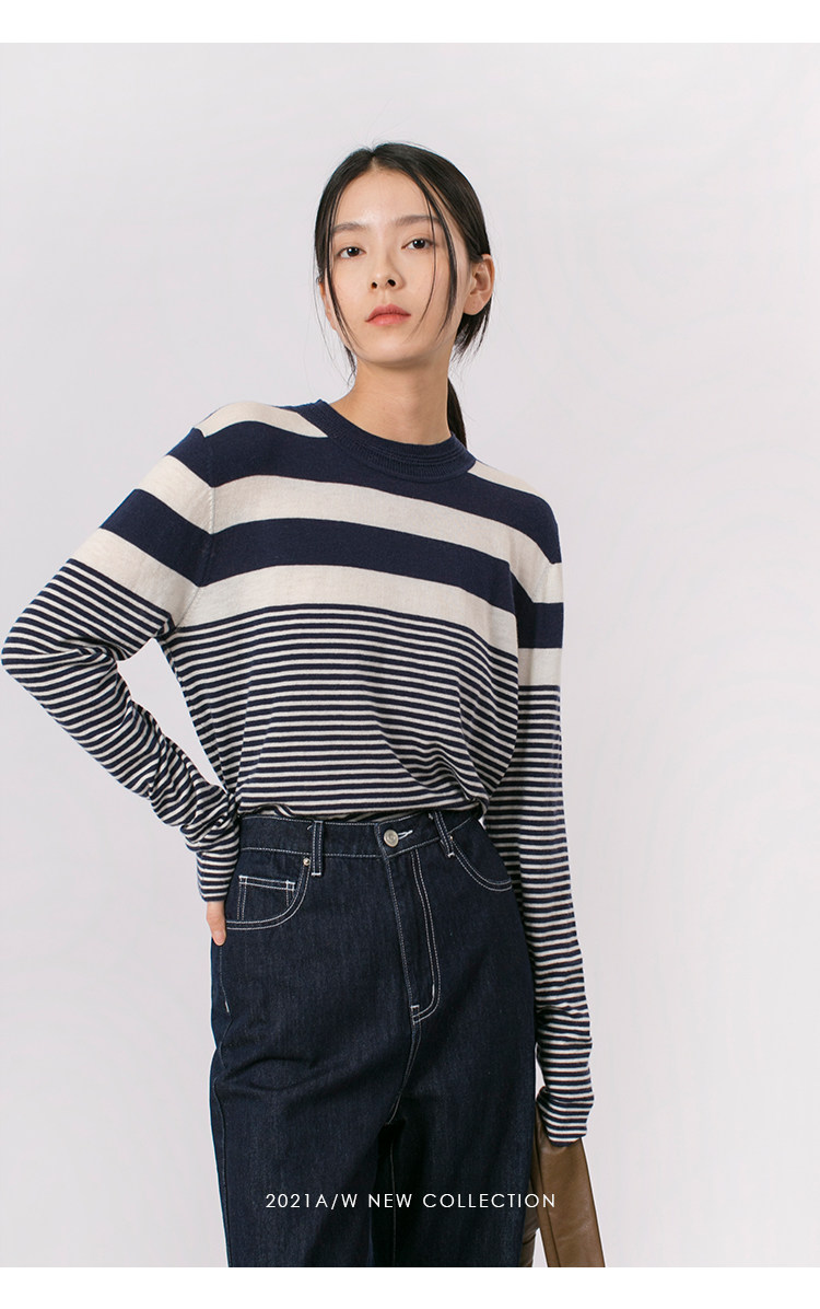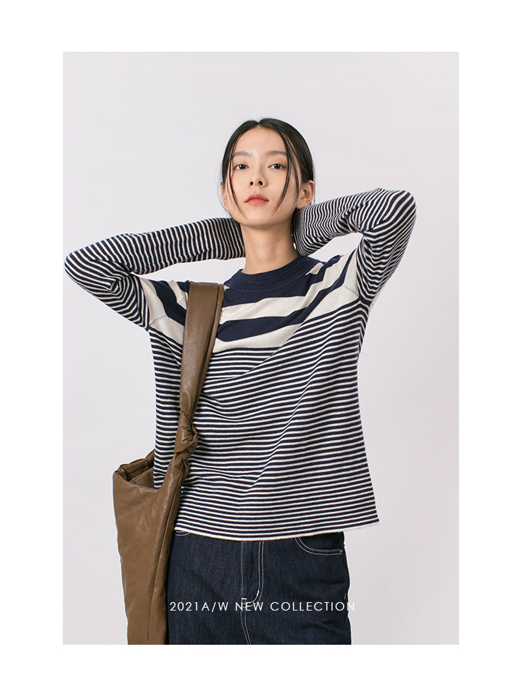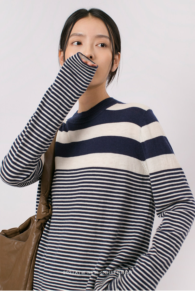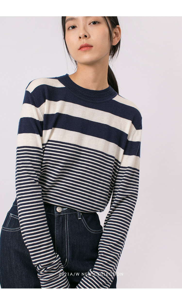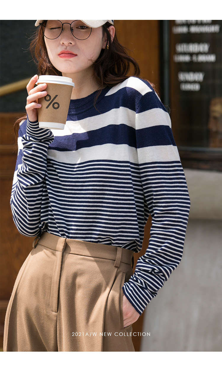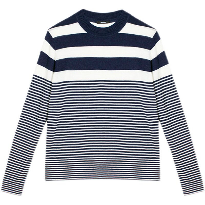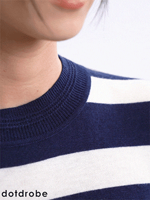DotDrobe предлагает множество осенних женских пуловеров из шерсти мериноса UPW в темно-синюю и белую полоску.
