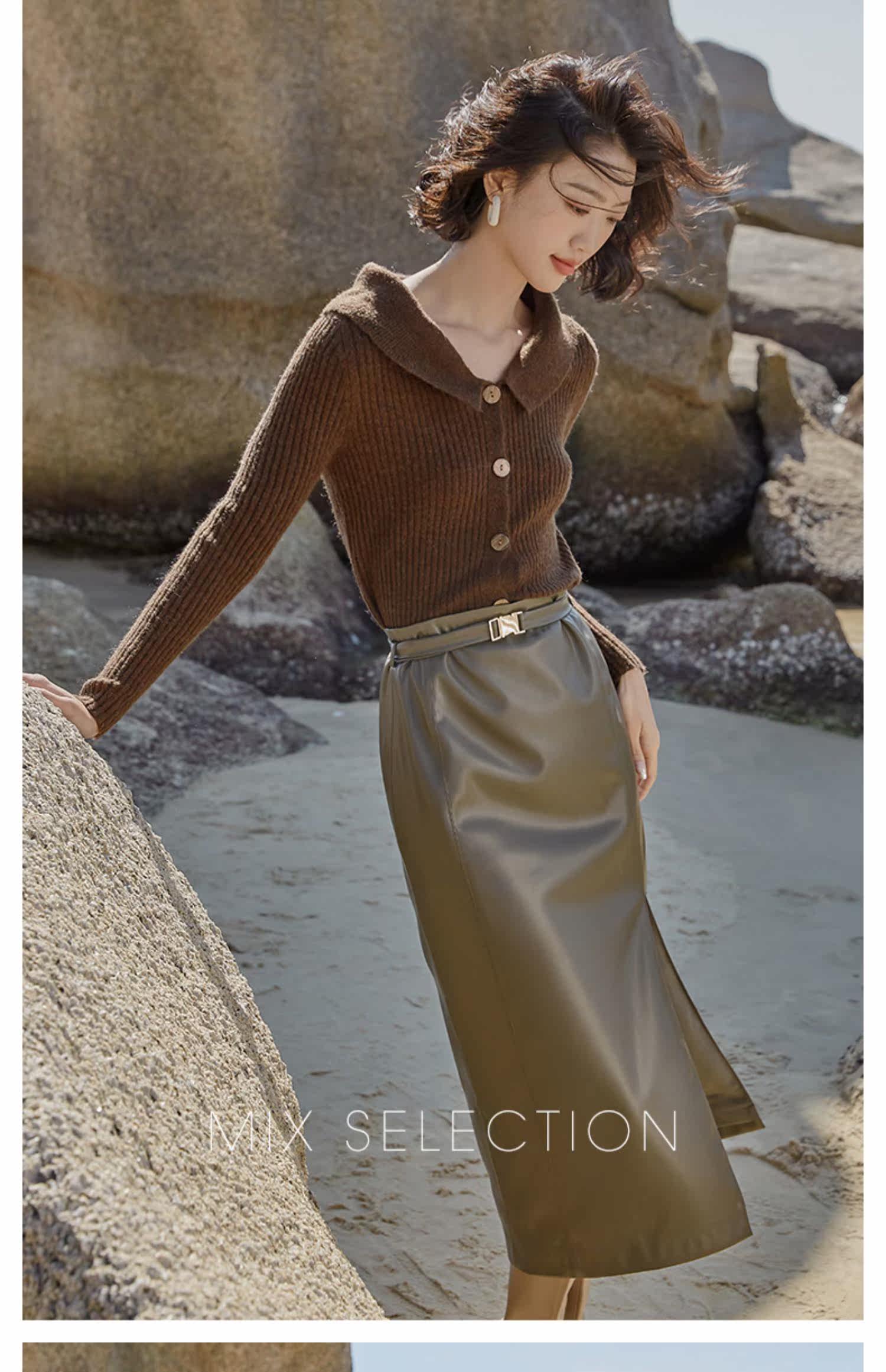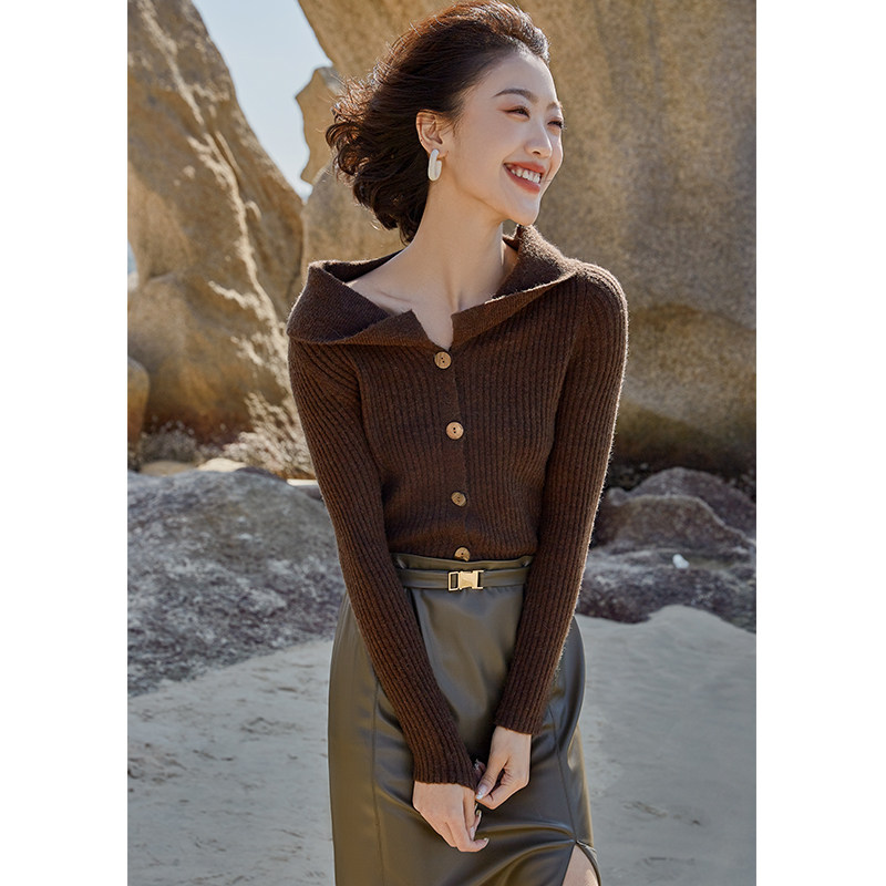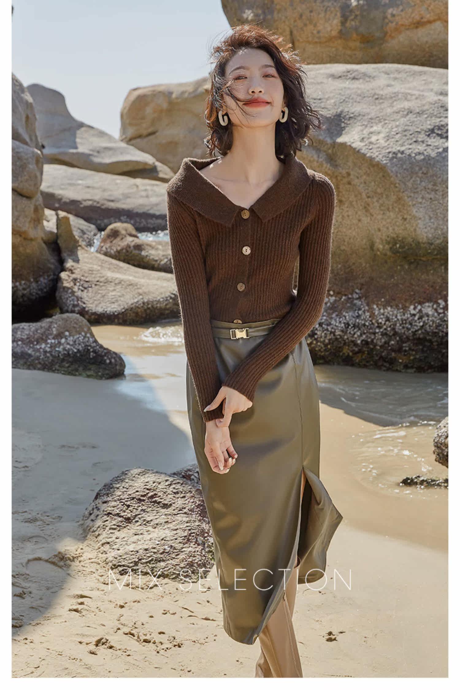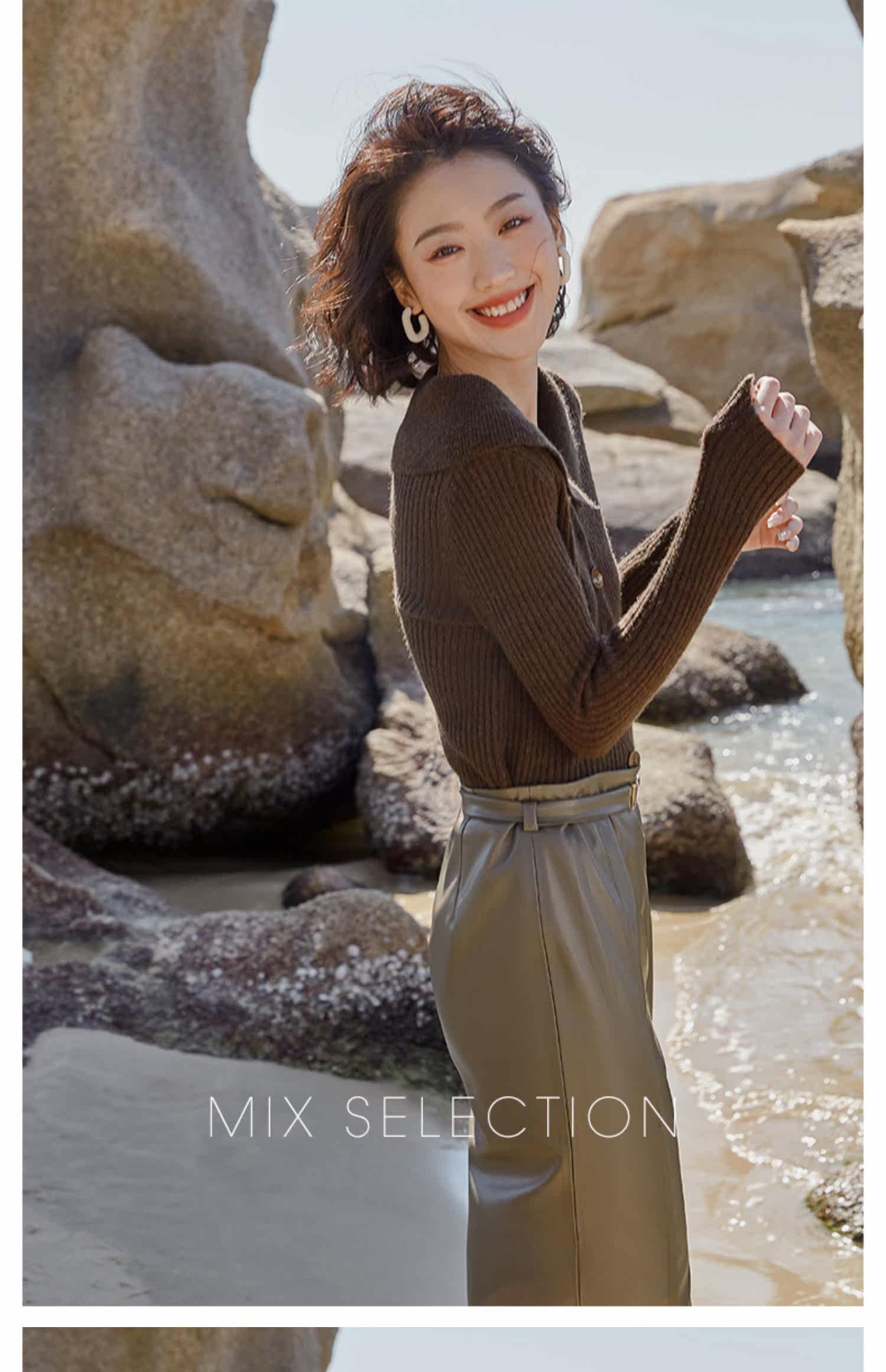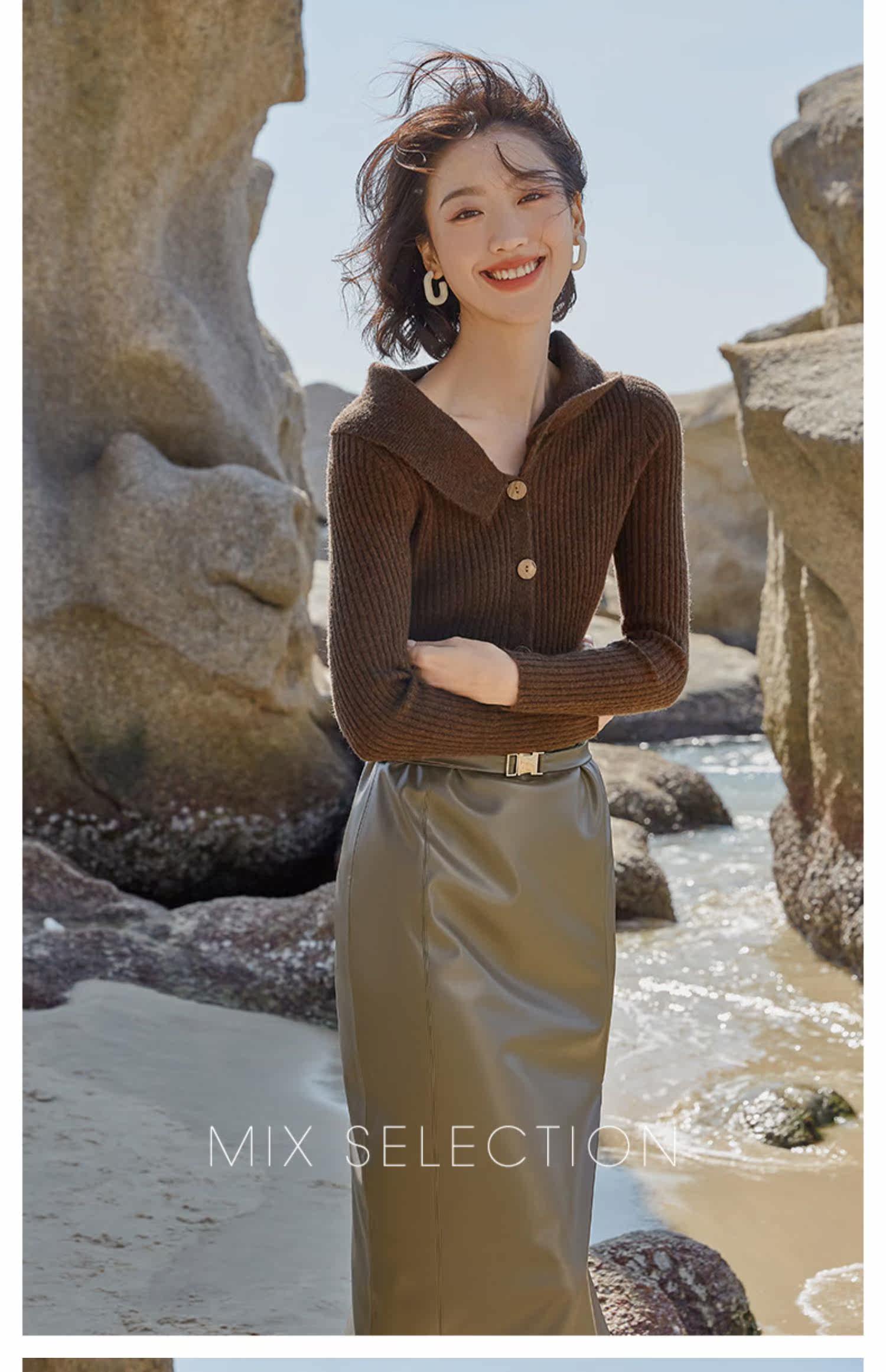 Выбор смешивания | Retro Rettude Lititude Girl Girl Brown Temperament носит свитер