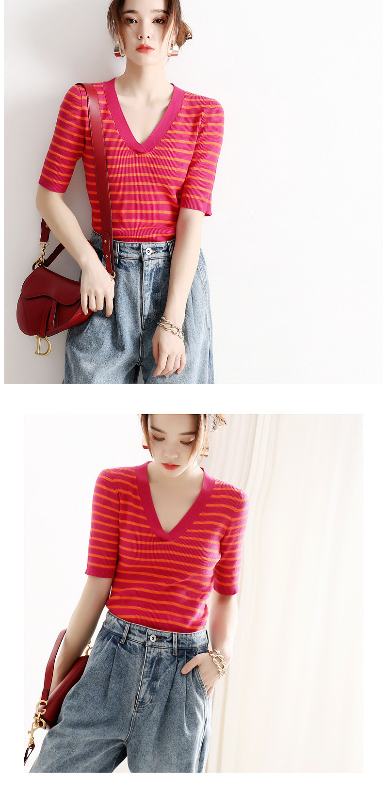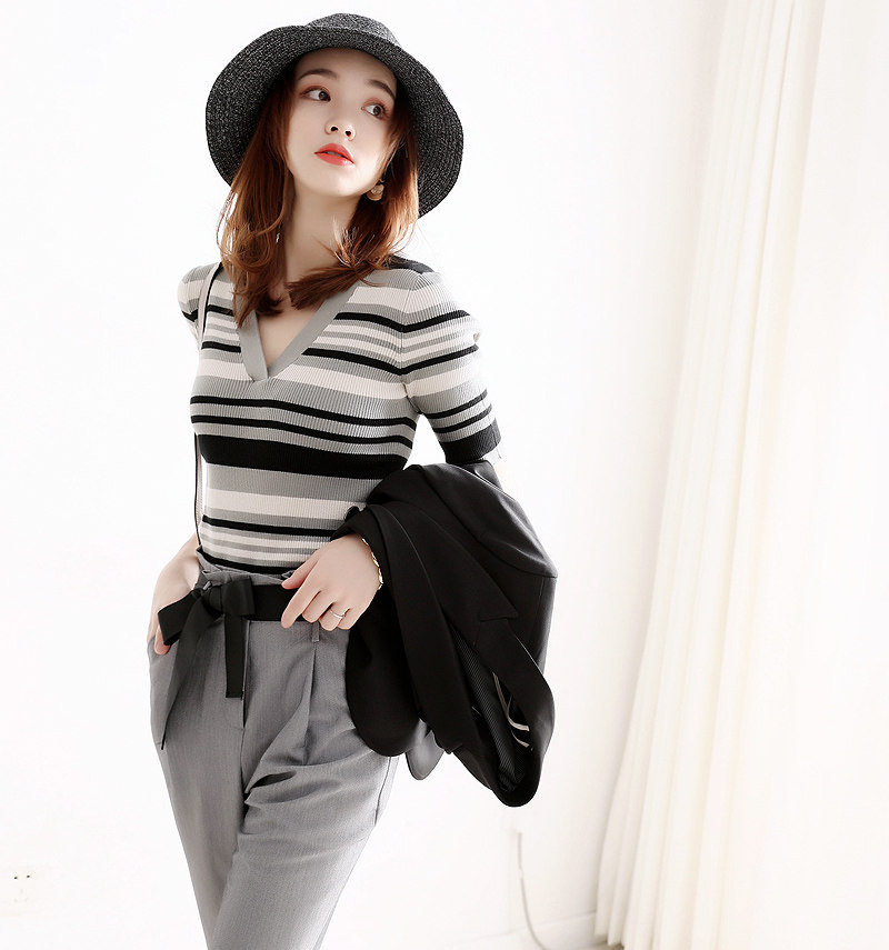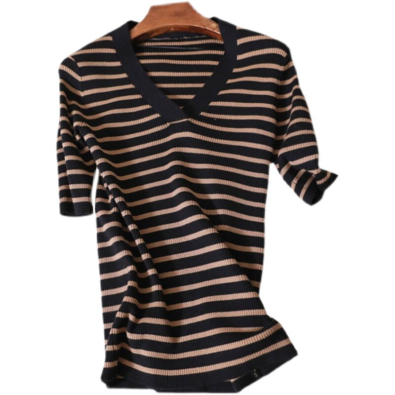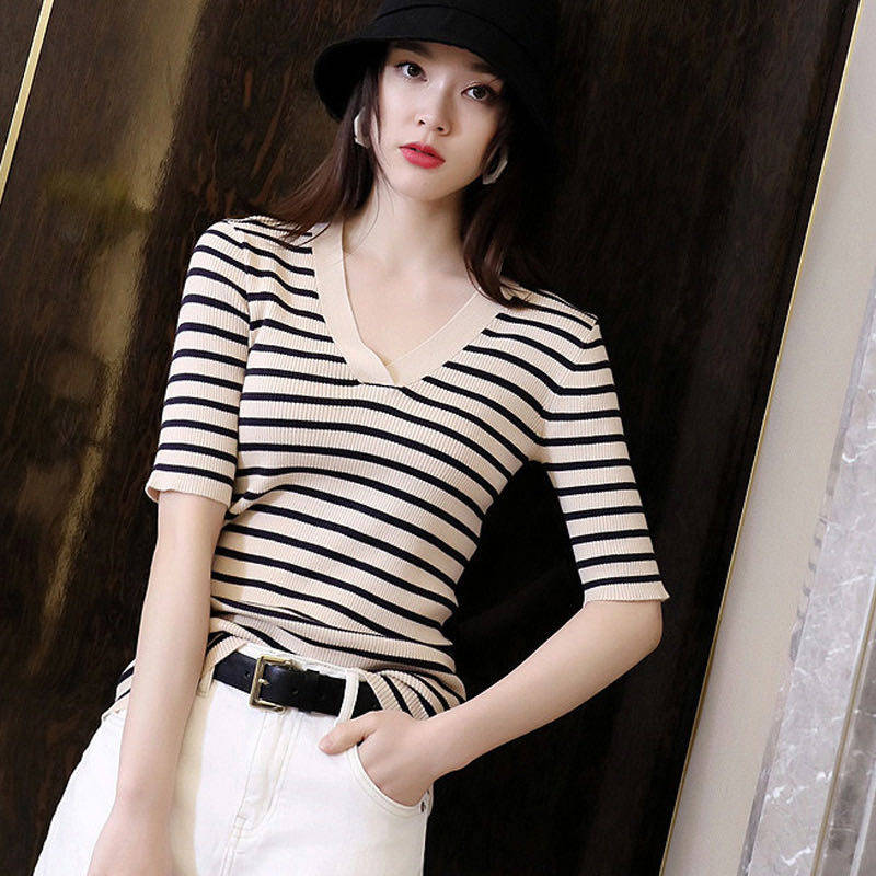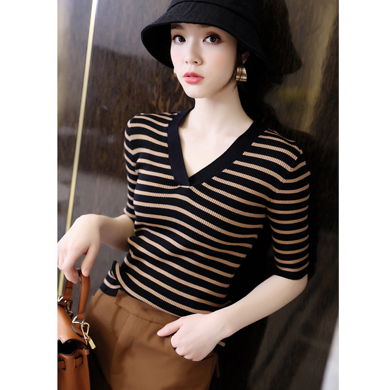 Трикотажный свитер, футболка, французский стиль, облегающий крой, V-образный вырез