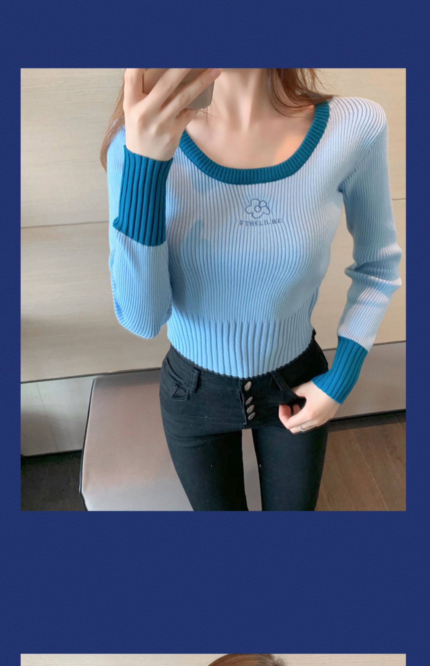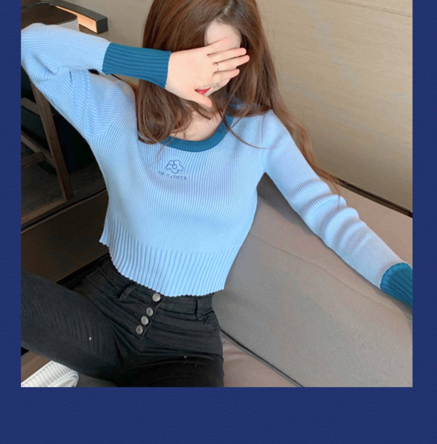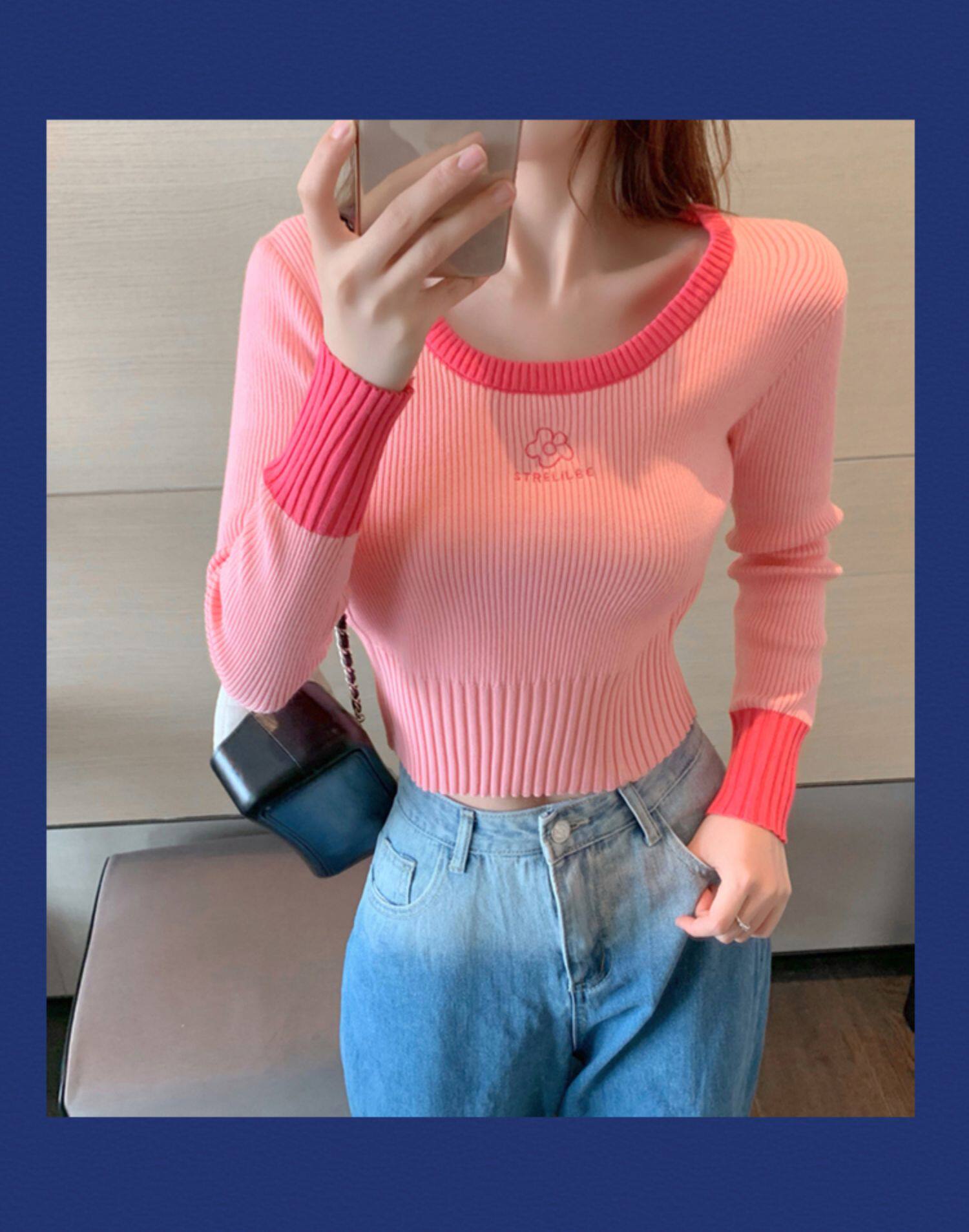 Демисезонный модный свитер, приталенный короткий трикотажный лонгслив, городской стиль, в западном стиле