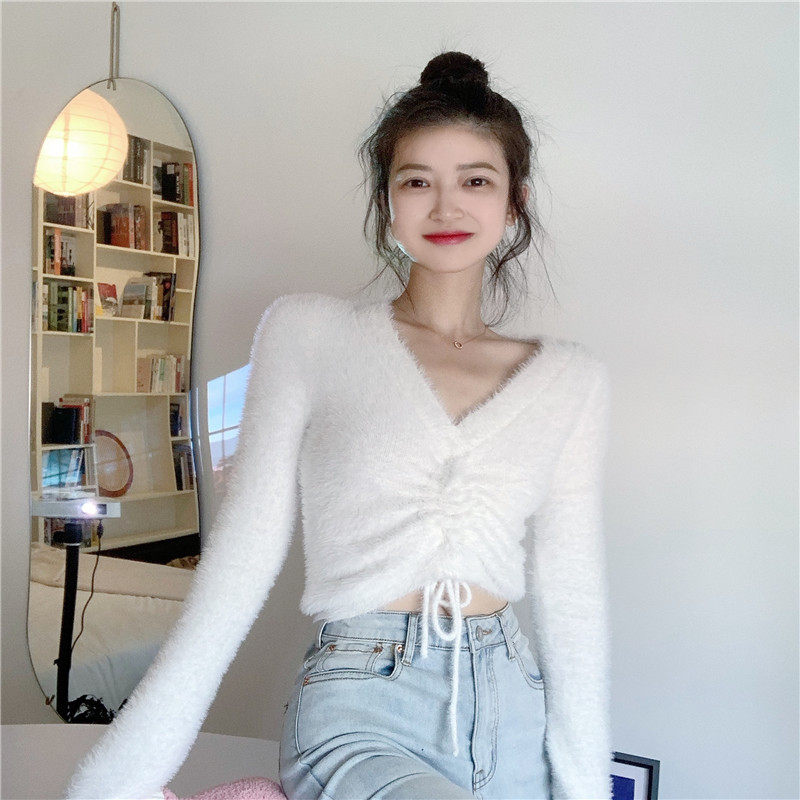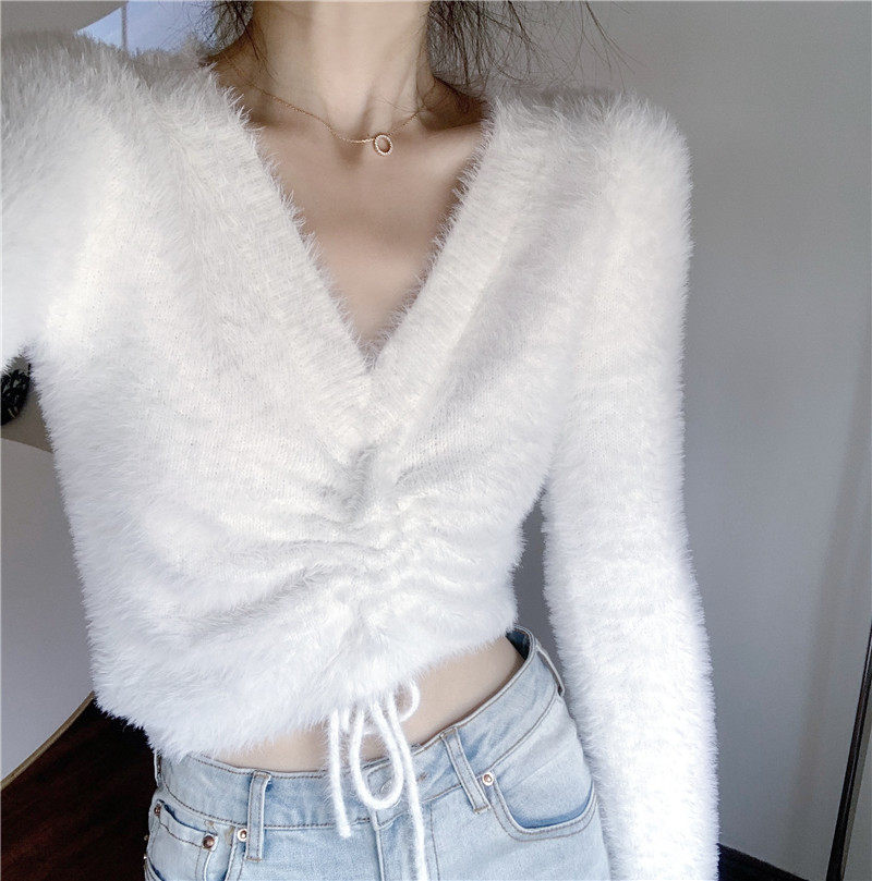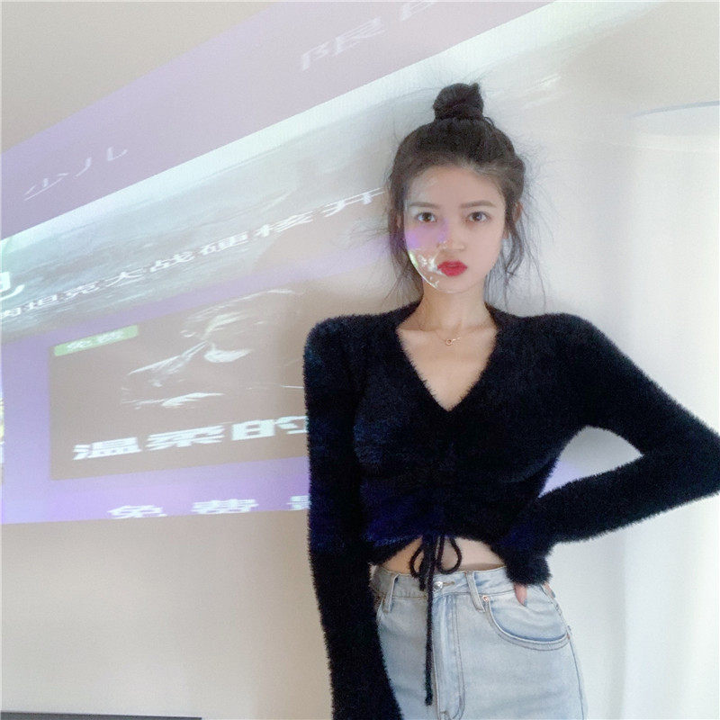 Демисезонный дизайнерский короткий трикотажный свитер, тренд сезона, V-образный вырез, на шнурках, в западном стиле, высокая талия, в обтяжку
