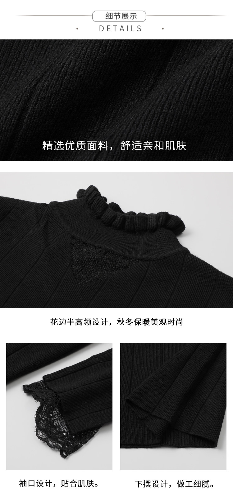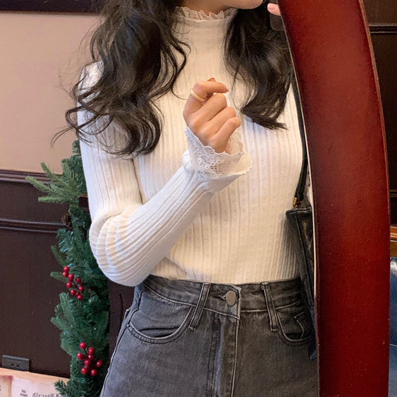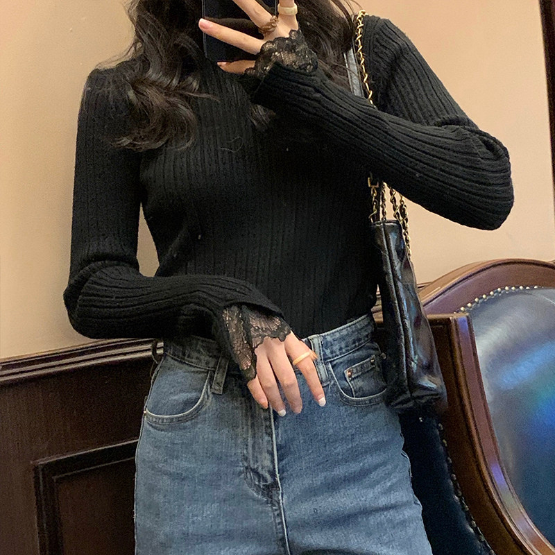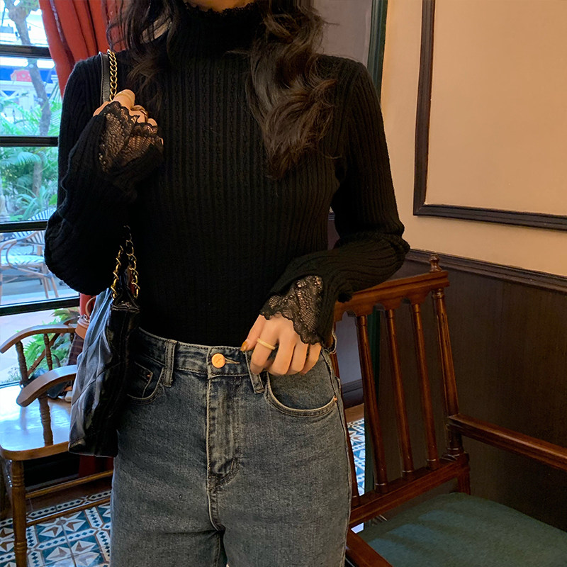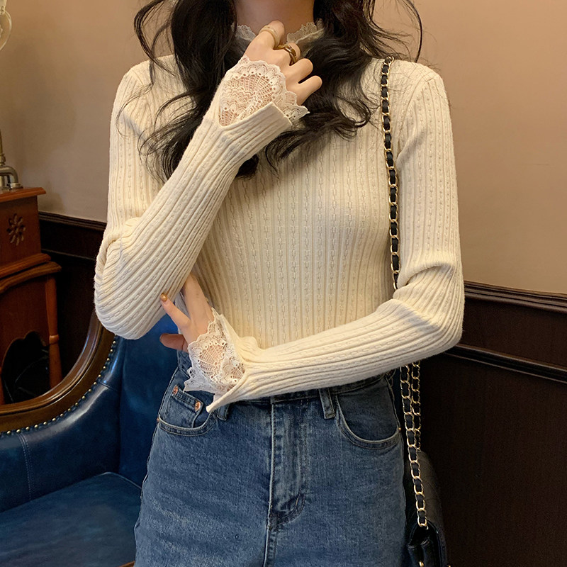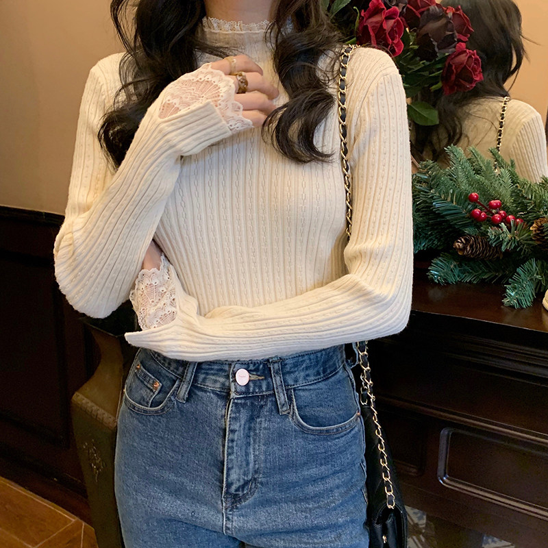 Милый трикотажный кружевной базовый приятный телу весенний дизайнерский свитер, французский стиль, высокий воротник, тренд сезона