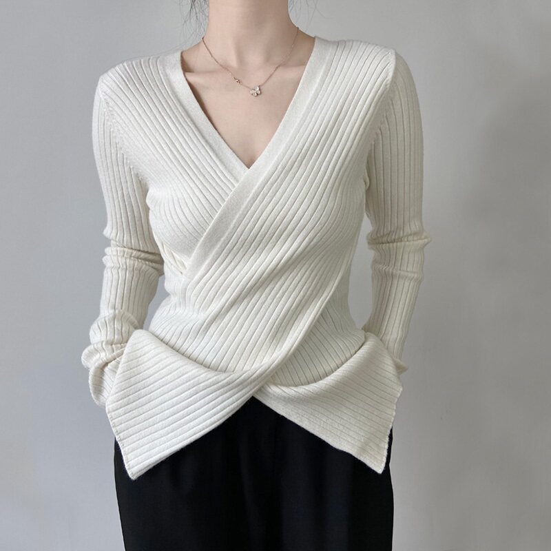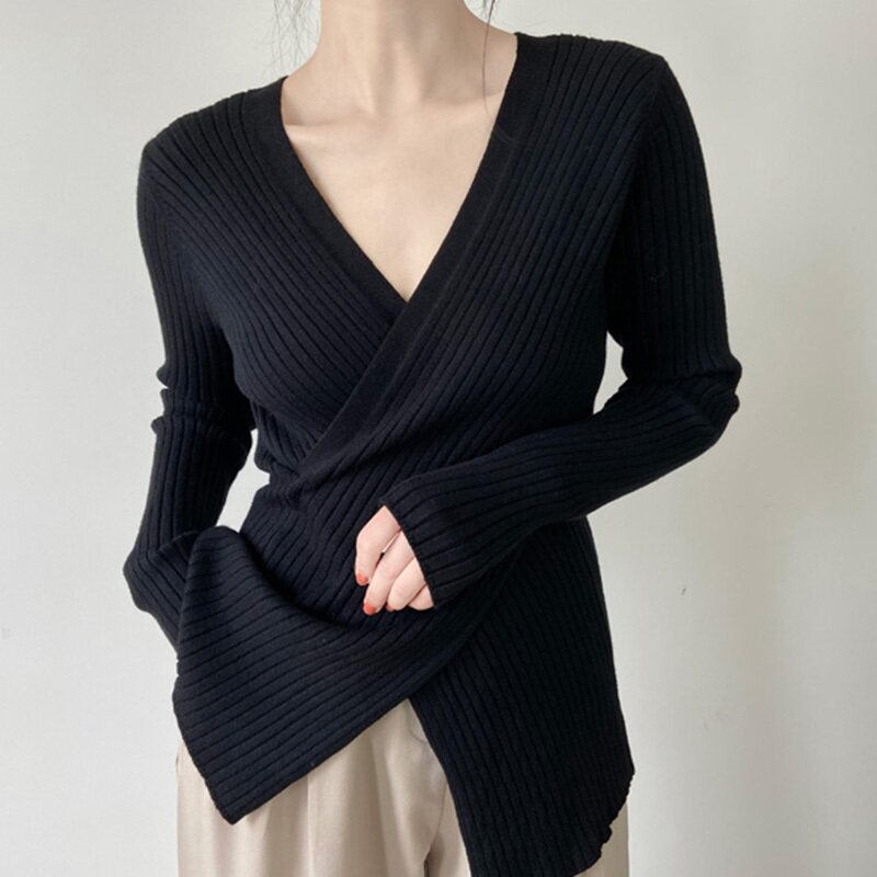 Базовый приятный телу свитер, атмосферный демисезонный трикотажный плащ, V-образный вырез, в западном стиле, французский стиль