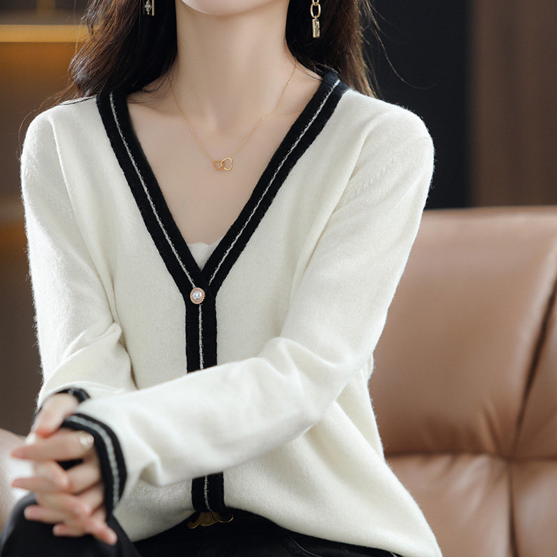 Шерстяной кардиган, куртка, кашемировый свитер, коллекция 2022, в стиле Шанель, V-образный вырез, свободный крой