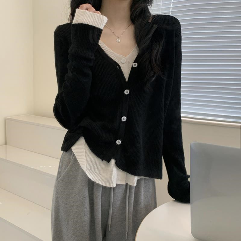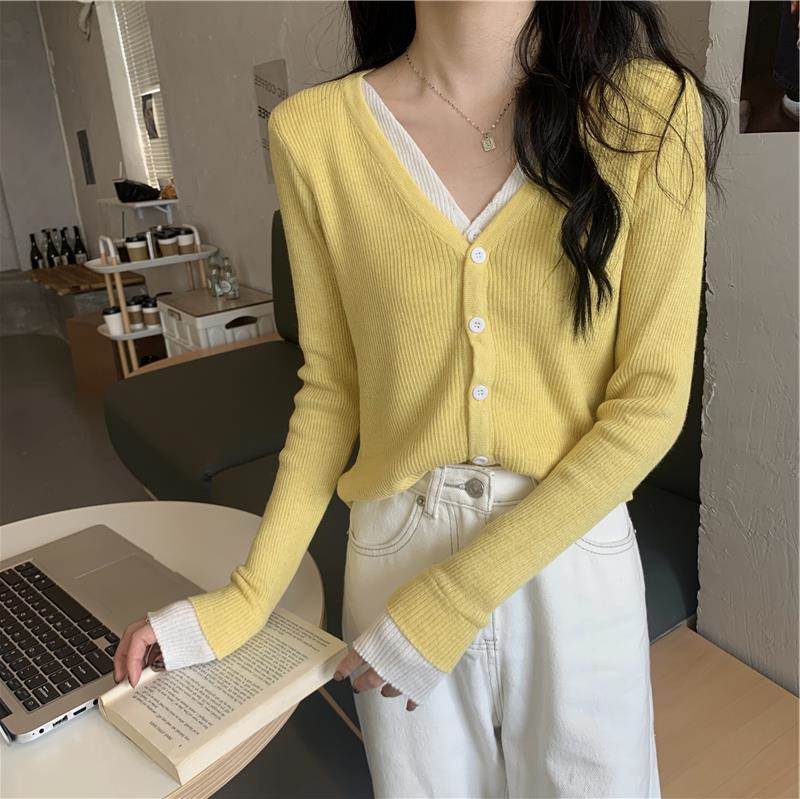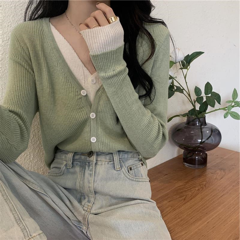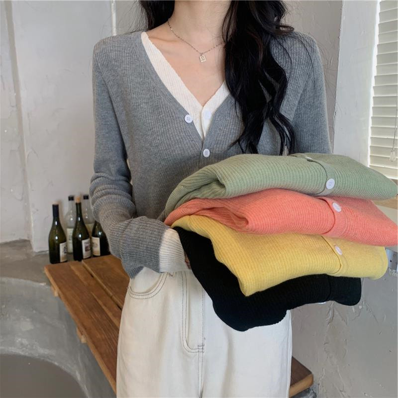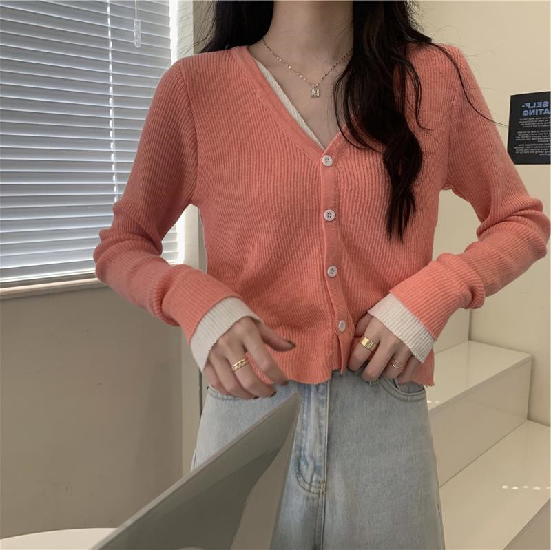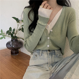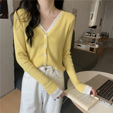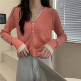 Трикотажный комплект, осенний демисезонный дизайнерский короткий кардиган, в корейском стиле, тренд сезона, V-образный вырез