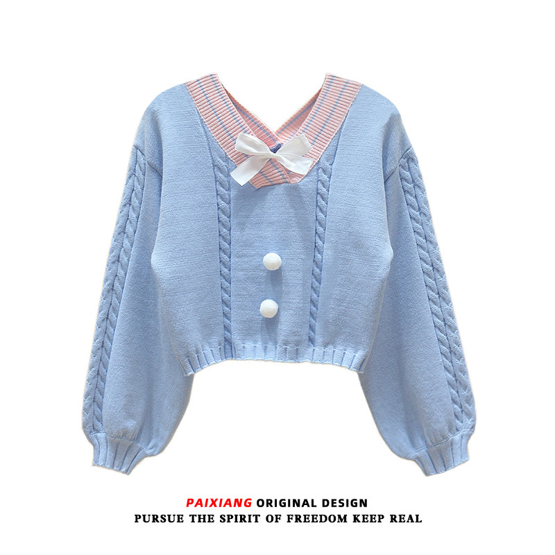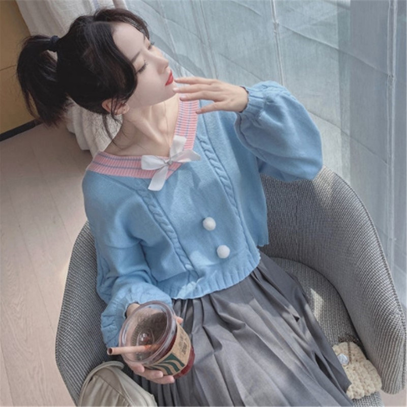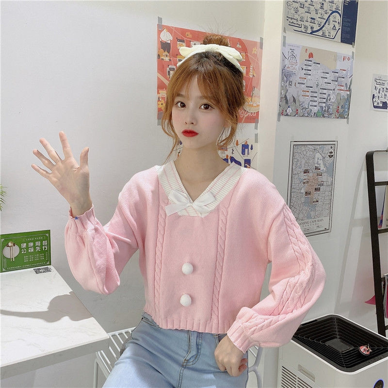 Трикотажный зимний японский милый свитер с бантиком, короткая базовая рубашка, V-образный вырез