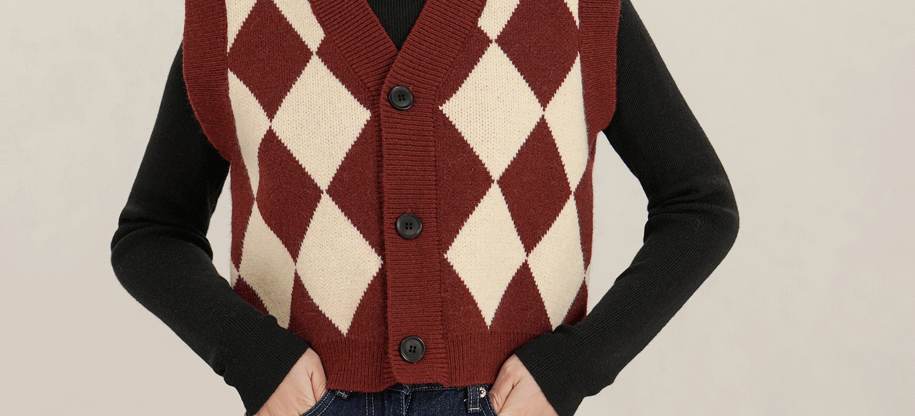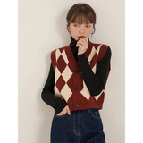 Ретро красный трикотажный демисезонный жилет с ромбовидным узором, майка топ, короткий свитер без рукавов, кардиган, французский стиль, V-образный вырез