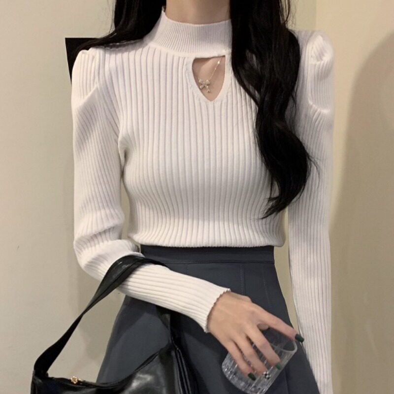 Дизайнерский трикотажный весенний свитер, приятный телу базовый лонгслив, тренд сезона, коллекция 2022, рукава фонарики