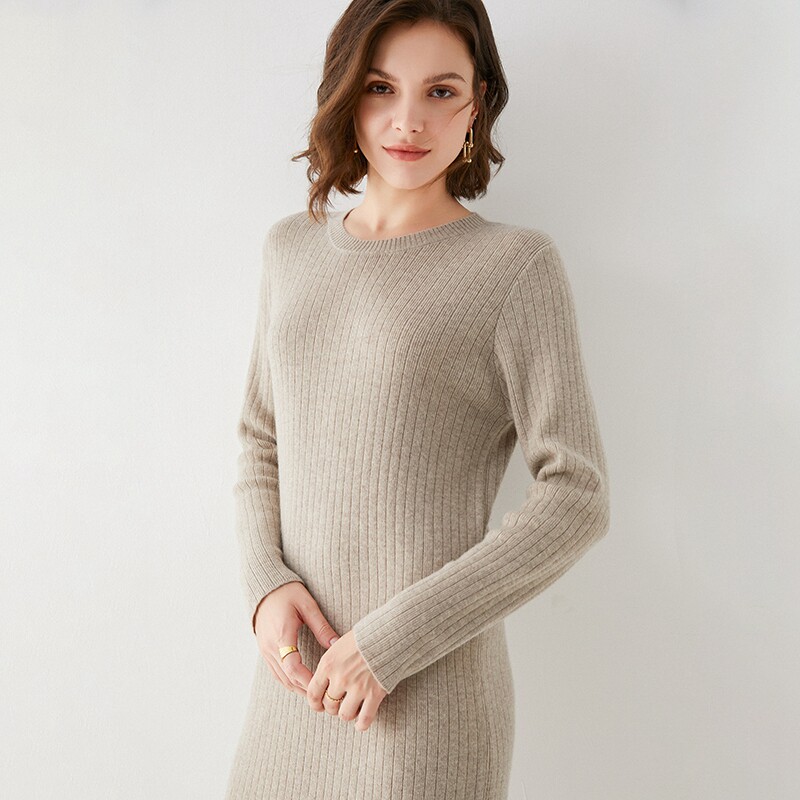 Шерстяной свитер, длинное базовое приталенное кашемировое платье, средней длины