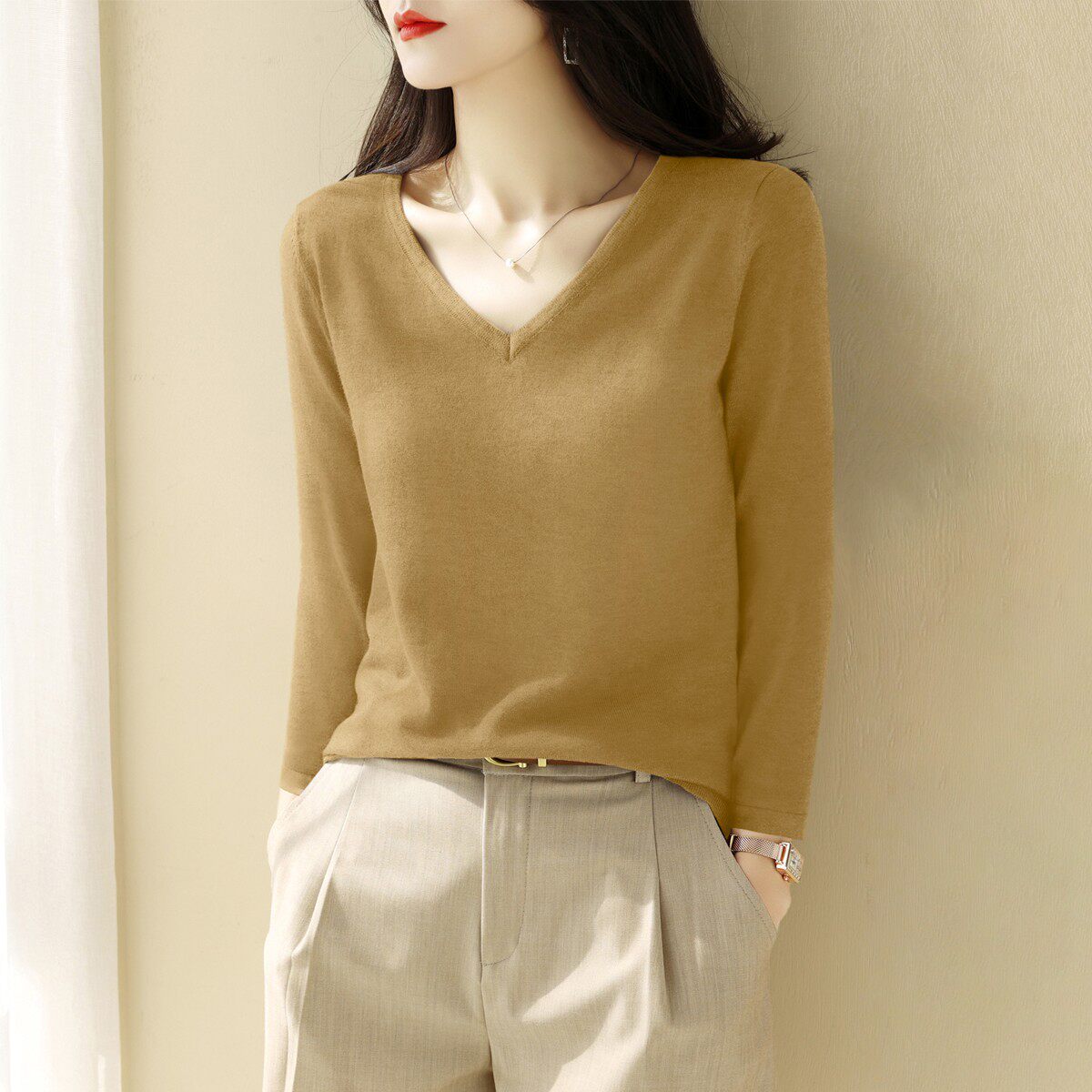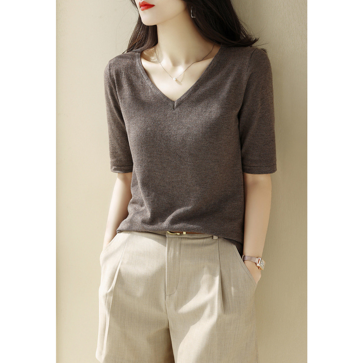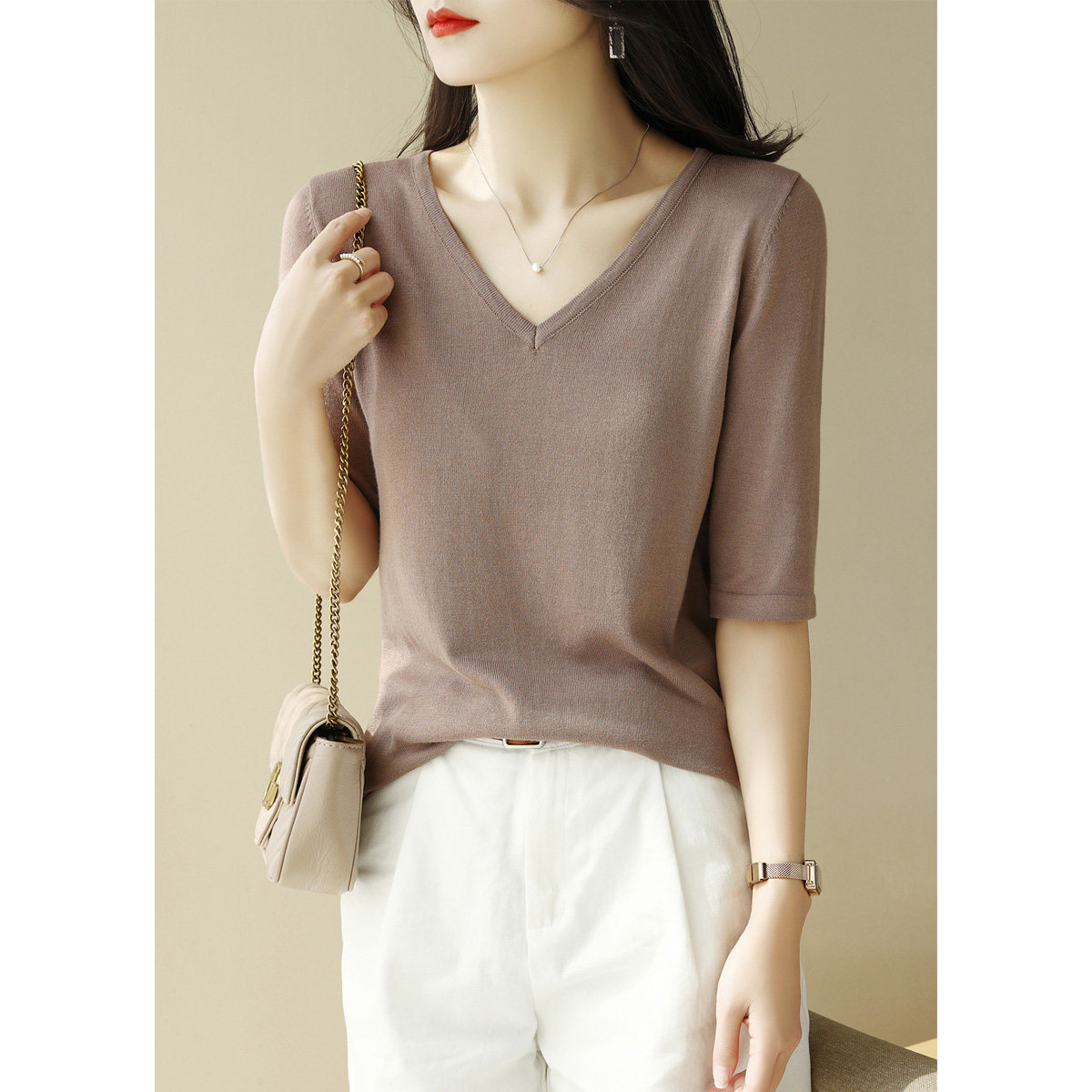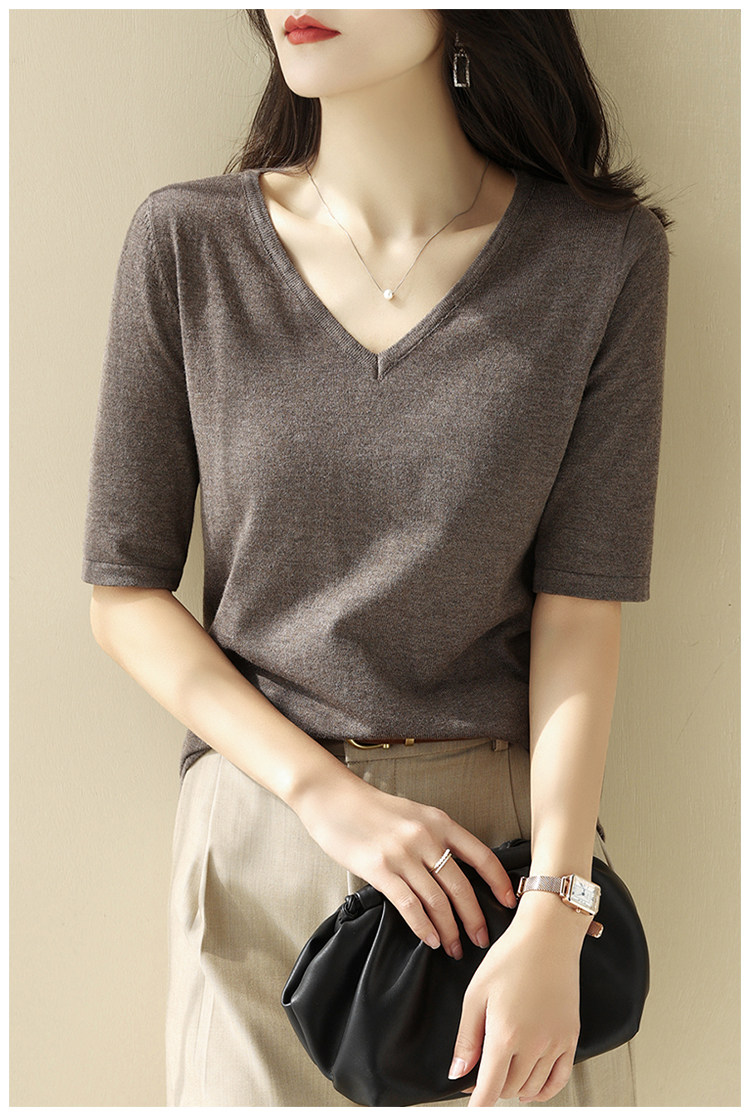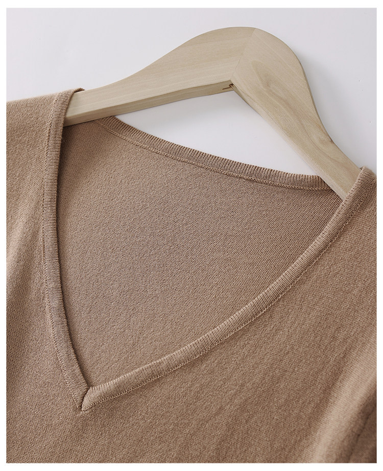 Летний шелковый трикотажный свитер, базовая футболка, V-образный вырез, свободный крой